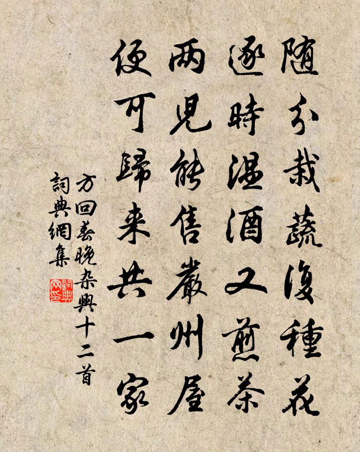 詩詞名句歷史字典書法欣賞書法字典國語詞典說文解字康熙字典古漢語字典標 題 作 者 詩 句 春晚雜興十二首作者:方回 朝代:宋代春晚雜興十二首原文隨分栽蔬複種花,逐時溫酒又煎茶。兩兒能售嚴州屋,便可歸來共一家。詩詞問答問:春晚雜興十二首的作者是誰?答:方回問:春晚雜興十二首寫於哪個朝代?答:宋代方回春晚雜興十二首書法欣賞春晚雜興十二首書法作品詩詞推薦又和寄光山徐員外徐鉉〔唐代〕早年南國日追隨,冠劍日熒佩陸離。匪石心誠徒自許,浮雲蹤跡信難知。官閒從飲扶頭酒,地僻誰同敵手棋。門館思歸鳥左右掩作文同〔宋代〕峽中足啼鳥,醆鄒不可會。其道思歸者,雄鳴即雌對。前壑雲漸起,後山月已背。行人畏聞汝,一聲一心碎。寄衛太常二首蘇泂〔宋代〕祖世多生契,門牆半面人。若為資巨岳,不敢望洪鈞。千載今如此,諸公跡易陳。江河須到海,松柏不勝春。答余洪範二首黃庭堅〔宋代〕懸磬齋廚數米炊,貧中氣味更相思。可無昨日黃花酒,又是春風柳絮時。道傍木唐備〔唐代〕狂風拔倒樹,樹倒根已露。上有數枝藤,青青猶未悟。和梅摯北池十詠蔣堂〔宋代〕池上有修竹,遙聞手自栽。幾因風韻響,時感隼旟來。粉籜經梅脫,虬根遇石回。嬋娟綠陰下,小閣為誰開。即事喻鳧〔唐代〕抱杖立溪口,迎秋看塞門。連山互蒼翠,二水各清渾。笛發孤煙戍,鴉歸夕照村。萋萋芳草色,終是憶王孫。採桑子·恨君不似江樓呂本中〔宋代〕恨君不似江樓月,南北東西,南北東西,只有相隨無別離。恨君卻似江樓月,暫滿還虧,暫滿還虧,待得團圓是幾初秋普明寺竹林小飲餞梅聖俞分韻得亭皋木葉歐陽修〔宋代〕山水日已佳,登臨同上下。衰蘭尚可采,欲贈離居者。次趙都使心田壽哉韻楊公遠〔宋代〕非園非圃亦非坰,寸地無多好力耕。豈藉鋤犁開曠盪,但除塵垢自和平。雲收月掛天長淨,水止風恬浪不生。壽域謁金門(秋晚□蕙花為賦)黃機〔宋代〕秋向晚。秋晚蕙根猶暖。碧染羅裙湘水淺。羞紅微到臉。窣窣繡簾圍遍。月薄霜明庭院。妝罷寶奩慵不掩。無風香哭待制許先生員興宗〔宋代〕平生一靈台,機智得深屏。出使星移天,歸朝月生嶺。上書肺肝露,不事頰舌逞。事狀嚴歷歷,九原忽甦醒。三月二十七日自撫州往南城縣舟行見拂水薔薇因有是作韓偓〔唐代〕江中春雨波浪肥,石上野花枝葉瘦。枝低波高如有情,浪去枝留如力斗。綠刺紅房戰褭時,吳娃越艷醺酣後。且將送竇僉判同年文同〔宋代〕冰霜滿清漢,此地送君歸。天涯作遠別,懷抱殊依依。短亭臨灙水,楊柳長條稀。道傍有寒梅,幽香撲人衣。折以答王郎中韋應物〔唐代〕臥閣枉芳藻,覽旨悵秋晨。守郡猶羈寓,無以慰嘉賓。野曠歸雲盡,天清曉露新。池荷涼已至,窗梧落漸頻。風物鷺釋行海〔宋代〕來往長江點翠屏,江風裊裊頂絲輕。有時拳足蘆花畔,魚在蘆花影里行。過巴峽釋希晝〔宋代〕遠望知無極,窮秋日向殘。孤泉瀉空白,眾木倚雲寒。靜想猿啼苦,危聞客過難。寸心寧可寄,前去雪漫漫。世事二首趙善括〔宋代〕我貧非道病,生計恝然疏。數畝田常旱,一溪雲有餘。幸無貧外樂,贏得靜中虛。已斷聲華念,臨深肯羨魚。偈頌一百二十三首釋普度〔宋代〕用鈯斧子,非重非輕。拈起放下,肘後符靈。中秋李漕冰壺燕集戴復古〔宋代〕諸亭環立一湖灣,區界無多眼界寬。蒼石傳為偽劉物,綠波曾浴葛仙丹。兩邊堤樹四時碧,一片冰壺六月寒。咫尺名句推薦雪中何以贈君別,惟有青青松樹枝。岑參《天山雪歌送蕭治歸京》 長夏村墟風日清,檐牙燕雀已生成。張耒《夏日三首·其一》 德不孤,必有鄰。孔子弟子《論語·里仁篇》 雲拼欲下星斗動,天樂一聲肌骨寒。劉禹錫《八月十五夜桃源玩月》 公生明,偏生暗荀子《荀子·不苟》 一字無題外,落葉都愁。張炎《八聲甘州·記玉關踏雪事清游》 兩處春光同日盡,居人思客客思家。白居易《望驛台》 念蘭堂紅燭,心長焰短,向人垂淚。晏殊《撼庭秋·別來音信千里》 余凡事喜獨出己見,不屑隨人是非。沈復《浮生六記·浪遊記快》 群臣見素,則大君不蔽矣。韓非及後人《韓非子·二柄》
