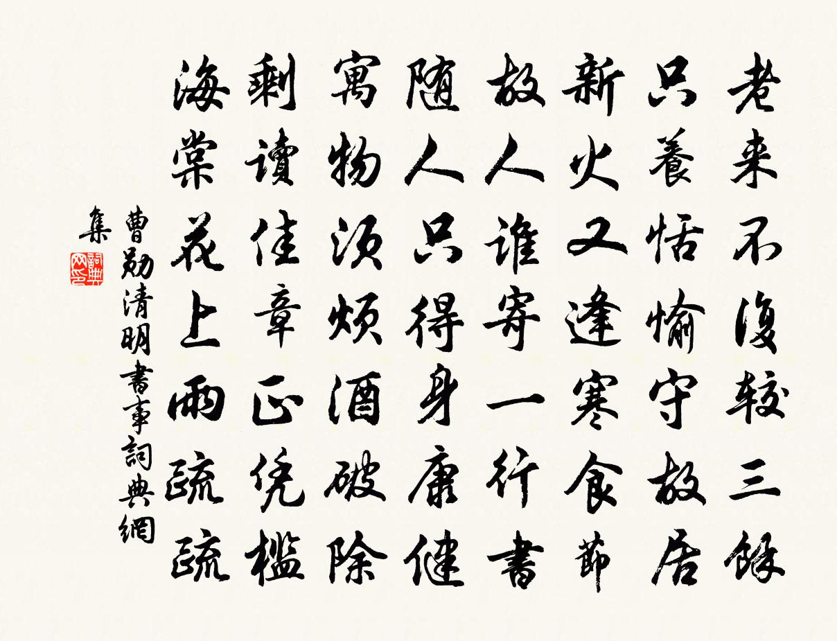 詩詞名句歷史字典書法欣賞書法字典國語詞典說文解字康熙字典古漢語字典標 題 作 者 詩 句 清明書事作者:曹勛 朝代:宋代清明書事原文老來不復較三餘,只養恬愉守故居。新火又逢寒食節,故人誰寄一行書。隨人只得身康健,寓物須煩酒破除。剩讀佳章正憑檻,海棠花上雨疏疏。詩詞問答問:清明書事的作者是誰?答:曹勛問:清明書事寫於哪個朝代?答:宋代曹勛清明書事書法欣賞清明書事書法作品詩詞推薦乞食陶淵明〔魏晉〕飢來驅我去,不知竟何之。行行至斯里,叩門拙言辭。主人解余意,遺贈豈虛來。談諧終日夕,觴至輒傾杯。情欣頌十玄談一色釋印肅〔宋代〕行人到此盡蹉跎,一指頭端不奈何。毫髮有差千萬里,溈山撫掌笑呵呵。王將軍墓張玉孃〔宋代〕嶺上松如旗,抉收欠石姿。下有烈乾魂,上有青菟絲。烈士節不改,青松色愈滋。欲識烈士心,千里相思共明月。道邊松曾豐〔宋代〕撼雨號風太古音,道中豈作買臣吟。火雲蒸雨無逃處,乞與行人數畝陰。又即事二章上呈司馬光〔宋代〕覺後追思氣味長,歡情愁緒兩俱忘。近來方得醉中趣,熟寐沈沈是醉鄉。忠烈侯酷好山水作葬書以行於世元翁其族子傳黎廷瑞〔宋代〕英英太極翁,器明吳楚甲。馳輅使沙漠,杖鉞帥巴峽。南瞻嶺表縮,東睨溟漲狹。林居念環轍,簡脫卑藏筴。夫君句鄭清之〔宋代〕他年蒙渥澤,方玉帶圍赬。喜遷鶯令(呈富樞)張元乾〔宋代〕雲葉亂,月華光。羅幕卷新涼。玉醅初泛嫩鵝黃。花露滴秋香。地行仙,天上相。風度世間人樣。懸知洗盞徑開嘗鶗鴂吟劉禹錫〔唐代〕朝陽有鳴鳳,不聞千萬祀。鶗鴂催眾芳,晨間先入耳。秋風白露晞,從是爾啼時。如何上春日,唧唧滿庭飛。戲書宋子才止足堂司馬光〔宋代〕舉世戀榮祿,夜行無乃勞。獨君年未至,止足一何高。矮制烏紗帽,寬裁白氎袍。華榱坐終日,閒按紫檀槽。游野航次元應韻三首李流謙〔宋代〕平地坐我帆檣中,翠峰出沒工為容。輕鷗舞晴水照影,蒼蛟吼浪雪薄胸。漁舠系月江一曲,樵斧斫雪山幾重。詩翁曉從任大夫祖行過石橋寄粹甫黃庭堅〔宋代〕令尹鳴騶過石橋,想君寒夢正飄搖。追思轉覺年來劇,亂似春風柳萬條。淵明祠顧祿〔宋代〕黃閣彤扉盡宋臣,歸來松菊伴閒身。舉頭誰識悠然意,只有南山是故人。文宣王及其弟子贊宋高宗〔宋代〕侁侁申周,四科與儔。逸駕文圃,鼓枻儒流。冠佩既燕,言動允休。邵陵得封,可想清修。檢校塢中方岳〔宋代〕檢校平生瓜芋區,鋤雲荷月盡堪娛。山中鶴帳依然在,天下魚羹何處無。古蘚蒼崖松老大,夕陽黃犢草荒蕪。縱無贈楊仲開畫圖引王冕〔元代〕楊君綽有隱者風,須長骨瘦兩耳聾。作詩作畫不作意,造化不與常人同。前年眼健腕有力,捉得老龍歸雪壁。墨雨隱居李新〔宋代〕伯鸞翠構元臨市,靖節幽居聞近朝。事過自余安水石,客忙何至走漁樵。價高少室仍休問,徑捷終南更易招。嶺上送劉秀才歸江陵杜牧〔唐代〕彩服鮮華覲渚宮,鱸魚新熟別江東。劉郎浦夜侵船月,宋玉亭春弄袖風。落落精神終有立,飄飄才思杳無窮。誰人和吳子華侍郎令狐昭化舍人嘆白菊衰謝之絕次用本韻韓偓〔唐代〕正憐香雪披千片,忽訝殘霞覆一叢。還似妖姬長年後,酒酣雙臉卻微紅。亭前柳朱雍〔宋代〕佇立東風裡,放縴手、淨試梅妝。眉暈輕輕畫,遠山長。添新恨,更淒涼。嘗憶得、驛亭人別後,尋春去、儘是幽名句推薦今夜鄜州月,閨中只獨看。杜甫《月夜》 聖人之行不同也,或遠或近,或去或不去,歸潔其身而已矣。孟子《孟子·萬章章句上·第七節》 兵不完利,與無操者同實管仲《管子·參患》 求備之心,可用之以修身,不可用之心接物王永彬《圍爐夜話·第一五九則》 繞遍迴廊還獨坐。月籠雲暗重門鎖。蘇軾《蝶戀花·雨霰疏疏經潑火》 勝概日相與,思君心鬱陶。岑參《鞏北秋興寄崔明允》 不覺碧山暮,秋雲暗幾重。李白《聽蜀僧濬彈琴 / 聽蜀僧浚彈琴》 從善如登,從惡如崩司馬光《資治通鑑·魏紀·魏紀三》 儒者在本朝則美政,在下位則美俗。荀子《荀子·儒效》 但去莫復問,白雲無盡時。王維《送別》