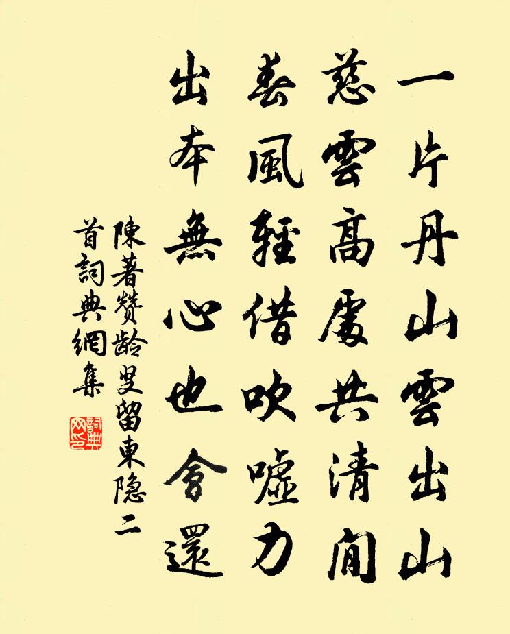 詩詞名句歷史字典書法欣賞書法字典國語詞典說文解字康熙字典古漢語字典標 題 作 者 詩 句 贊齡叟留東隱二首作者:陳著 朝代:宋代贊齡叟留東隱二首原文一片丹山雲出山,慈雲高處共清閒。春風輕借吹噓力,出本無心也會還。詩詞問答問:贊齡叟留東隱二首的作者是誰?答:陳著問:贊齡叟留東隱二首寫於哪個朝代?答:宋代陳著贊齡叟留東隱二首書法欣賞贊齡叟留東隱二首書法作品詩詞推薦陳學正惠詩酬以長句陳造〔宋代〕寒風折人粟生膚,局坐掩戶孰與娛。吾宗高義駕為迂,新詩爛粲慰槁枯。一百十二驪龍珠,春意誰遣生座隅。吾宗大慈交師演古軒文同〔宋代〕萬法一軒中,周回百座容。曲燃薝蔔久,橫揭貝多重。信士供晨缽,門人集午鍾。何時聽雄辨,幾柄換庭松。望海潮劉一止〔宋代〕垂楊深院,啼鶯清晝,東風細繞檐牙。野色亂春,嬌雲捧日,燕翻蝶舞交加。溫詔下天涯。早畫船飛楫,疊鼓鳴撾古辭鮑照〔南北朝〕容華不待年。何為客游梁。九月寒陰合。悲風斷君腸。嘆息空房婦。幽思坐自傷。勞心結遠路。惆悵獨未央。落第東歸羅鄴〔唐代〕年年春色獨懷羞,強向東歸懶舉頭。莫道還家便容易,人間多少事堪愁。學仙二首許渾〔唐代〕漢武迎仙紫禁秋,玉笙瑤瑟祀昆丘。年年望斷無訊息,空閉重城十二樓。心期仙訣意無窮,采畫雲車起壽宮。聞有桂林懷李景魏樂雷發〔宋代〕陽華萬疊雲,無計得相尋。所學皆時好,何人知爾心。莎城百粵遠,雪嶠一翁吟。已中懷人極,天寒奈水深。除夜宿石頭驛(一作石橋館)戴叔倫〔唐代〕旅館誰相問,寒燈獨可親。一年將盡夜,萬里未歸人。寥落悲前事,支離笑此身。愁顏與衰鬢,明日又逢春。後圖即事三首邵雍〔宋代〕天養疏慵自有方,洛城分得水雲鄉。不聞世上風波險,但見壺中日月長。一局閒棋留野客,數杯醇酒面脩篁。物情賀家湖陳庚生〔宋代〕風流誰似賀知章,乞得平湖任草荒。今日藕花三百畝,折來依舊屬君莊。葛仙翁煉丹石方信孺〔宋代〕見說刀圭已解仙,寧須丹灶半人間。葛翁本是求勾漏,何意南來訪此山。上雲樂陸龜蒙〔唐代〕青絲作筰桂為船,白兔搗藥蝦蟆丸。便浮天漢泊星渚,回首笑君承露盤。宮詞張公庠〔宋代〕楊花飛去落誰家,紫禁人閒惜歲華。謾向園林覓春色,折殘枝上兩三花。清平樂·宮怨黃升〔宋代〕珠簾寂寂。愁背銀缸泣。記得少年初選入。三十六宮第一。當年掌上承恩。而今冷落長門。又是羊車過也,月明花閒極晁說之〔宋代〕閒極忘羇旅,秋色為我深。牛臥樹外影,雞鳴堂中心。自言身已隱,人道尚官箴。明趨傍海郡,適我梁甫吟。山甫病中歸峽作此問之舒岳祥〔宋代〕山甫病歸峽,僧言藥有瘳。自憐三歲長,多白幾分頭。水鳥工吟夜,陰蛩苦話秋。詩人多病瘧,強飯更何憂。阮郎歸邵亨貞〔元代〕茂陵多病不勝秋。多情還倚樓。隔江何處泊離舟。有人歌遠遊。清興在,此生浮。老來長是愁。西風吹夢白萍洲。南郊大禮慶成詩五首右有事於南郊蘇頌〔宋代〕惟皇繼天,宅位三禩。靈德及遠,嘉生茂遂。仲冬月良,一陽氣至。上將告成,禮嚴肆類。自廟徂郊,萬靈拱衛。溧陽道中懷秉文趙蕃〔宋代〕不見水南梅,春風已四回。縱傳詩滿紙,何似酒同杯。已與修塗背,還尋舊路來。計期猶促近,到處勿徘徊。鶯鶯詩(一作離思詩之首篇)元稹〔唐代〕殷紅淺碧舊衣裳,取次梳頭暗淡妝。夜合帶煙籠曉日,牡丹經雨泣殘陽。低迷隱笑原非笑,散漫清香不似香。頻動名句推薦東風楊柳欲青青。煙淡雨初晴。晏殊《訴衷情·東風楊柳欲青青》 深澗飲渴虹,邃河生秋雷。惟鳳《姑射山詩題曾山人壁》 鳥下綠蕪秦苑夕,蟬鳴黃葉漢宮秋。許渾《鹹陽城東樓 / 鹹陽城西樓晚眺 / 西門》 恩威同施,才德相較,苟無功,得無天耶?來俊臣《羅織經·治下卷第三》 此地一為別,孤蓬萬里征。李白《送友人》 泉眼無聲惜細流,樹陰照水愛晴柔楊萬里《小池》 花漸凋疏不耐風,畫簾垂地晚重工,墮階縈蘚舞愁紅孫光憲《浣溪沙·花漸凋疏不耐風》 教子弟於幼時,便當有正大光明氣象;檢身心於平日,不可無憂勤惕厲工夫。王永彬《圍爐夜話·第一則》 夜闌更秉燭,相對如夢寐杜甫《羌村》 空山新雨後,天氣晚來秋。王維《山居秋暝》