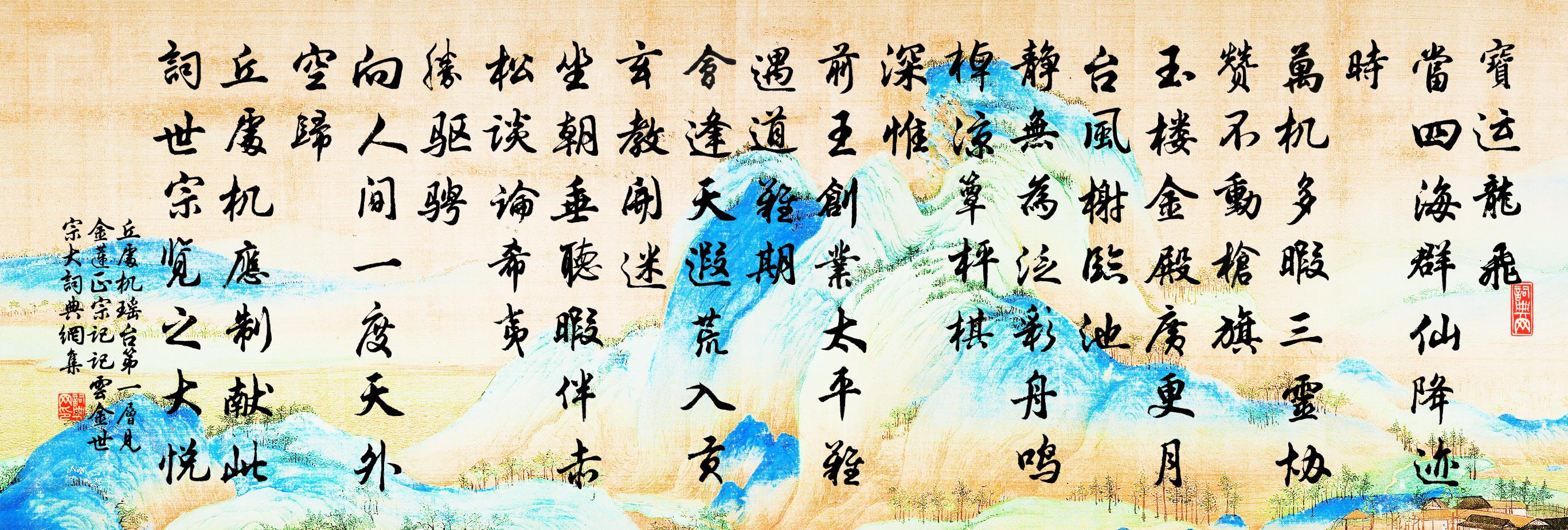 詩詞名句歷史字典書法欣賞書法字典國語詞典說文解字康熙字典古漢語字典標 題 作 者 詩 句 瑤台第一層 見金蓮正宗記。記雲,金世宗大作者:丘處機 朝代:元代原文寶運龍飛。當四海、群仙降跡時。萬機多暇,三靈協贊,不動槍旗。玉樓金殿廣,更月颱風榭臨池。靜無為,泛彩舟鳴棹,涼簟枰棋。深惟。前王創業,太平難遇道難期。會逢天,遐荒入貢,玄教開迷。坐朝垂聽暇,伴赤松、談論希夷。勝驅騁。向人間一度,天外空歸。丘處機應制獻此詞,世宗覽之,大悅。詩詞問答問:《瑤台第一層 見金蓮正宗記。記雲,金世宗大》的作者是誰?答:丘處機問:該詩寫於哪個朝代?答:元代問:該詩是什麼體裁?答:詞書法欣賞瑤台第一層 見金蓮正宗記。記雲,金世宗大書法作品詩詞推薦祝英台近(邀李季章直院賞玉照堂梅)張鎡〔宋代〕暖風回,芳意動,吹破凍雲凝。春到南湖,檢校舊花徑。手栽一色紅梅,香籠十畝,忍輕負、酒腸詩興。小亭憑。今日非昨日王安石〔宋代〕今日非昨日,昨日已可思。明日異今日,如何能勿悲。當門五六樹,上有蟬鳴枝。朝聽尚壯急,暮聞已衰遲。仰看賢者之孝二百四十首霍去病林同〔宋代〕不早知此體,元來托大人。低頭拜縣吏,誰擬霍將軍。京仲遠尚書為澹然子作二大字樓鑰〔宋代〕濃墨新題付澹然,松坡為子老談天。憑君推我行年看,何日歸耕綿上田。野步至青羊宮偶懷前年嘗劇飲於此陸游〔宋代〕錦官門外曳枯筇,此地天教著放翁。萬事元無工拙處,一官已付有無中。拏雲柏樹瘦蛟立,繞郭江流清鏡空。欲把送劉文潛司業江西漕二首李流謙〔宋代〕始作想澄清,歊暑不敢毒。以茲壽慈母,吾鼎愧半菽。恨我如宛童,失此百圍木。豁然心光動,千里尚相燭。五更枕上黃虛舟〔宋代〕睡覺愁無奈,難禁冬夜長。才聽曉鍾動,又是世人忙。入市船撐月,朝天馬踏霜。布衾綿杲軟,切莫笑尋常。江上范成大〔宋代〕天色無情淡,江聲不斷流。古人愁不盡,留與後人愁!懷寄彭城朋好十首之二張大賀鑄〔宋代〕努力張謀父,躬耕老白雲。無年儉足用,此外奈何君。紹興以後蜡祭四十二首佚名〔宋代〕末耜筆償,自神農氏。稼檣滋殖,為農者始。作配明祀,奠以告虔。萬世佃漁,帝功卓然。病中雜興五言十首劉克莊〔宋代〕柳七葬淮頭,營妓歲瀝酒。不知花翁墳,有人擘紙否。十六觀經頌上品上生觀第十四釋遵式〔宋代〕慈心不殺持眾戒,讀誦大乘方等經。修行六念回向願,臨終化佛悉來迎。唐禪社首樂章。福和佚名〔唐代〕穆穆天子,告成岱宗。大裘如濡,執珽有顒。樂以平志,禮以和容。上帝臨我,雲胡肅邕。贊政黃牛釋法薰〔宋代〕不解倒騎,惟牛所之。郊原平衍,鞭索不施。山黯黯,水漪漪。知我者,白鷺鷥。贈雲山逸人劉巨川瞽而談命家鉉翁〔宋代〕世人具眼知多少,見山不如雲山好。斯人背境自觀心,識破雲山千萬層。須知萬物備於我,高下散殊何往而非道。冰壺亭趙汝譡〔宋代〕孰是群動主,天機在靈關。深居默自照,瑕垢寧得乾。昭昭素絲義,幕佐實郡端。身潔吏所貴,心精士其難。請將過驪山竇鞏〔唐代〕翠輦紅旌去不回,蒼蒼宮樹鎖青苔。有人說得當時事,曾見長生玉殿開。孫希汲出示所和杜允迪二詩因次韻並寄允迪以郭印〔宋代〕草木藏春柳報先,誰將蒼馭快如鞭。夜中一雨知無價,陌上三農慶有年。玉糝寒林梅委地,浪翻平野麥連天。陰陽龍岡歌趙友直〔宋代〕龍兮龍兮何時興,雲行雨施天下平。湫兮湫兮龍之據,龍今去兮留空名。蒼松倒影肖鱗角,根盤石壁徒崚崢。當時頌古二十四首釋勝〔宋代〕鐵餡價難窮,誰知屈味濃。法幢光祖域,正董在胸中。名句推薦命室攜童弱,良日登遠遊陶淵明《酬劉柴桑》 清愁詩酒少,寒食雨風多。張鎡《寒食》 落地為兄弟,何必骨肉親!陶淵明《雜詩》 狂夫之言,聖人擇焉。司馬遷《史記·七十列傳·淮陰侯列傳》 土膏欲動雨頻催,萬草千花一餉開;范成大《春日田園雜興》 君子周而不比,小人比而不周。孔子弟子《論語·為政篇》 堂前撲棗任西鄰,無食無兒一婦人。杜甫《又呈吳郎》 明月幾時有?把酒問青天。蘇軾《水調歌頭·丙辰中秋》 長恨去年今夜雨,灑離亭。晏幾道《愁倚闌令·花陰月》 凡彼禍難也,先者恆凶,後者恆吉。佚名《黃帝四經·十大經·雌雄節》