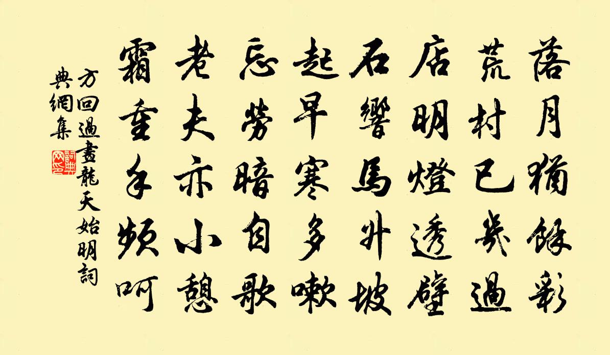 詩詞名句歷史字典書法欣賞書法字典國語詞典說文解字康熙字典古漢語字典標 題 作 者 詩 句 過畫龍天始明作者:方回 朝代:宋代過畫龍天始明原文落月猶余彩,荒村已幾過。店明燈透壁,石響馬升坡。起早寒多嗽,忘勞暗自歌。老夫亦小憩,霜重手頻呵。詩詞問答問:過畫龍天始明的作者是誰?答:方回問:過畫龍天始明寫於哪個朝代?答:宋代方回過畫龍天始明書法欣賞過畫龍天始明書法作品詩詞推薦南唐遣使曾極〔宋代〕談鋒亹亹折強隣,專對當年亦有人。國老胸中兵百萬,不將全力靠江神。離家李若水〔宋代〕曙風入修檐,宿靄度遙嶺。遊子戀庭闈,延此須臾景。臨行懶加衣,上馬晨煙冷。歧路白日忙,氣候清夜永。前途宴戎州楊使君東樓杜甫〔唐代〕勝絕驚身老,情忘發興奇。座從歌妓密,樂任主人為。重碧拈春酒,輕紅擘荔枝。樓高欲愁思,橫笛未休吹。清江引·競功名有如車下坡貫雲石〔元代〕競功名有如車下坡,驚險誰參破?昨日玉堂臣,今日遭殘禍。爭如我避風波走在安樂窩!杜鵑花得紅字真山民〔宋代〕愁鎖色雲往事空,只將遺恨寄芳叢。歸心千古終難白,啼血萬山多是紅。枝帶翠煙深夜月,魂飛錦水舊東風。至今欲別葉茵〔宋代〕欲別哽無語,蘸酒評歸期。潮汐有朝暮,郎心無轉移。寄公異弟梅堯臣〔宋代〕池塘去後春,一夕生綠草。無由夢阿連,詩句何能好。舟中誦陶詩及諸葛傳王遂〔宋代〕扣舷細讀淵明句,出聽還疑是水神。江上只逢名利客,人間無復有斯人。無詩鄭剛中〔宋代〕草創園亭隨意坐,任緣化竹倩人栽。雁聲與客將寒去,柳色知春有信來。逸氣暫時因酒見,物華空自把詩催。案頭巫山一段雲馬鈺〔元代〕洞裡乾刊異,悠然看不窮。虎龍*入白雲中。不見往來*。奼女嬰兒忒*。爭把崑崙頂戴。瓊瑤撞透出靈胎。跨鶴浣溪沙·著酒行行滿袂風姜夔〔宋代〕著酒行行滿袂風。草枯霜鶻落晴空。銷魂都在夕陽中。恨入四弦人慾老,夢尋千驛意難通。當時何似莫匆匆。暮秋枉裴道州手札,率爾遣興,寄近呈蘇渙侍御杜甫〔唐代〕久客多枉友朋書,素書一月凡一束。虛名但蒙寒溫問,泛愛不救溝壑辱。齒落未是無心人,舌存恥作窮途哭。道州武昌懷古宋慶之〔宋代〕極目平蕪送落暉,六朝征戰尚依稀。風生戰舸周郎過,月落南樓庾老歸。秋塞戌閒番馬病,春江流下蜀魚肥。神州宿東岩寺曉起薛瑩〔唐代〕野寺寒塘曉,遊人一夢分。鍾殘數樹月,僧起半岩雲。宿鳥驚初見,幽泉落不聞。吟余憑前檻,紅葉下紛紛。紹興別廟樂歌五首真宗〔宋代〕新廟肅肅,茂事以時。陟降階城,雍容有俠。鞠躬周旋,罔敢不祗。祝史正辭,靈其格思。沁園春(以雨不克登樓,用前韻)李曾伯〔宋代〕麴生來言,素娥寄聲,偶閬苑游。問去年今夕,逢余桂嶺,前年今夕,見子菟裘。何事塵勞,啟人厭倦,痴兔老蟾甲子秋八月丙辰雞初鳴時夢劉韶美示詩八篇高陸游〔宋代〕韶美仙去三十年,一念及之常悵然。秋窗忽夢接顏色,萬里老鶴歸遼天。贈詩溫其似玉瓚,我亦麤識關雎亂。建安洋州三十景灙泉亭鮮于侁〔宋代〕泉聲日琮琤,泉水深浩渺。可愛主人心,亭中狎鷗鳥。道中遇雨高斯得〔宋代〕車中書鑒書罷,書舉頭失青書山。五百書無纖雲,春晴固應慳。須臾驟雨過,忽已羅青鬟。天公自知我,所遇無不次韻孔四著作北行滹沱黃庭堅〔宋代〕駝褐蒙風霜,雞聲眇墟里。青燈進豆粥,落月踏冰水。平生不龜藥,才可衛十指。持比千戶封,誰能優劣此。名句推薦遊子春衫已試單,桃花飛盡野梅酸。吳濤《絕句·遊子春衫已試單》 妙極生知,睿哲惟宰。精理為文,秀氣成采。劉勰《文心雕龍·徵聖》 只解沙場為國死,何須馬革裹屍還。徐錫麟《出塞》 少無適俗韻,性本愛丘山。陶淵明《歸園田居·其一》 都緣自有離恨,故畫作遠山長。歐陽修《訴衷情·眉意》 綠竹入幽徑,青蘿拂行衣。李白《下終南山過斛斯山人宿置酒》 烽火照西京,心中自不平。楊炯《從軍行》 集韻增廣,多見多聞。佚名《增廣賢文·上集》 人有不為也,而後可以有為。孟子《孟子·離婁章句下·第八節》 山遠近,路橫斜,青旗沽酒有人家。辛棄疾《鷓鴣天·陌上柔桑破嫩芽》