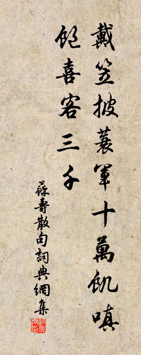 詩詞名句歷史字典書法欣賞書法字典國語詞典說文解字康熙字典古漢語字典標 題 作 者 詩 句 句作者:蘇壽 朝代:宋代句原文戴笠披蓑軍十萬,飢嗔飽喜客三千。詩詞問答問:句的作者是誰?答:蘇壽問:句寫於哪個朝代?答:宋代蘇壽句書法欣賞句書法作品詩詞推薦金陵羅公升〔宋代〕江左諸人未易輕,馳驅猶欲致中興。後人只說清談誤,並與清談已不能。題雪霽望弁山圖錢選〔宋代〕眼前觸物動成冰,凍筆頻枯字不成。獨坐火爐煨酒吃,細聽撲簌打窗聲。溪亭夜吟胡仲弓〔宋代〕系纜堤邊江水平,負來細細襲衣輕。淡煙幾抹沙痕暗,新月一鉤天際明。錦繡圍中搜野趣,笙歌叢里和吟聲。酒闌鸚鵡張祜〔唐代〕棲棲南越鳥,色麗思沈淫。暮隔碧雲海,春依紅樹林。雕籠悲斂翅,畫閣豈關心。無事能言語,人聞怨恨深。定花阻風五首李曾伯〔宋代〕綠柳橋頭舊酒爐,幾番艤棹勞篙夫。恍疑風撤青簾去,敲盡荊扉閉不酤。奉和陝州十四翁中丞寄雷州二十翁司戶盧綸〔唐代〕聯飛獨不前,迥落海南天。賈傅竟行矣,邵公唯泫然。瘴開山更遠,路極水無邊。沈劣本多感,況聞原上篇。朝采卷耳行釋文珦〔宋代〕朝采卷耳,於陵於岡。取葉存根,以備酒漿。嗟我懷人,在彼遐方。閔其勤勞,寤寤弗忘。念得送我,置爾之傍。【中呂】上小樓 客情景元啟〔元代〕欲黃昏梅梢月明,動離愁酒闌人靜。則被他檐鐵聲寒,翠被難溫,致令得倦客傷情。聽山城,又起更,角聲幽韻,六月二十九夜方回〔宋代〕小閣微涼上,閒人半醉中。雙明螢度水,一向柳拖風。委曲聊隨俗,艱難敢諱窮。香山吾不逮,猶勝杜陵翁。射雉場楊修〔宋代〕外作禽荒內色荒,三千紅粉日嚴妝。潘妃縱有嫣然態,不步金蓮到射場。賽神曲王建〔唐代〕男抱琵琶女作舞,主人再拜聽神語。新婦上酒勿辭勤,使爾舅姑無所苦。椒漿湛湛桂座新,一雙長箭系紅巾。但願大雪苦寒五更無睡枕上成兩篇張耒〔宋代〕大雪人跡絕,衡門閉不知。寒城悲角迥,幽谷曉雞遲。歲月去如失,窮通默自知。但知飽寢飯,天道兩無私。食早荔七首劉克莊〔宋代〕向來喚做荔支顛,浪得顛名不記年。帝憫此翁顏色老,即家除拜荔支仙。擬古於石〔宋代〕東籬有佳菊,埋沒野草傍。草蔓日以滋,菊苗日以荒。生意幾欲息,菊短草何長。深秋嚴霜下,百草不復芳。采采春怨劉方平〔唐代〕紗窗日落漸黃昏,金屋無人見淚痕。 * ,梨花滿地不開門。陪諸公攜酒山家用壁間韻三首汪炎昶〔宋代〕雪濤奔兩潤,毛髮堅清寒。鼻裂花香勁,衣牽棘剌攢。步崖青壁滑,憩樹綠陰圃。莫忘茲游好,題詩後日看。鷓鴣天李清照〔宋代〕寒日蕭蕭上鎖窗,梧桐應恨夜來霜。酒闌更喜團茶苦,夢斷偏宜瑞腦香。秋已盡,日猶長,仲宣懷遠更淒涼。不如折梅李龍高〔宋代〕詩老流離蜀劍關,放臣憔悴楚江乾。爭如留取微酸味,莫逐浮花一笑殘。偈傾一百六十九首釋智朋〔宋代〕塵劫至今,堂堂丈夫。無毫髮許,蓋覆得渠。覓之轉失,親之轉疏。不論聖凡,說甚賢愚。直饒放下屠刀,衲僧門嵩山汪元量〔宋代〕客行天地中,嵩峰何突兀。鳥道阻且修,馬煩行復歇。一入玉女窗,便覺幽興發。好鳥鳴嚶嚶,細草亂如發。石城名句推薦借問漢宮誰得似,可憐飛燕倚新妝。李白《清平調·其二》 禍患常積於忽微,而智勇多困於所溺歐陽修《伶官傳序》 半生已分孤眠過,山枕檀痕涴。納蘭性德《虞美人·曲闌深處重相見》 縱明月相思千里隔。夢咫尺。勤書尺。賀鑄《琴調相思引·送范殿監赴黃崗》 四時有不謝之花,八節有長青之草。李汝珍《鏡花緣·第一回》 不凡之子,必異其生;大德之人,必得其壽。程登吉《幼學瓊林·卷二·老幼壽誕》 君子不以言舉人,不以人廢言。孔子弟子《論語·衛靈公篇》 我愛山中夏,空冥花雨下。元鵬《山中四詠》 何當共剪西窗燭,卻話巴山夜雨時。李商隱《夜雨寄北》 貨有高低三等價,客無遠近一般看吳承恩《西遊記·第八十四回》