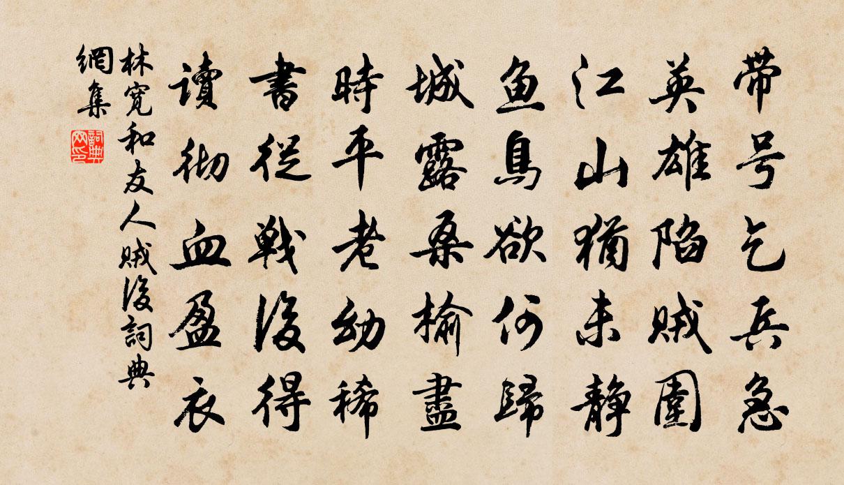 詩詞名句歷史字典書法欣賞書法字典國語詞典說文解字康熙字典古漢語字典標 題 作 者 詩 句 和友人賊後作者:林寬 朝代:唐代和友人賊後原文帶號乞兵急,英雄陷賊圍。江山猶未靜,魚鳥欲何歸。城露桑榆盡,時平老幼稀。書從戰後得,讀徹血盈衣。詩詞問答問:和友人賊後的作者是誰?答:林寬問:和友人賊後寫於哪個朝代?答:唐代問:和友人賊後是什麼體裁?答:五律林寬和友人賊後書法欣賞和友人賊後書法作品注釋全唐詩:卷606-30詩詞推薦游白石岩陳傅良〔宋代〕地向東南傾,石際滄海立。蛟鼉限波濤,雞犬得城邑。居然通國望,跋莫他山及。道人獨有之,置屋三四級。幾看無夢令馬鈺〔元代〕四鼓孤眠內守。謹謹小心防寇。慧照破邪魔,自是金精無漏。無漏。無漏。一點靈光結就。舟次吳城山陶夢桂〔宋代〕淮蜀荊襄老此生,歸與雙眼識吳志。樹依神力連雲暗,水到江西徹底清。去棹來帆南北客,孤鴻落日古今情。枯腸和潘倅新溪七首姜特立〔宋代〕我來久矣了窮通,出處誰能與眾同。此去便須專一壑,人生何必作三公。鄉思李覯〔宋代〕人言落日是天涯,望極天涯不見家。已恨碧山相阻隔,碧山還被暮雲遮。憶釣舟吳融〔唐代〕青山小隱枕潺湲,一葉垂綸幾溯沿。後浦春風隨興去,南塘秋雨有時眠。慣沖曉霧驚群雁,愛颭殘陽入亂煙。回首三日侍華光殿曲水宴代人應詔詩 五謝朓〔南北朝〕求賢每勞。得士方逸。有覺斯順。無文鹹秩。萬箱惟重。百鍰載恤。屈草戒諛。階蓂紀日。樂牧吟金朋說〔宋代〕牛背日高方睡熟,橫吹短笛不成腔。毛球打罷歸來晚,古木寒雅又夕陽。雨陸游〔宋代〕映空初作繭絲微,掠地俄成箭鏃飛。紙帳光遲饒曉夢,銅爐香潤覆春衣。池魚鱍鱍隨溝出,梁燕翩翩接翅歸。惟有孫伯符墓下周弼〔宋代〕梧葉蕭蕭墓草長,夢魂曾斷九迴腸。空聞絳帕離章水,誰見黃旗入洛陽。鴉噪暮園江阪迥,龍盤春戍石城荒。赤烏明皇祀圜丘樂章。豫和佚名〔唐代〕至矣丕構,烝哉太平。授犧膺籙,復禹繼明。草木仁化,鳧鷖頌聲。祀宗陳德,無愧斯誠。四不忍劉子翬〔宋代〕黃河鑿鑿冰成路,人語寒空氣成霧。此時泣血念鑾輿,玉體能勝凜冽無。蒼黃天步蒙塵去,畫袞飄零傷歲暮,飛書得巨魚送叔祖張鎡〔宋代〕桃花流水正關渠,雨後俄收紫鱠魚。豈是齋廚真欠此,小詩聊當腹中書。浣溪沙王惲〔元代〕隋末唐初與漢亡。干戈此際最搶攘。一時人物盡鷹揚。褒鄂有靈毛髮動,曹劉無敵簡書光。爭教含泣到分香。山橋月夜方岳〔宋代〕寒聲策策琅玕碧,香氣浮浮菡萏紅。六月人間苦炎熱,獨搔殘雪月明中。再獻一章聊歌盛美亦次前韻庶達下情蓋采群情李至〔宋代〕縉紳公論比何如,萬物熙熙燮理余。罷相暫游端揆地,退朝閒讀聖人書。荀公道在馨香遠,謝傳情高世俗疏。聞說訪楊湖州汪莘〔宋代〕一道西江隔水雲,夜瞻牛斗共天文。聖之清必先夫子,仁者勇須今使君。天下山川居一半,湖州風月占三分。錦囊望江南/憶江南趙子發〔宋代〕新夢斷,久立暗傷春。柳下月如花下月,今年人憶去年人。往事夢中身。宣州雜詩二十首梅堯臣〔宋代〕古有琴高者,騎魚上碧天。小鱗隨水至,三月滿江邊。少婦自撈摝,遠人無棄捐。憑書不道薄,賣取青銅錢。曾夔州座右山水圖晁公溯〔宋代〕華堂左右皆山川,登堂一見心茫然。松林忽在素壁上,几杖卻對陰崖前。百年老樹橫高枝,正當太古陰雲垂。近前名句推薦向淺洲遠渚,亭亭清絕。張炎《疏影·詠荷葉》 雪照山城玉指寒,一聲羌管怨樓間。劉著《鷓鴣天·雪照山城玉指寒》 年年今夜,月華如練,長是人千里。范仲淹《御街行·秋日懷舊》 道由白雲盡,春與青溪長。劉昚虛《闕題》 秋風吹到江村,正黃昏,寂寞梧桐夜雨不開門。顧彩《相見歡·秋風吹到江村》 酒不醉人人自醉,色不迷人人自迷。馮夢龍《警世通言·卷二十四》 明日巴陵道,秋山又幾重。李益《喜見外弟又言別》 戚姬髡髮入舂市,萬古共悲辛。李白《中山孺子妾歌》 君子上交不諂,下交不瀆佚名《易傳·繫辭傳下·第五章》 村北村南,穀雨才耕遍。范成大《蝶戀花·春漲一篙添水面》
