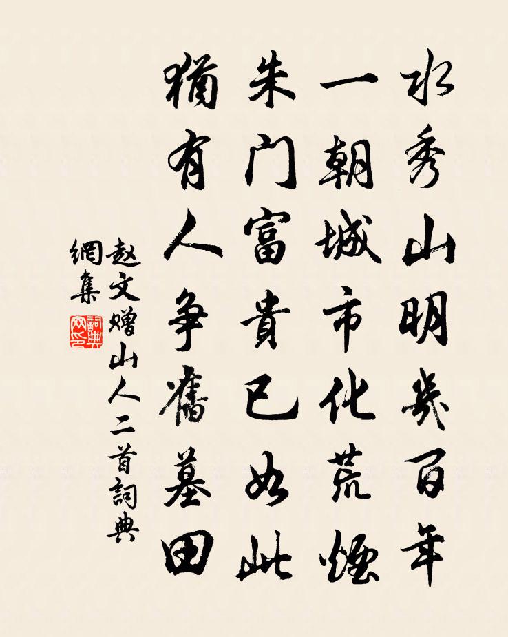 詩詞名句歷史字典書法欣賞書法字典國語詞典說文解字康熙字典古漢語字典標 題 作 者 詩 句 贈山人二首作者:趙文 朝代:宋代贈山人二首原文水秀山明幾百年,一朝城市化荒煙。朱門富貴已如此,猶有人爭舊墓田。詩詞問答問:贈山人二首的作者是誰?答:趙文問:贈山人二首寫於哪個朝代?答:宋代趙文贈山人二首書法欣賞贈山人二首書法作品詩詞推薦寄情(一作許渾代作)佚名〔唐代〕春風白馬紫絲韁,正值蠶娘未採桑。五夜有心隨暮雨,百年無節抱秋霜。重尋繡帶朱藤合,卻忍羅裙碧草長。為報燭丁謂〔宋代〕影抱銅芝直,光搖鑄鳳圓。叢花生木蓼,凝密墮金蓮。積貨徒供爨,當官竟不燃。曾窺司烜氏,明燧奉高天。再逢晝公齊己〔唐代〕竟陵西別後,遍地起刀兵。彼此無緣著,雲山有處行。久吟難敵句,終忍不求名。年鬢俱如雪,相看眼且明。窮鳥賦趙壹〔兩漢〕 昔原大夫贖桑下絕氣,傳稱其仁;秦越人還虢太子結脈,世著其神。設曩之二人不遭仁遇神,則結絕之氣竭矣縱筆陸游〔宋代〕天道何時定?人生固有涯。壯年行出塞,晚歲病還家。積憤憑誰豁,孤忠袛自嗟。今朝茅屋底,隱約聽霜笳。贈包安靜先生茶三首蘇軾〔宋代〕皓色生甌面,堪稱雪見羞。東坡調詩腹,今夜睡應休。(偶謁大中精藍中,遇故人烹日注茶,果不虛示,故詩以記留暹首座釋重顯〔宋代〕從龍為雨復清閒,片段依依水石間。慚問秋風欲吹散,不能留得覆青山。菩薩蠻(簪髻)侯置〔宋代〕交刀剪碎琉璃碧。深黃一穗瓏松色。玉蕊縱妖嬈。恐無能樣嬌。綠窗初睡起。墮馬慵梳髻。斜插紫鸞釵。香從鬢底四休居士詩三首黃庭堅〔宋代〕富貴何時潤髑髏,守錢奴與拘官囚。太醫診得人間病,安樂延年萬事休。寓寺八首張耒〔宋代〕籠燈到曉只微明,獨擁單衾聽雨聲。葛幌竹床清過暑,蕭然未覺負平生。偈頌六十八首釋法薰〔宋代〕趙州禪,口皮邊。牆外底,透長安。{上祝下土}著磕著,言端語端。不是釣鰲手,徒勞把釣竿。次韻答少章聞雁聽雞二首黃庭堅〔宋代〕朝士聞雞常半途,朱門擁被不關渠。秦郎五起聽三唱,殘燭貪傳未見書。酒泉子曹勛〔宋代〕愛景催暄。初向晴梢舒玉點,修筠靄靄隔嬋娟。更清妍。東風欲到冷霜天。常記孤山殘雪路,一枝流水小橋邊。臥句梁瓊〔唐代〕玉枕空流別後淚,羅衣已盡去時香。和酈僉事見寄韻何夢桂〔宋代〕半世虛名我誤儒,樊中短翅倦南圖。英塵世千少年改,白髮心期四海無。績紡婦慵麻褐短,耕鋤兒懦豆田蕪。老來行香子 自詠王丹桂〔元代〕雲水生涯。到處為家。遠浮名、浮利浮華。三宮升降,上下無差。要結靈胎,收靈物,聚靈芽。清興幽賒。此外何謁金門袁去華〔宋代〕煙水闊。夜久風生苹末。東舫西船人語絕。四更山吐月。客里光陰電抹。不記離家時節。樓上單于聽未徹。又催征暮春過洪氏汝曲小園梅堯臣〔宋代〕三月花已休,閒來羨叢薄。河回地勢偏,雨入灘聲惡。綠草旋抽心,青梅猶帶萼。主人歸未歸,誰省曾遊樂。挽雷處士劉宰〔宋代〕別駕推前輩,當家得後昆。零丁問防墓,高大復於門。達觀吾忘我,儒風子又孫。閭閻耆舊盡,能復典刑存。瞿唐峽陽枋〔宋代〕曾聞灩澦屹瞿唐,雪浪摧山勢獨當。我至韶融方二月,水平石出映斜陽。名句推薦不愁屋漏床床濕,且喜溪流岸岸深曾幾《蘇秀道中》 靜女其姝,俟我於城隅。佚名《靜女》 落地為兄弟,何必骨肉親!陶淵明《雜詩》 以肉去蟻蟻愈多,以魚驅蠅蠅愈至。韓非及後人《韓非子·外儲說左下》 草木秋死,松柏獨在劉向《說苑·談叢》 禮輕情意重,千里送鵝毛!緬伯高《千里送鵝毛(將鵝貢唐朝)》 石溪久住思端午,館驛樓前看發機。盧肇《競渡詩 / 及第後江寧觀競渡寄袁州剌史成應元》 霰雪紛其無垠兮,雲霏霏而承宇。屈原《九章》 相思本是無憑語,莫向花箋費淚行。晏幾道《鷓鴣天·醉拍春衫惜舊香》 輔弼之臣瓦解,而邪諂之人並進班固《漢書·傳·東方朔傳》