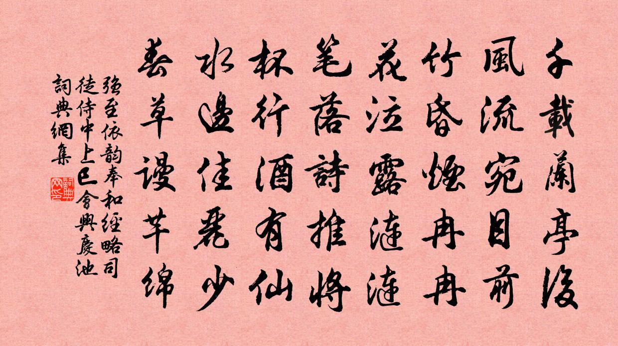 詩詞名句歷史字典書法欣賞書法字典國語詞典說文解字康熙字典古漢語字典標 題 作 者 詩 句 依韻奉和經略司徒侍中上巳會興慶池作者:強至 朝代:宋代原文千載蘭亭後,風流宛目前。竹昏煙冉冉,花泣露漣漣。筆落詩推將,杯行酒有仙。水邊佳麗少,春草謾芊綿。詩詞問答問:《依韻奉和經略司徒侍中上巳會興慶池》的作者是誰?答:強至問:該詩寫於哪個朝代?答:宋代書法欣賞依韻奉和經略司徒侍中上巳會興慶池書法作品詩詞推薦舟上徐照〔宋代〕小船停槳逐潮還,四五人家住一灣。貪看曉光侵月色,不知雲氣失前山。賀新郎(玩月)吳潛〔宋代〕汲水驅炎熱。晚些兒、披衣露坐,待他涼月。俄頃銀盤從海際,推上璇霄璧闕。盡散作、滿懷冰雪。萬里河潢收卷次韻真歇和尚圓覺經頌一十四首威德自在菩釋正覺〔宋代〕門開三觀莫遲留,得路行行到始休。鑒像照心無所住,樓鍾出礙有來由。頂中具眼如天主,肘後分符似國侯。應世鷓鴣天(壽定庵運管兄)張榘〔宋代〕飽挹台城白鷺秋。又騎黃鵠上江州。恩波浩蕩三千里,多少人家願借留。□壽斝,菊香浮。姓名還喜到宸旒。片□沈康赴江西掾祖無擇〔宋代〕高譽冠時英,人皆倒屣迎。決科材尚屈,掌獄職仍輕。滕閣吟登健,吳山醉望清。公餘如訪古,一為問豐城。徐少卿輓詞戴栩〔宋代〕忽作嚴州夢,難隨上雍班。行藏天分巧,夷險世機閒。瘴酒雲生綠,銘旌露濕斑。保昌鍾梵曉,依舊是家山。食筍曾幾〔宋代〕花事闌珊竹事初,一番風味殿春蔬。龍蛇戢戢風雷後,虎豹斑斑霧雨餘。但使此君常有子,不憂每食嘆無魚。丁寧寄題剡竺貫之書堂陳著〔宋代〕一片心田種善根,粲為枝葉兒孫。人從今日封培去,百世金庭好石門。偈頌六十七首釋原妙〔宋代〕周行七步猶成跡,槨示雙趺豈易收。微雨灑花千點淚,淡煙籠竹一堆愁。宗忠簡公畫像贊陳炳〔宋代〕平生孔明,稱慕莫及。像見忠簡,懦夫有立。橫流砥柱,萬里長城。欲奮空弮,以植危傾。猛將斂手,氣指目使。大中祥符五嶽加帝號祭告八首佚名〔宋代〕瞻言太華,奠方作鎮。典冊是膺,等威以峻。上公奉備,祀宗薦信。介祉萬邦,永配坤順。九月八日類試別所與同事飲而痁作魏了翁〔宋代〕彼顓氏子太鴟張,藥裹丹瓢為汝忙。堆案文書埋白日,閉門風雨厄重陽。酒嘗友我胡為崇,菊亦愁余未肯黃。閒玩句歐陽鈇〔宋代〕天上張公子,雲間陸士龍。余床帳為過兵捲去答梅山弟用餘韻見寄陳著〔宋代〕一床破帳護衰翁,席捲俄隨掠騎東。與婦同圍膚炭火,呼兒排作肉屏風。從來不起羊羔想,困倒何妨蝶夢通。亂世小重山侯善淵〔元代〕陰陽顛倒一聲雷。忽然驚睡覺,夢中回。迷雲拂盡慧光開。隨風去,抱個日頭來。溫養結仙胎。空中明顯現,越靈羽林騎(一作羽林少年行)韓翃〔唐代〕駿馬牽來御柳中,鳴鞭欲向渭橋東。紅蹄亂蹋春城雪,花頷驕嘶上苑風。閒甚戲作陸游〔宋代〕酒盡枵樽腹,書拋委架麈。漸能閒過日,始覺老催人。玉麈王夷甫,金龜賀季真。若論方外事,終媿葛天民。和伯文送丁校尉往維揚伯文嘗教之避禍不從陳杰〔宋代〕聞道機心不下鷗,丈夫乃不為身謀。人間信有城門犬,江滸非無夜半舟。塞上馬來還反掌,揚州鶴去又從頭。茫茫端午帖子太上皇帝閣周必大〔宋代〕午節由來重,今符火德昌。炎圖常有赫,聖壽共無疆。虞美人·玉闌乾外清江李廌〔宋代〕玉闌乾外清江浦,渺渺天涯雨。好風如扇雨如簾,時見岸花汀草、漲痕添。青林枕上關山路,臥想乘鸞處。碧蕪千名句推薦玉階空佇立,宿鳥歸飛急。李白《菩薩蠻·平林漠漠煙如織》 當壚秦女,十五語如弦。賀鑄《行路難·縛虎手》 憶昔霍將軍,連年此征討。高適《登百丈峰二首》 外亂而內整,示飢而實飽,內精而外鈍。姜子牙《六韜·文韜·兵道》 香消翠減,雨昏煙暗,芳草遍江南。喬吉《小桃紅·春閨怨》 傷心庾開府,老作北朝臣。司空曙《金陵懷古》 過頭飯好吃,過頭話難聽!佚名《增廣賢文·下集》 空將漢月出宮門,憶君清淚如鉛水。李賀《金銅仙人辭漢歌》 雁過孤峰曉,猿啼一樹霜。賈島《送天台僧》 殊方日落玄猿哭,舊國霜前白雁來。杜甫《九日五首·其一》