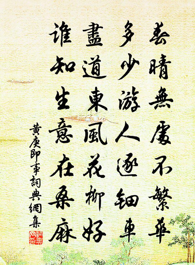 詩詞名句歷史字典書法欣賞書法字典國語詞典說文解字康熙字典古漢語字典標 題 作 者 詩 句 即事作者:黃庚 朝代:宋代即事原文春晴無處不繁華,多少遊人逐鈿車。盡道東風花柳好,誰知生意在桑麻。詩詞問答問:即事的作者是誰?答:黃庚問:即事寫於哪個朝代?答:宋代黃庚即事書法欣賞即事書法作品詩詞推薦次坦庵兄韻俞桂〔宋代〕便中蒙賜墨,得句勝如書。暫爾兩年別,俄然春暮余。夢馳情不間,心邇跡何疎。自省吾今老,湖山縛屋居。偈頌六十七首釋原妙〔宋代〕西峰結制不尋常,谷滿倉兮僧滿堂。既得遮些根蒂固,大家搖扇取風涼。還都宋祁〔宋代〕一封東走罷州麾,卻趁清班上赤墀。侍史香爐留直夜,王孫春草見歸時。虛名所賴天藏拙,晚歲無如病與衰。要在鸚鵡曲 龐隱圖馮子振〔元代〕團欒話里禪龕住。靈昭女對老龐父。利名心不掛絲毫,更肯沾風粘雨。嘆黃金散盡還家,逝水看流年去。只尋常賣隱者釋遵式〔宋代〕一徑千峰里,何人更往還。無為無事者,白首白雲閒。釀酒擔寒瀑,尋猿過別山。豈知名利客,鞭馬向秦關。昭潭十愛梅摯〔宋代〕我愛昭州觀,裁基壓大溪。一樓雲駐隱,雙表鶴歸迷。金剜先朝語,鸞驚舊史題。皇恩新雨露,祈福為烝黎。將官雷勝得過字代作蘇軾〔宋代〕胡騎入雲中,急烽連夜過。 * 穿虜陣,濺血貂裘涴。一來輦轂下,愁悶惟欲臥。今朝從公獵,稍覺天宇大。一雙離楚夜泊高麗館寄楊克一甥四首張耒〔宋代〕去城未五里,夜纜系衰柳。水亭暗風雨,人散聞吠狗。平生足羈旅,沉此還往久。有感不自知,悽然獨回首。寄金壇湯進卿顧逢〔宋代〕幾度野窗下,看君所寄詩。識韓雖未遂,說項已先知。獨鶴留晴影,殘花怕雨時。苦無千里遠,每恨納交遲。步蟾宮閏六月七夕顧貞觀〔清代〕玉纖暗數佳期近。已到也、忽生幽恨。恨無端、添葉與青梧,倒減卻、黃楊一寸。 天公定亦憐嬌俊念兒女、經生查子韓玉〔宋代〕裙拖簇石榴,髻綰偏荷葉。頭上短金釵,輕重還相壓。輕顰月入眉,淺笑花生頰。夫婿不風流,取次看承別。戲贈智淵師二偈李流謙〔宋代〕芙蕖元不植高原,插向紅爐色更鮮。拖取門前擔糞漢,滿堂金玉富熏天。頌古一百則釋正覺〔宋代〕秤頭蠅坐便欹傾,萬世權衡照不平。斤兩錙銖見端的,終歸輸我定盤星。清平樂賈逋〔宋代〕薰梅染柳。借得東君手。柳色梅香到樽前,攄寫才華八斗。當年占夢佳辰。今年樂事尤新。日侍玉皇香案,鈞天日謫居悼往二首劉禹錫〔唐代〕邑邑何邑邑,長沙地卑濕。樓上見春多,花前恨風急。猿愁腸斷叫,鶴病翹趾立。牛衣獨自眠,誰哀仲卿泣。鬱郁東樓竹白居易〔唐代〕瀟灑城東樓,繞樓多修竹。森然一萬竿, * 封青玉。捲簾睡初覺,欹枕看未足。影轉色入樓,床蓆生浮綠。空城送僧歸撫州釋正覺〔宋代〕不肯雲林伴冷淒,疏山歸謁矮闍梨。非枯樁句如明白,會要重來摩伏犀。謁金門佚名〔宋代〕歸未卜。頻倒金驅纖玉。明月綃窗停剪燭。搦愁題蠹綠。秋水娟娟魚目。腰素幾分銷縮。接得雲箋無意讀。雕鞍何再次交代韻四首袁說友〔宋代〕筆力潛窺大小蘇,詩傳諸老定{巇山換口}吁。從今訂價連城重,政使群兒有善誣。和朱水鄉韻趙必象〔宋代〕江湖雙鬢短,風雨一燈孤。買酒初嘗芡,抄詩細截蒲。織耕同德曜,編簡對韓符。怕有傷時句,磨教稜角無。名句推薦思爾為雛日,高飛背母時。白居易《燕詩示劉叟》 陽生陰長,陽殺陰藏佚名《黃帝內經·素問·陰陽應象大論》 洞庭春溜滿,平湖錦帆張。陰鏗《渡青草湖》 貨盡而後知不足,是不知量也,事已,而後知貨之有餘,是不知節也管仲《管子·乘馬》 明月青山夜,高天白露秋。李嶠《同賦山居七夕》 此生只是償詩債,白菊開時最不眠。司空圖《白菊雜書四首》 青山依舊在,幾度夕陽紅。楊慎《臨江仙·滾滾長江東逝水》 小橋橫截,缺月初弓。辛棄疾《沁園春·靈山齋庵賦時築偃湖未成》 只因一著錯,滿盤俱是空。馮夢龍《醒世恆言·卷八》 梅子留酸軟齒牙,芭蕉分綠與窗紗。楊萬里《閒居初夏午睡起》