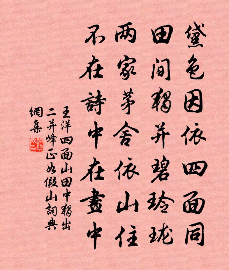 詩詞名句歷史字典書法欣賞書法字典國語詞典說文解字康熙字典古漢語字典標 題 作 者 詩 句 四面山田中獨出二並峰正如假山作者:王洋 朝代:宋代原文黛色因依四面同,田間獨並碧玲瓏。兩家茅舍依山住,不在詩中在畫中。詩詞問答問:《四面山田中獨出二並峰正如假山》的作者是誰?答:王洋問:該詩寫於哪個朝代?答:宋代書法欣賞四面山田中獨出二並峰正如假山書法作品詩詞推薦贈許登仕劉克莊〔宋代〕蓬戶無人來問疾,薇垣道汝妙通仙。此翁書眼真盲矣,之子心眸愈瞭然。預算粉郎將死日,能推絳老始生年。清漳仲和時齋即事葛紹體〔宋代〕夾徑花開一丈紅,傍池新竹萬枝風。閒來笑語忘為客,杯酒淡煙明月中。何如吟邵雍〔宋代〕立身須作真男子,臨事無為淺丈夫。料得人生皆素定,空多計較竟何如。同學一首別子固王安石〔宋代〕江之南有賢人焉,字子固,非今所謂賢人者,予慕而友之。淮之南有賢人焉,字正之,非今所謂賢人者,予慕而友苦雨釋寶曇〔宋代〕急雨涔涔日,春泥盎盎中。屐聲喧午枕,人語泣西風。斗米衾裯盡,鄰翁杼軸空。無因訴真宰,吾道竟須東。黃鶴謠寄吳季謙侍郎時季謙自德安入城予適以岳珂〔宋代〕盧山白鶴歸來雙,縞衣素袂玄為裳。翅如車輪夜橫江,風聲曾走淮淝羌。戛然長鳴下柴桑,芝田啄粒遙相望。何人再和四首劉克莊〔宋代〕舊知偏下石,遠避亦傷弓。留落周南眾,蕭條冀北空。萬言徒飾詐,雙淚卻由衷。王績何曾醉,劉蕡本不風。送清素禪者之金華釋重顯〔宋代〕古策風高瓶浪闊,春雲片段分清絕。金盆後夜孤頂寒,去去誰同落殘月。養拙丘葵〔宋代〕養拙乾弋際,逃名山水邊。疏泉妨蟻過,掃地愜牛眠。竟日雲籠樹,何時雨洗天。入門兒女聒,恨未斷塵緣。嘲小兒盧肇〔唐代〕貪生只愛眼前珍,不覺風光度歲頻。昨日見來騎竹馬,今朝早是有年人。除夜次慶符胡銓〔宋代〕白髮無端苦見尋,十年孤負醉花陰。可憐獨鶴輕浮海,未及昏鴉日伴林。天末醉眠千嶺寂,江南夢繞五雲深。一杯題花光梅十首淡中有味王柏〔宋代〕一丘一壑似夷齊,勁雪繁霜特立時。瘦影橫斜清峭峭,世間幾個赴心期。和龐學士藍方〔宋代〕仰告明君乞得身,不妨林下戴紗巾。滿斟村酒浮瓊蟻,旋釣溪魚鱠錦鱗。元府烏鴉飛後夜,洞中花木鎮長春。吾官金陵雜興二百首蘇泂〔宋代〕溪上鴛鴦避畫船,船中妓女列嬋娟。使君愛日留連客,同醉江家舊宅邊。東關陸游〔宋代〕路入東關物象奇,角巾老子曳筇枝。蠶如黑蟻桑生後,秧似青鍼水滿時。穿市不嫌微雨濕,過溪翻喜壞橋危。當年松江陳必復〔宋代〕嗟我賦歸役,憐君尚滯留。江風借行色,山月伴離愁。天地日以肅,星辰夜欲浮。東籬菊花約,莫易負清秋。句劉望之〔宋代〕山繞郡樓秋過雨,月臨池樹晚生煙。題鄭處士隱居唐求〔唐代〕不信最清曠,及來愁已空。數點石泉雨,一溪霜葉風。業在有山處,道成無事中。酌盡一尊酒,病夫顏亦紅。秦樓月/憶秦娥范成大〔宋代〕樓陰缺。闌乾影臥東廂月。東廂月。一天風露,杏花如雪。隔煙催漏金虬咽。羅幃暗淡燈花結。燈花結。片時春夢北窗睡起陸游〔宋代〕違物離人不計年,萬金難買北窗眠。高懷元在羲皇上,大事已明空劫前。樵路細盤雲外嶺,釣筒倒插水中天。此時名句推薦紗窗日落漸黃昏,金屋無人見淚痕。劉方平《春怨》 尋河愁地盡,過磧覺天低。岑參《磧西頭送李判官入京》 淡中交耐久,靜里壽延長。王永彬《圍爐夜話·第一一六則》 關山正飛雪,烽火斷無煙。王維《隴西行》 誰愛風流高格調,共憐時世儉梳妝。秦韜玉《貧女》 初報邊烽照石頭,旋聞胡馬集瓜州。陸游《送七兄赴揚州帥幕》 太平本是將軍定,不許將軍見太平。施耐庵《水滸傳·第一百一十四回》 淒淒歲暮風,翳翳經日雪。陶淵明《癸卯歲十二月中作與從弟敬遠》 志足而言文,情信而辭巧劉勰《文心雕龍·徵聖》 跬步而不休,跛鱉千里;累土而不輟,丘山崇成。荀子《荀子·修身》