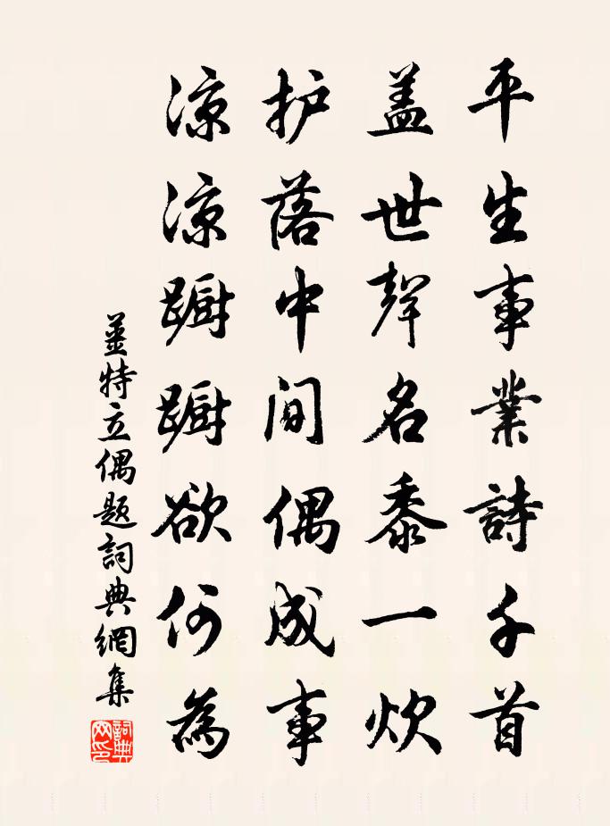 詩詞名句歷史字典書法欣賞書法字典國語詞典說文解字康熙字典古漢語字典標 題 作 者 詩 句 偶題作者:姜特立 朝代:宋代偶題原文平生事業詩千首,蓋世聲名黍一炊。護落中間偶成事,涼涼躕躕欲何為。詩詞問答問:偶題的作者是誰?答:姜特立問:偶題寫於哪個朝代?答:宋代姜特立偶題書法欣賞偶題書法作品詩詞推薦問信紅梅二章舒岳祥〔宋代〕凍白千林須雪重,暖紅一點著春多。啞驢瘦策平皋去,如此風流奈老何。奉寄斯遠兼屬文鼎處州子永提屬五首趙蕃〔宋代〕聞道當年五色裘,飄然又入帝王州。煩君一為問行李,早晚遣詩相報投。熊主簿示梅花十絕詩至梅花已過因觀海棠輒次劉克莊〔宋代〕萬蕊千葩染似紅,停杯無語恨東風。薄寒且為花愁惱,何況開時值雨中。望蓬萊馬鈺〔元代〕馬風子,業障忒愚頑。不認洞天真供養,卻迷俗禮假修完。心意怎清閒。著外境,欲要塑師顏。建塔修堂並立石,秋思陸游〔宋代〕秋來情味更堪論,身寄城南五畝園。委轡看山無鐵獺,拾樵煎茗有青猿。陂塘夜雨添新漲,原野煙蕪減舊痕。豈是霪雨方岳〔宋代〕朝雨暮雨不肯晴,昏昏冥冥如翳塵。舍有連月汗流礎,道傍前日泥埋輪。東南地傾水所匯,潮汐沙擁江之漘。埧頭和幽居趙希逢〔宋代〕不因搜句不曾忙,盡日柴門閉短牆。寄傲北窗閒著眼,任他書卷展風床。思佛亭曉望范成大〔宋代〕栗烈剛風颳病眸,登臨何啻緩千憂。界天暑雪青城外,涌地晴雲瓦屋頭。浩蕩他年夸北客,蒼茫何處認西州?千岩應制賞花徐鉉〔唐代〕上林春暮紫英開,組繡成帷蔭玉階。艷逐晨光隨時步武,香和輕翠透襟懷。生成澤廣時芳茂,魚水情通樂韻諧。禁字字雙王麗真女〔唐代〕床頭錦衾斑復斑,架上朱衣殷復殷。空庭明月閒復閒,夜長路遠山復山。句諶祜〔宋代〕千山落木秋來客,兩袖西風旦過僧。讀張李二生文贈石生先歐陽修〔宋代〕先生二十年東魯,能使魯人皆好學。其間張續與李常,剖琢珉石得天璞。大圭雖不假雕瑑,但未磨礲出圭角。二生木蘭後池三詠白蓮皮日休〔唐代〕但恐醍醐難並潔,只應薝蔔可齊香。半垂金粉知何似,靜婉臨溪照額黃。讀曲歌佚名〔宋代〕思歡不得來,抱被空中語。月沒星不亮,持底明儂緒。送呂行甫司門倅河陽蘇軾〔宋代〕結交不在久,傾蓋如平生。識子今幾日,送別亦有情。子生公相家,高義久崢嶸。天才既超詣,世故亦屢更。譬如和韓五持國乞分道損山藥之什梅堯臣〔宋代〕不種東陵瓜,不利千畦韭。山藥數十本,帶土移野叟。故葉萎未醒,傷根亦何咎。既為君子好,豈與騷人負。騷人寄題鍾秀才詠歸堂葉適〔宋代〕鍾君文武隨所求,馬上檄草兼詞頭。五兵鑄就殺氣動,卻寫三賦祥光流。左逾陰山右絕漠,漢地自厭胡沙惡。聖門投秦太師王灼〔宋代〕雙龍闕下五雲新,喜見天元第一春。鄰使來輸朝會玉,儒宮望拜屬車塵。囊空赤白閒邊將,雨足公私快野人。渾是紀實乾隆〔清代〕失腳落溪癸卯年,衣衫末濕即登船。因艱步履蓋老耳,弗慎起居為恧然。問類馮河答子路,事殊賞節駭忠賢。原如和黃彥華帥機六言十首劉克莊〔宋代〕骯髒倚門如敖,滑稽玩世非顛。坡即崇寧奎宿,白是開元謫仙。名句推薦何方可化身千億,一樹梅花一放翁。陸游《梅花絕句·其一》 長條別有風流處,密映錢塘蘇小家。寇準《柳·曉帶輕煙間杏花》 心斷新豐酒,銷愁斗幾千。李商隱《風雨》 共說春來春去事,多時。一點愁心入翠眉。晏幾道《南鄉子·花落未須悲》 楓樹夜猿愁自斷,女蘿山鬼語相邀李商隱《楚宮》 滿則慮嗛,平則慮險,安則慮危荀子《荀子·仲尼》 寄相思,寒雨燈窗,芙蓉舊院。吳文英《宴清都·秋感》 舊曲梅花唱,新正柏酒傳。孟浩然《歲除夜會樂城張少府宅》 那作商人婦,愁水復愁風。李白《長干行二首》 耕夫召募愛樓船,春草青青萬項田;張繼《閭門即事》