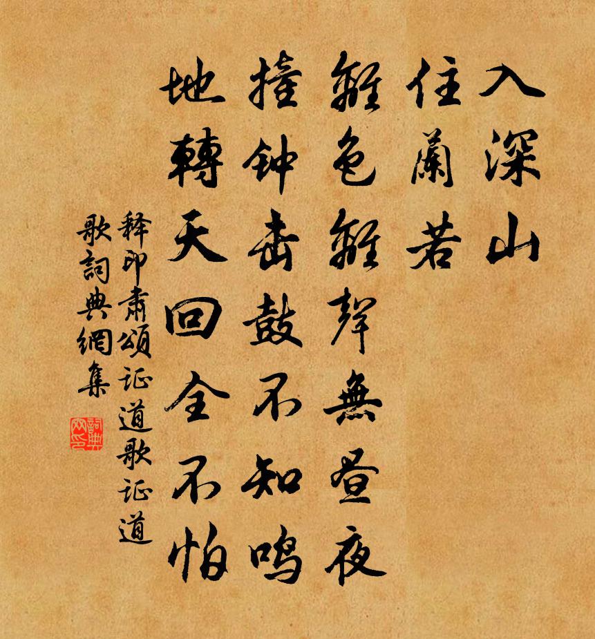 詩詞名句歷史字典書法欣賞書法字典國語詞典說文解字康熙字典古漢語字典標 題 作 者 詩 句 頌證道歌證道歌作者:釋印肅 朝代:宋代頌證道歌證道歌原文入深山,住蘭若,離色離聲無晝夜。撞鐘擊鼓不知鳴,地轉天回全不怕。詩詞問答問:頌證道歌證道歌的作者是誰?答:釋印肅問:頌證道歌證道歌寫於哪個朝代?答:宋代釋印肅頌證道歌證道歌書法欣賞頌證道歌證道歌書法作品詩詞推薦讀本師語錄釋雲岫〔宋代〕青旗斜出畫橋西,楊柳飛花水滿堤。一酌誤人千日酒,醉埋荒冢不思歸。驚雷聚雨陽枋〔宋代〕山頭雲殲雜燒畲,桃李層層山半家。謳軋蠻歌聲滿峽,春生龍節爛光華。湖邊採蓮婦李白〔唐代〕小姑織白紵,未解將人語。大嫂采芙蓉,溪湖千萬重。長兄行不在,莫使外人逢。願學秋胡婦,貞心比古松。又次韻醵飲周必大〔宋代〕層軒發天藏,初日照粉雘。雄觀跨鵬背,煩促陋蠶箔。飛綏會蘭亭,傳觴寫桑落。飲興江海窄,逸氣雲天薄。雖無次韻酬黃季章林季仲〔宋代〕長安公子意氣豪,笑我憔悴居蓬蒿。人生棲托一枝足,何用摶風九萬高。我今百事付流水,歸臥北窗心獨喜。林表釣台韓元吉〔宋代〕璜溪亦有釣魚人,一笑鷹楊掃戰塵。不會先生辭漢祖,投竿深坐此江濱。習彥威宋庠〔宋代〕四海習彥威,英英出江漢。高韻凌風翔,雕文奪星爛。感激陽秋辭,奸雄非所憚。蜀弱自為正,曹強乃名亂。陰忤皇華薛紹彭〔宋代〕橘樹松林綠徑長,竹籬縈繞當城隍。皇華何異投荒客,已過山川是夜郎。汾沮洳佚名〔先秦〕彼汾沮洳,言采其莫。彼其之子,美無度。美無度,殊異乎公路。彼汾一方,言采其桑。彼其之子,美如英。美如鷓鴣天(立春後即事)劉辰翁〔宋代〕舊日桃符管送迎。燈球爆竹斗先贏。鹿門亂走團欒久,才到城門有鼓聲。梅弄雪,柳窺晴。殘年猶自冷如冰。欲知和無介之曹勛〔宋代〕五年相別改形容,又向潮陽識颶風。蕭散喜君真有道,驅馳如我久無功。一鳴遂墮塵埃里,九死餘生患難中。弔影有所思於石〔宋代〕君在南山南,水闊雲漫漫。我在北山北,木落天地寬。所思不可見,孤峰碧巑屼。片雲遙相望,脈脈一水間。水流董逃歌佚名〔魏晉〕承樂世,董逃;游四郭,董逃。蒙天恩,董逃;帶金紫,董逃。行謝恩,董逃;整車騎,董逃。垂欲發,董逃;與寄友人譚用之〔唐代〕病多慵引架書看,官職無才思已闌。穴鳳瑞時來卻易,人龍別後見何難。琴樽風月閒生計,金玉松筠舊歲寒。早晚少年行杜牧〔唐代〕連環羈玉聲光碎,綠錦蔽泥虬卷高。春風細雨走馬去,珠落璀璀白罽袍。宣州蔡子平尚書淑人居氏輓詞二首周必大〔宋代〕鵷綴聞相藻,鴒原忝附葭。至今思並舍,晚歲擬通家。只道身長健,那知生有涯。挽謳無好語,聊雜壟頭笳。賀田都弦再帥夔陽枋〔宋代〕十乘由夔入釣魚,飲江無馬雁安居。瞿唐催要金城壁,即墨爭迎鐵里車。八陳旌旗蛇勢整,九關風月虎符虛。白監柳絮宋祁〔宋代〕萬縷金長暖絮縈,雪乾雲困遍春城。衝風力盡飛應怯,試與鴻毛較重輕。八聲甘州(再用韻述懷)何夢桂〔宋代〕自遼東鶴去,算何人、插得翅能飛。笑平生錯鑄,儒冠誤識,者也焉之。謾道寒蠶冰底,瓮繭解成絲。何許絲千丈九鎖山十詠來賢岩呂同老〔宋代〕昔賢所游地,道路行逶迤。中分山腰半,倒插石腳危。公生元佑時,名與日月垂。至今草木間,英氣光離離。我行名句推薦朝騁騖兮江皋,夕弭節兮北渚;屈原《九歌》 高館張燈酒復清,夜鍾殘月雁歸聲。高適《夜別韋司士》 玉在山而草木潤,淵生珠而崖不枯。荀子《荀子·勸學》 無言獨上西樓,月如鉤。李煜《相見歡·無言獨上西樓》 只有精忠能報國,更無樂土可為家。 * 《元旦口占用柳亞子懷人韻》 已過才追問,相看是故人。吳偉業《遇舊友》 秋色冷並刀,一派酸風卷怒濤。陳維崧《南鄉子·邢州道上作》 塞北梅花羌笛吹,淮南桂樹小山詞。劉禹錫《楊柳枝詞九首·其一》 不知天上宮闕,今夕是何年。蘇軾《水調歌頭·丙辰中秋》 欲買桂花同載酒,終不似,少年游。劉過《唐多令·蘆葉滿汀洲》
