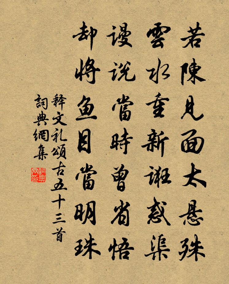 詩詞名句歷史字典書法欣賞書法字典國語詞典說文解字康熙字典古漢語字典標 題 作 者 詩 句 頌古五十三首作者:釋文禮 朝代:宋代頌古五十三首原文若陳見面太懸殊,雲水重新誑惑渠。謾說當時曾省悟,卻將魚目當明珠。詩詞問答問:頌古五十三首的作者是誰?答:釋文禮問:頌古五十三首寫於哪個朝代?答:宋代釋文禮頌古五十三首書法欣賞頌古五十三首書法作品詩詞推薦十三日飲俞園昌甫斯遠彥章畢至袁說友〔宋代〕忽爾嚴冬設膾,更于晴日觀梅。人道荒尋邂逅。我忻良集而來。詠楊妃菊李山節〔宋代〕命委馬嵬坡畔泥,驚魂飛上傲霜枝。西風落日東籬下,薄倖三郎知不知。簡沙頭李山伯晁說之〔宋代〕坎離交養日需沙,君向沙頭好泊家。鷗鷺若來尋舊隱,為言直上有煙霞。看梅絕句陸游〔宋代〕一物不向胸次橫,醉中談謔坐中傾。梅花有情應記得,可惜如今白髮生。樂天狂歌詞滕岑〔宋代〕憶昔少狂逸,舞酒即典衣。痛飲至爛醉,危坐讀楚詞。今我已衰老,不復如前痴。尚要飲酒醪,聊用度歲時。為儒游岝崿山劉過〔宋代〕倦遊華發老飄飄,意氣依然在九霄。努力尚能登岝崿,廢詩那可寄參寥。欹斜古寺云為屋,稱由溪流石架橋。安得三月十三日夜五更聞杜鵑時成父欲入浙因賦六趙蕃〔宋代〕不如歸去,載丁載寧。勸子勿去,子寧我聽。再賦酬吳鞠潭施樞〔宋代〕酌酒酬春醉晚紅,誰知書劍兩無功。漁竿冷浸半絲月,牛背閒消一笛風。仙夢不隨狂蝶亂,家書只倩素魚通。友聲偈頌一百零四首釋紹曇〔宋代〕有一物,全機用。塵勞之儔,如來之種。輕若鴻毛輕,重若丘山重。乳峰信手拈來,點破勞生塵夢。剛被秋蟲落葉天淨沙·秋白樸〔元代〕孤村落日殘霞,輕煙老樹寒鴉。一點飛鴻影下,青山綠水,白草紅葉黃花。臨江仙·峭壁參差十二牛希濟〔唐代〕峭壁參差十二峰,冷煙寒樹重重。瑤姬宮殿是仙蹤。金爐珠帳,香靄晝偏濃。一自楚王驚夢斷,人間無路相逢。至奉送遊子正監簿解嘉定郡紱赴利漕詩度正〔宋代〕君王神武念京都,關洛規恢入廟謨。渭水新屯觀定勢,木牛成算付真儒。馳驅莫惜銷人髀,矍鑠還堪發壯圖。會看石室山詩謝靈運〔南北朝〕清旦索幽異。放舟越垧郊。苺苺蘭渚急。藐藐苔嶺高。石室冠林陬。飛泉發山椒。虛泛徑千載。崢嶸非一朝。鄉村霜天曉角楊均〔宋代〕忠忱誼愊。對越如丹赤。緬想遺風餘烈,猶身見、古顏色。惟馨非黍稷。穆穆歆明德。簟灩芳彝須醉,回雲旞、佑縣齋十詠習射亭寧參〔宋代〕危亭當旅進,飛鏑共星鳴。才奏蘋蘩節,空聞霹靂聲。澤宮期並勝,相圃憶偕行。敏手無虛發,由來已鵠平。聞角陸游〔宋代〕小閣柴門近,黃昏畫角聲。時時逐風散,嫋嫋伴愁生。天地清秋暮,關河殘月明。湖南賊未破,獨立久含情。棋盤石晏殊〔宋代〕尚仙遺下石棋盤,人到壺天靜處看。十九路誰彈黑界,幾千年自帶雲寒。面平可步流星勢,塵淨元無舊蘚瘢。乾雹五哀詩屈平司馬光〔宋代〕白玉徒為潔,幽蘭未謂芳。窮羞事令尹,疏不忘懷王。冤骨銷寒渚,忠魂換舊鄉。空餘楚辭在,猶與日爭光。近榆亭陳造〔宋代〕何年幾星精,夜辭天帝家。幻為賴鄉種,增賁別乘衙。似聞彩鳳舞,天風亂晨霞。尚當月林飲,一摻漁陽檛。卜運算元(九月十八日壽徐子才)陳亮〔宋代〕悄靜菊花天,洗盡梧桐雨。倍九周遭爛熳開,祝壽當頭取。頂戴玉袍黃,疊秀金棱吐。仙種花容晚節香,人願爭先名句推薦學如不及,猶恐失之。孔子弟子《論語·泰伯篇》 何時一樽酒,重與細論文。杜甫《春日憶李白》 一寸相思千萬緒。人間沒個安排處。李冠《蝶戀花·春暮》 大道如青天,我獨不得出。李白《行路難三首》 故國神遊,多情應笑我,早生華髮。蘇軾《念奴嬌·赤壁懷古》 古戍三秋雁,高台萬木風。屈大均《魯連台》 惜別傷離方寸亂。忘了臨行,酒盞深和淺。李清照《蝶戀花·淚濕羅衣脂粉滿》 敗荷零落,衰楊掩映,岸邊兩兩三三,浣沙游女。柳永《夜半樂·凍雲黯淡天氣》 悠悠天宇曠,切切故鄉情。張九齡《西江夜行》 聖人之救危國也,以忠拂耳。韓非及後人《韓非子·安危》