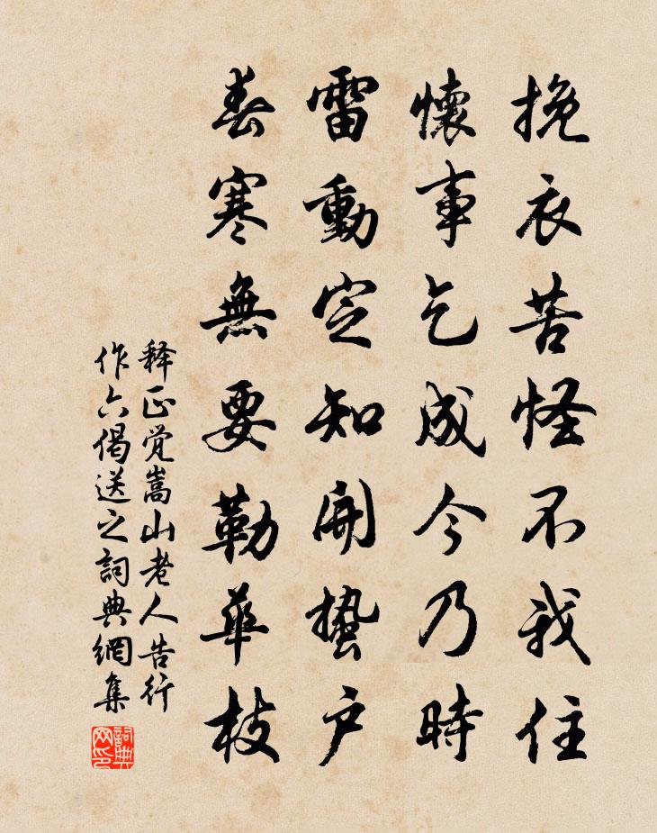 詩詞名句歷史字典書法欣賞書法字典國語詞典說文解字康熙字典古漢語字典標 題 作 者 詩 句 嵩山老人告行作六偈送之作者:釋正覺 朝代:宋代嵩山老人告行作六偈送之原文挽衣苦怪不我住,懷事乞成今乃時。雷動定知開蟄戶,春寒無要勒華枝。詩詞問答問:嵩山老人告行作六偈送之的作者是誰?答:釋正覺問:嵩山老人告行作六偈送之寫於哪個朝代?答:宋代釋正覺嵩山老人告行作六偈送之書法欣賞嵩山老人告行作六偈送之書法作品詩詞推薦寒拾贊釋智朋〔宋代〕放苕帚,對坐岩穴。眼看不亭,口說不歇。想得峨眉五台,無此一天明月。酬張法掾翼求侍養歸李復〔宋代〕少輕紈綺襲箕裘,力學從容與我謀。擇友卜商能勝賜,舞風曾點自殊由。去乘汴水春舟疾,行過龜山楚客留。千里贈別王十七管記高適〔唐代〕故交吾未測,薄宦空年歲。晚節蹤曩賢,雄詞冠當世。堂中皆食客,門外多酒債。產業曾未言,衣裘與人敝。飄颻昔游詩 其九姜夔〔宋代〕昔游桃源山,先次白馬渡。渡頭何清深,鴻鵠在高樹。白馬亦洞天,昔人有奇遇。洞門不可見,但聞水聲怒。瞻彼偈頌八十七首釋慧開〔宋代〕諸方浩浩,舉古明今。送人上樹,不是好心。南歌子(楚守周豫出舞鬟,因作二首贈之)蘇軾〔宋代〕紺綰雙蟠髻,雲欹小偃巾。輕盈紅臉小腰身。疊鼓忽催花拍、斗精神。空闊輕紅歇,風和約柳春。蓬山才調最清新贈王主簿詩 一謝朓〔南北朝〕日落窗中坐。紅妝好顏色。舞衣襞未縫。流黃覆不織。蜻蛉草際飛。游蜂花上食。一遇長相思。願寄連翩翼。寄衛別駕李山甫〔唐代〕曉屐歸來岳寺深,嘗思道侶會東林。昏沈天竺看經眼,蕭索淨名老病心。雲蓋數重橫隴首,苔花千點遍松陰。知君醉桃源王吉昌〔元代〕暗藏兩曜撫坤乾。綿綿細斡旋。扶持來往貫三田。還元五氣全。河車運,玉爐煎。炎炎結汞鉛。彩霞光襯晃禪天。玉樓春歐陽修〔宋代〕春山斂黛低歌扇。暫解吳鉤登祖宴。畫樓鍾動已魂銷,何況馬嘶芳草岸。青門柳色隨人遠。望欲斷時腸已斷。洛城寄題王亞夫檢正不啻足齋楊萬里〔宋代〕既得宮隴,復望宮蜀,未求宮寶劍先求玉。秦相後車一千谷,唐相宮八百斛。黃金肘邛駕黃鵠,身前佞佛身後福。葉集之舉士特唱和因次韻劉子翬〔宋代〕漂泊分攜後,囏難會面時。夜燈初獻酒,春草舊題詩。遊宦君雖厭,才名眾所期。不應和倦翼,寂寞戀南枝。瀑布鄭國輔〔宋代〕終日湍流怒作聲,憑欄便覺耳根清。龍君雅欲助奇觀,故把銀瓶瀉水晶。龍瑞宮張鎡〔宋代〕陽明古罅閟靈宮,禱雨傳聞見活龍。可是高人不留我,卻從歸路數杉松。莫愁村易士達〔宋代〕千古行人說莫愁,荒村依舊石城頭。不知艇子今何在,漢水滔滔空自流。酹江月·和友驛中言別文天祥〔宋代〕乾坤能大,算蛟龍元不是池中物。風雨牢愁無著處,那更寒蛩四壁。橫槊題詩,登樓作賦,萬事空中雪。江流如此淮上喜雨聊句蘇舜元〔宋代〕江淮經歲旱,春暮忽然雨。亂點逾廣津,散灑入原土。萬物氣稍蘇,厲妖莫能聚。群山洗故塵,紫翠坐可數。昏如偈頌二百零五首釋正覺〔宋代〕一枝秀出枬檀林,想見馨香慰眾心。不負老兄開鑿力,當風子和鶴鳴陰。山中懷仲兄樓鑰〔宋代〕雁山曾御九秋風,更喜春深到此中。芳草絕憐隨意綠,野花真是映山紅。未知方丈景何似,直恐桃源路已通。起聽釣魚蘇泂〔宋代〕是非不上釣魚舟,從此閒身得自由。一色藕花三十丈,明年歸住鑑湖頭。名句推薦淇園春竹美,軍宴日椎牛。司馬光《送龔章判官之衛州·新及第》 大成若缺,其用不弊。大盈若沖,其用不窮。老子《老子·德經·第四十五章》 雲中君不見,竟夕自悲秋。馬戴《楚江懷古三首·其一》 感此懷故人,中宵勞夢想。孟浩然《夏日南亭懷辛大》 秋草獨尋人去後,寒林空見日斜時。劉長卿《長沙過賈誼宅》 共眠一舸聽秋雨,小簟輕衾各自寒。朱彝尊《桂殿秋·思往事》 無言暗將紅淚彈闌珊,香銷輕夢還納蘭性德《河傳·春淺》 野竹分青靄,飛泉掛碧峰。李白《訪戴天山道士不遇》 聰以知遠,明以察微。司馬遷《史記·五帝本紀》 勿自暴,勿自棄。聖與賢,可馴致。李毓秀《弟子規·餘力學文》