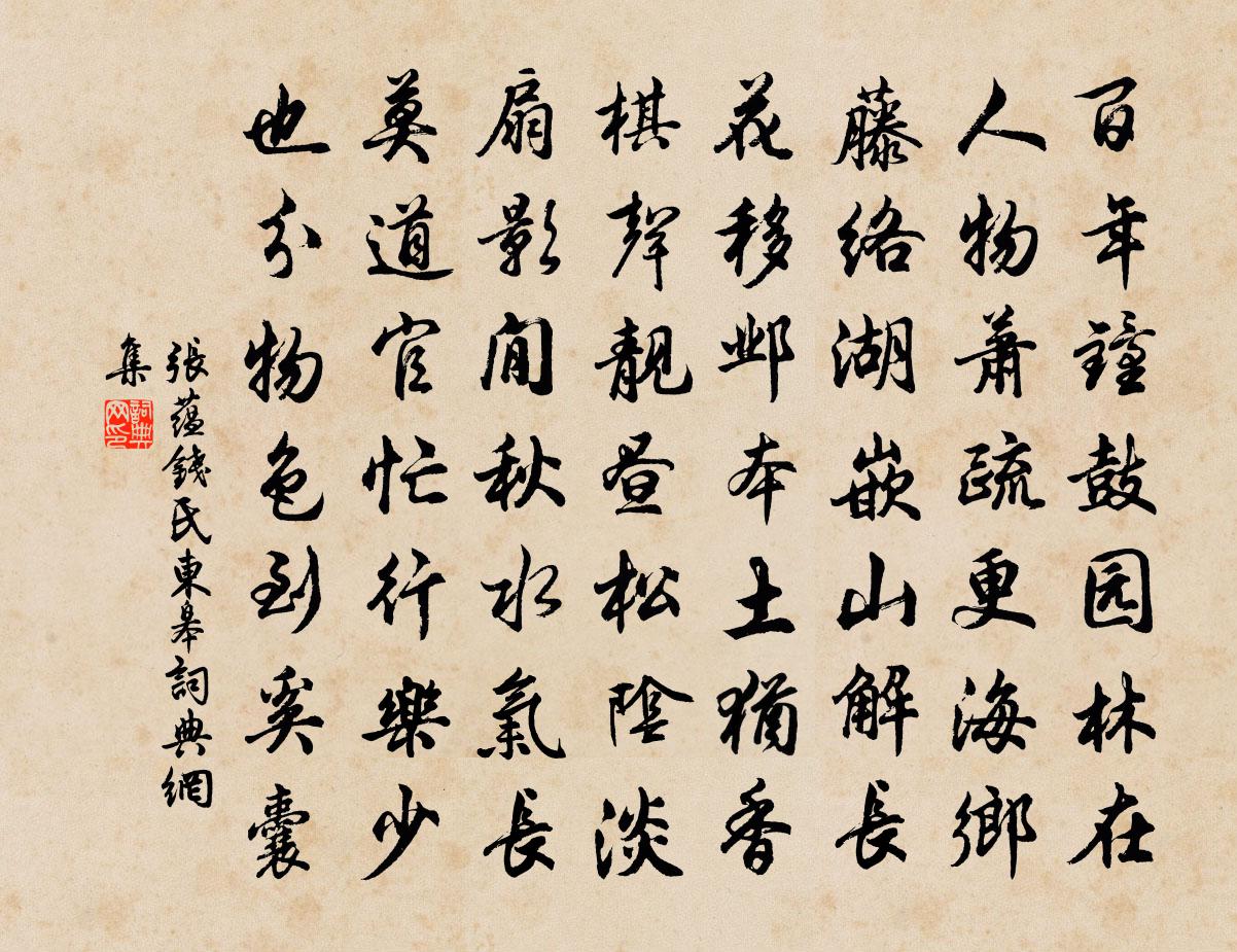 詩詞名句歷史字典書法欣賞書法字典國語詞典說文解字康熙字典古漢語字典標 題 作 者 詩 句 錢氏東皋作者:張蘊 朝代:宋代錢氏東皋原文百年鐘鼓園林在,人物蕭疏更海鄉。藤絡湖嵌山解長,花移鄴本土猶香。棋聲靚晝松陰淡,扇影閒秋水氣長。莫道官忙行樂少,也分物色到奚囊。詩詞問答問:錢氏東皋的作者是誰?答:張蘊問:錢氏東皋寫於哪個朝代?答:宋代張蘊錢氏東皋書法欣賞錢氏東皋書法作品詩詞推薦以山石條環趙昌甫交支廿八字陳文蔚〔宋代〕連城價重雖非玉,千古名存壽此山。野服閒居頗相稱,無端因得玩如環。句石仲元〔宋代〕地連錦野東西去,水接朱川次第來。句吳覺〔宋代〕燕頷英姿宜食肉,羊腸險韻宜剪茶。偈頌七十二首釋祖欽〔宋代〕語默俱忘非是非,聖凡情盡絕玄微。穿花蛺蝶深深見,點水晴蜓款款飛。贈醫齒道人宋自適〔宋代〕病欺年去故相加,要害先攻兩輔車。解後神工如掇拾,愧無樽酒對榴花。謁張相公祠呂夏卿〔宋代〕天以伊皋生百越,力回堯舜作開元。波濤漏網魚龍活,日月無光螮蝀昏。一自漁陽鼙鼓起,九重方憶老臣存。滿庭芳侯善淵〔元代〕生喜亡悲,虛勞塵世,許年多少傾危。是非成敗,榮辱兩虧衰。富足於身大患,貧窮又、遣我寒飢。急如個,不來送徐璣赴永州掾趙師秀〔宋代〕二水鴻飛外,君今問去程。家貧難擇宦,身遠易成名。入署梅花落,過汀蕙草生。莫因饒楚思,詞體失和平。禪人並化主寫真求贊釋正覺〔宋代〕廓然而瑩,了無餘影。卓爾而存,豈有他痕。靜非像也,徹見其源。動順緣也,萌發其根。用綿綿兮攪不渾。合宮歌佚名〔宋代〕太平時。寶殿垂衣治。馭左右賢俊,萬國執玉助祭。涼秋九月霜華飛。感發純孝,五室配上帝。紫漢入夜凝霽。房寄龍池寺貞空二上人賈島〔唐代〕受請終南住,俱妨去石橋。林中秋信絕,峰頂夜禪遙。寒草煙藏虎,高松月照雕。霜天期到寺,寺置即前朝。寄題吳伯豐同榮堂陳文蔚〔宋代〕一氣同流舉切身,胡然於此限比鄰。直須靜處工夫到,便覺閒中意思真。心遠獨游千載上,客來共醉一樽醇。寓形水調歌頭(丁未沿檄過穎壽)李曾伯〔宋代〕驟雨送行色,把劍渡長淮。西風咄咄怪事,吹不散煙霾。才是橙黃時候,早似梅邊天氣,寒意已相催。老子尚頑耐寄韓潮州愈賈島〔唐代〕此心曾與木蘭舟,直到天南潮水頭。隔嶺篇章來華岳,出關書信過瀧流。峰懸驛路殘雲斷,海浸城根老樹秋。一夕滿江紅楊炎正〔宋代〕筆染相思,暗題盡、朱門白壁。動離思、春生遠岸,煙銷殘日。楊柳結成羅帶恨,海棠染就胭脂色。想深情、幽怨次韻子瞻賦雪二首蘇轍〔宋代〕麥苗花出土正纖花纖,春早寒官令尚嚴。雲覆南山初半嶺,風乾東海舊花。來時瞬息平吞野,積久欹危欲敗檐。強海棠溪薛濤〔唐代〕春教風景駐仙霞,水面魚身總帶花。人世不思靈卉異,競將紅纈染輕沙。灑泉子潘閬〔宋代〕長憶西山。靈隱寺前三竺後。冷泉亭上幾行游。三伏似清秋。白猿時見攀高樹,長嘯一聲何處去。別來幾向畫圖看讀藝文志徐僑〔宋代〕所存諸子少知名,自古陳編浩莫程。未說合神老成子,誰傳談易杜田生。到頭法文那能廢,終久浮言自不行。只向春秋戰國門子貢周曇〔唐代〕救魯亡吳事可傷,誰令利口說田常。吳亡必定由端木,魯亦宜其運不長。名句推薦苦心豈免容螻蟻,香葉終經宿鸞鳳。杜甫《古柏行》 燕雁無心,太湖西畔隨雲去。姜夔《點絳唇·丁未冬過吳松作》 天將暮,雪亂舞,半梅花半飄柳絮。馬致遠《壽陽曲·江天暮雪》 少年易老學難成,一寸光陰不可輕。朱熹《偶成》 至今商女,時時猶唱,後庭遺曲。王安石《桂枝香·登臨送目》 御羅屏底翻歌扇,憶西湖、臨水開窗。吳文英《風入松·桂》 王濬樓船下益州,金陵王氣黯然收。劉禹錫《西塞山懷古》 君看六幅南朝事,老木寒雲滿故城。韋莊《金陵圖》 無智無以成奸,其智陰也。有善無以為奸,其知存也。來俊臣《羅織經·察奸卷第八》 碧水浩浩雲茫茫,美人不來空斷腸。李白《早春寄王漢陽》