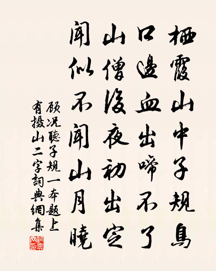 詩詞名句歷史字典書法欣賞書法字典國語詞典說文解字康熙字典古漢語字典標 題 作 者 詩 句 聽子規(一本題上有攝山二字)作者:顧況 朝代:唐代原文棲霞山中子規鳥,口邊血出啼不了。山僧後夜初出定,聞似不聞山月曉。詩詞問答問:《聽子規(一本題上有攝山二字)》的作者是誰?答:顧況問:該詩寫於哪個朝代?答:唐代書法欣賞聽子規(一本題上有攝山二字)書法作品注釋全唐詩:卷267_87詩詞推薦布袋贊釋可湘〔宋代〕未下生,先行腳。袋卻乾坤,簸弄自若。一汀流水白漫漫,杖子何曾探得著。奉和竟陵王藥名詩沈約〔南北朝〕丹草秀朱翹。重台架危岊。木蘭露易飲。射干枝可結。陽隰采辛夷。寒山望積雪。玉泉亟周流。雲華乍明滅。合歡又寄王立之黃庭堅〔宋代〕南人羈旅不成歸,夢繞南枝與北枝。安得孤根連夜發,要當雪月並明時。京東雜感二首佚名〔清代〕其一勝國巡遊地,孤城有廢宮。周垣春草外,園殿夕陽下。狐搰沙翻雪,鴟蹲樹嘯風。唯餘舊村落,雞犬似新豐。浮岡高似孫〔宋代〕山含宿凍未曾銷,鳥去仍回水路遙。千樹梅花三尺雪,一帆風力半江潮。邦衡再送二詩一和為甚酥二和牛尾貍周必大〔宋代〕追跡猶應怨獵徒,截肪何敢恨庖廚。鱠鱸湖上休夸玉,煮豆瓶中未是酥。伴食偏宜十字餅,先驅正賴一卮餬。卻因次韻晁元忠西歸十首黃庭堅〔宋代〕前有熊羆咆,後有虎豹號。已出澗谷底,更陟山阪高。五日一併食,十年一縕袍。未知歸宿處,豈憚鞍馬勞。驀山溪(桂花)万俟詠〔宋代〕芳菲葉底。誰會秋江意。深綠護輕黃,怕青女、霜侵憔悴。開分早晚,都占九秋天,花四出,香七里。獨步珠宮裡贊此庵元和尚二首釋曇華〔宋代〕十分畫獨相似,祗有一處謠訛。佛祖檢點不出,從教平地干戈。七愛詩贈程鄉令趙君唐魯山令元德秀蒲壽宬〔宋代〕吾愛元紫芝,卓爾不可移。盜虎孰小大,許辦虎歸屍。音樂第勝負,蔿於遭殊知。歲滿何所為,柴車一縑隨。長安龍圖陳學士寵示重陽日翠微樓上見覽拙詩魏野〔宋代〕斗城誰建翠微樓,富貴陳家小狀頭。和記從今為四絕,鳳毛玉筯與銀鉤。落梅慢/落梅佚名〔宋代〕帶煙和雪,繁枝澹佇,誰將粉融酥滴。疏枝冷蕊厭群芳,年年常占春色。江路溪橋謾倒,裊裊風中無力。暗香浮動酬別周從事二首白居易〔唐代〕腰痛拜迎人客倦,眼昏勾押簿書難。辭官歸去緣衰病,莫作陶潛范蠡看。洛下田園久拋擲,吳中歌酒莫留連。嵩陽鹿門寺裴說〔唐代〕鹿門山上寺,突兀盡無塵。到此修行者,應非取次人。鳥過驚石磬,日出礙金身。何計生煩惱,虛空是四鄰。臨江仙 壽聰山程文海〔元代〕海鶴松間襟韻,梅花雪後精神。皇家蓍蔡老元臣。彝常千載事,品物四時春。人道聰山毓秀,秀如嵩岳生申。壽身題錢舜舉寫生五首青瓜陳深〔宋代〕蒼然藍田姿,幽懷瑩冰雪。邂逅青門翁,曾救人間蠍。閨中詞胡仲參〔宋代〕聽盡芭蕉雨,愁人夜不眠。憑誰將此意,為妾到郎邊。偈頌六十七首釋原妙〔宋代〕三千世界作爐,百億須彌為炭。生鐵鑄就禪和,炙得通身紅爛。大觀聞喜宴六首佚名〔宋代〕多士濟濟,於彼西雍。欽肅威德,亦有斯容。函然來思,自西自東。天畏爾祿,惟王其崇。婆羅門/婆羅門引佚名〔宋代〕江南地暖,數枝先得嶺頭春。分付似、翦玉裁冰。素質偏憐勻澹,羞殺壽陽人。算多情留意,偏在東君。暗香旋生名句推薦多言數窮,不如守中。老子《老子·道經·第五章》 不知香積寺,數里入雲峰王維《過香積寺》 無一語,對芳尊。安排腸斷到黃昏。秦觀《鷓鴣天·枝上流鶯和淚聞》 萬條千縷綠相迎。舞煙眠雨過清明。晏幾道《浣溪沙·二月和風到碧城》 朱門酒肉臭,路有凍死骨。杜甫《自京赴奉先縣詠懷五百字 / 自京赴奉先詠懷五百字》 幼敏悟過人,讀書輒成誦。歐陽修《畫地學書》 了卻君王天下事,贏得生前身後名。辛棄疾《破陣子·為陳同甫賦壯詞以寄之》 杖劍對尊酒,恥為遊子顏。陸龜蒙《別離》 池上憑闌愁無侶。奈此個、單棲情緒。柳永《甘草子·秋暮》 望征路愁迷,離緒難整陸叡《瑞鶴仙梅》