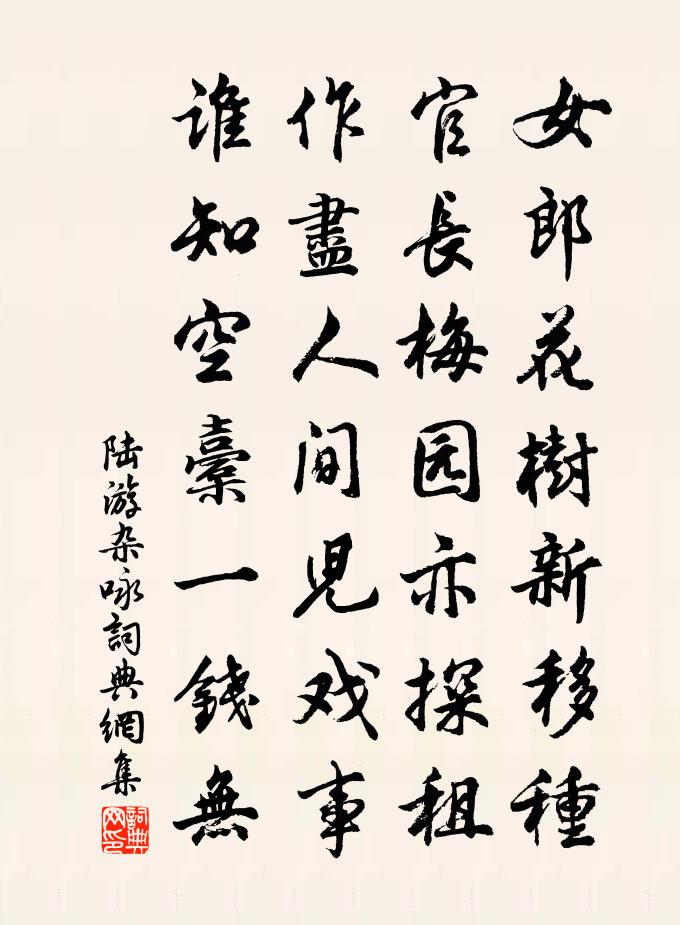 詩詞名句歷史字典書法欣賞書法字典國語詞典說文解字康熙字典古漢語字典標 題 作 者 詩 句 雜詠作者:陸游 朝代:宋代雜詠原文女郎花樹新移種,官長梅園亦探租。作盡人間兒戲事,誰知空橐一錢無?詩詞問答問:雜詠的作者是誰?答:陸游問:雜詠寫於哪個朝代?答:宋代問:陸游的名句有哪些?答:陸游名句大全陸游雜詠書法欣賞雜詠書法作品詩詞推薦和張倅湖上十絕姜特立〔宋代〕湖邊柳色媚清漣,湖上新荷疊綺錢。料得高人初出郭,眼中風物一醒然。頌古三十六首釋惟一〔宋代〕不堪提掇死貓頭,日炙風吹臭未休。底事罕逢人著價,只緣貴重世無儔。李才翁懶窩林憲〔宋代〕月華浴沆瀣,天容注琉璃。皎如大圓鏡,照徹清境暉。繁星斂芒曜,群動生霏微。塵世寧有此,玉虛樓觀低。南樓懷古五首周弼〔宋代〕茫茫迂曲度平川,何處孤村近水邊。煙護劉琮殘壁壘,雨沉黃祖舊樓船。寒沙細擁菰蘆地,破隴斜耕苜蓿田。見說少年游趙子發〔宋代〕曉山日薄半春陰。煙暖柳拖金。滿眼新晴,歌聲妝影,悠蕩碧雲心。閒庭客散人歸去,疏雨濕羅襟。樓閣濛濛,斷次韻答邢居實二首陳師道〔宋代〕漢庭用少公何在,不使群飛接羽翰。今代貴人須白髮,掛冠高處未宜彈。覽秀亭詩范仲淹〔宋代〕南陽有絕勝,城下百花洲。謝公創危亭,屹在高城頭。盡覽洲中秀,歷歷銷人憂。作詩刻金石,意垂千載休。我來地僻陸游〔宋代〕地僻臨湍瀨,門幽長綠苔。客書疑誤達,僧刺媿虛來。清露苹花坼,斜陽燕子回。自憐猶有恨,佳日對空罍。五音曲 宮引沈約〔南北朝〕八音資始。君五聲。興此和樂。感百精。優遊律呂。被鹹英。共友人看花羅鄴〔唐代〕愁將萬里身,來伴看花人。何事獨惆悵,故園還又春。和張菊存寄詩二首衛宗武〔宋代〕一紙飛雲端,驪珠得所難。句成春草夢,香帶古梅寒。願見期傾蓋,遠遊思整冠。乘流問陶逕,剩借菊吟看。水調歌頭(元日客寧都)趙長卿〔宋代〕離愁晚如織,托酒與消磨。奈何酒薄愁重,越醉越愁多。忍對碧天好夜,皓月流光無際,光影轉庭柯。有恨空垂淚十報恩 贈段先生 折段字起馬鈺〔元代〕公物外好生涯。火相逢結大砂。女盤桓看大藥。牛哮吼戲靈葩。雲鋪地丹爐赫,子觀天碧眼華。有三生君省悟,中雜詩曹植〔魏晉〕僕夫早嚴駕,吾行將遠遊。遠遊欲何之?吳國為我仇。將騁萬里途,東路安足由?江介多悲風,淮泗馳急流。願欲題五泄瀑布四首喻良能〔宋代〕玉龍千丈自夭矯,飛雨十里長廉纖。愚柳一見心眼爽,未須界圍觀水簾。春日衛宗武〔宋代〕化工溥至仁,生機運不停。榮觀遍原野,宇宙一丹青。挽黎致政文天祥〔宋代〕楚峰天地闊,四世百年家。鶴髮垂袍葉,龍孫上榜花。詩書新雨露,松柏老煙霞。白馬蒼山路,斯人忽已遐。縱步近村陸游〔宋代〕病去身輕試杖藜,滿村蕎麥正離離。照溪自嘆尚微瘦,趁渡人言殊未衰。草塞瓶頭沽濁酒,花篸笠頂引群兒。裴回寄魏少府賈島〔唐代〕來時乖面別,終日使人慚。易記卷中句,難忘燈下談。濕苔粘樹癭,瀑布濺房庵。音信如相惠,移居古井南。那日獲詣芳園竊見新栽叢竹蕭然可愛不能無詩李至〔宋代〕節節皆勻葉葉疏,相門翻似子猷居。狂根或帶移時土,細草應勞種後鋤。醒酒韻寒初愜意,出牆梢健已凌虛。不須名句推薦握手西風淚不乾,年來多在別離間。納蘭性德《於中好·送梁汾南還為題小影》 既生瑜,何生亮!羅貫中《三國演義·第五十七回》 等閒變卻故人心,卻道故人心易變。納蘭性德《木蘭花·擬古決絕詞柬友》 漢家天馬出蒲梢,苜蓿榴花遍近郊。李商隱《茂陵》 江漢曾為客,相逢每醉還。韋應物《淮上喜會梁川故人 / 淮上喜會梁州故人》 自知者不怨人,知命者不怨天。荀子《荀子·榮辱》 欲寄彩箋兼尺素,山長水闊知何處?晏殊《蝶戀花·檻菊愁煙蘭泣露》 誰分去來鄉國事,悽然,曾是承平兩少年。陳洵《南鄉子·己巳三月自郡城歸鄉過區菶吾西園話舊》 落魄江南載酒行,楚腰纖細掌中輕。杜牧《遣懷》 漠漠帆來重,冥冥鳥去遲。韋應物《賦得暮雨送李胄 / 賦得暮雨送李曹》