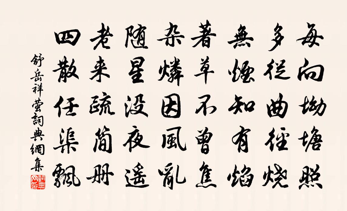 詩詞名句歷史字典書法欣賞書法字典國語詞典說文解字康熙字典古漢語字典標 題 作 者 詩 句 螢作者:舒岳祥 朝代:宋代螢原文每向坳塘照,多從曲徑燒。無煙知有焰,著草不曾焦。雜燐因風亂,隨星沒夜遙。老來疏簡冊,四散任渠飄。詩詞問答問:螢的作者是誰?答:舒岳祥問:螢寫於哪個朝代?答:宋代舒岳祥螢書法欣賞螢書法作品詩詞推薦幽居陸游〔宋代〕山園手栽花,日夜數花時。花開亦已落,一歡自無期。勸君強自娛,勿作兒女悲;春風染柳條,不染君鬢絲。過張祜處士丹陽故居顏萱〔唐代〕憶昔為兒逐我兄,曾拋竹馬拜先生。書齋已換當時主,詩壁空題故友名。豈是爭權留怨敵,可憐當路盡公卿。柴扉題任處士幽居朱慶餘〔唐代〕惜與幽人別,停舟對草堂。湖雲侵臥位,杉露滴茶床。山月吟時在,池花覺後香。生涯無一物,誰與讀書糧。廣陵別鄭處士高適〔唐代〕落日知分手,春風莫斷腸。興來無不愜,才在亦何傷。溪水堪垂釣,江田耐插秧。人生只為此,亦足傲羲皇。有言郡東北荊山下,可以溝畎積水,因與吳正蘇軾〔宋代〕側手區區豈易遮,奔流一瞬卷千家。共疑智伯初圍趙,猶有張湯欲漕斜。已坐迂疏來此地,分將勞苦送生涯。使君送宇文德濟解綿竹丞李流謙〔宋代〕陋哉紈綺習,染人甚脂膏。傾五湖三江,未易濯穢臊。冰霜竹林游,糞土戎與濤。富貴比貧賤,所去寧一毛。公家梁父吟於石〔宋代〕建安天下如潰瓜,一榻之外非吾家。黃屋飄颻定何許,龍為魚兮鼠為虎。老瞞持力敢欺天,朵頤漢鼎方垂涎。紫髯天津弊居蒙諸公共為成買作詩以謝邵雍〔宋代〕重謝諸公為買園,買園城裡占林泉。七千來步平流水,二十餘家爭出錢。嘉佑卜居終是僦,熙寧受券遂能專。鳳凰游東山丁謂〔宋代〕數峰迴抱隔煙林,一簇招提十里深。只合步行尋石徑,不宜呵喝入松陰。遙分畫手援毫意,暗起詩人得句心。梅嶺哭故人喬知之〔唐代〕生死久離居,淒涼歷舊廬。嘆茲三徑斷,不踐十年餘。古木巢禽合,荒庭愛客疏。匣留彈罷劍,床積讀殘書。玉沒王德言樞密生日十首曹勛〔宋代〕皇華臨遣下彤墀,雨臥風餐益自怡。口伐可汗初不識,得陪後乘始應知。新涼理故書有感二首劉克莊〔宋代〕□□先帝開宣室,頻領群儒上石渠。奏牘三千前日事,寓言十九暮年書。色空勘破偏盲久,記誦俱忘一載餘。西晉酬高郵知軍蔣殿丞見寄王禹偁〔宋代〕青雲豈望更翱翔,覽照唯添鬢雪光。為郡自知無政術,歸田猶擬拜封章。且眠錦帳趣蘭省,終掩雲關臥草堂。三入寄順適胡仲弓〔宋代〕標格因詩總不群,眼前餘子漫紛紛。江頭社裡新知已,文字行間舊識君。心事正須豪傑道,吟聲莫遣鬼神聞。歲寒悠然陳起〔宋代〕向來蓮社本遺榮,勾引淵明造道場。梵葉翻殘空佛印,念珠持久現圓光。秋花依約生涼意,暑雨微茫送夕陽。客退春雲怨(上巳·黃鍾商)馮偉壽〔宋代〕春風惡劣。把數枝香錦,和鶯吹折。雨重柳腰嬌困,燕子欲扶扶不得。軟日烘煙,乾風吹霧,芍藥荼弄顏色。簾幕送鄧善這翰林應奉並呈交代汪親家方回〔宋代〕海內師儒四十強,皋比一撤即鵷行。聲名久動黃金闕,相貌宜登白玉堂。真學士當專翰墨,寡言人定鎮岩廊。交承頌證道歌證道歌釋印肅〔宋代〕一顆圓光非內外,鎮海明珠今尚在。仰山不敢自埋藏,問著靈知當不昧。句勾台符〔宋代〕胚渾鑿開元精結,三十六峰排截嶭。題黃景文詩劉克莊〔宋代〕蚤穿草履行求友,晚閉柴荊病絕交。古德皆曾經棒喝,今人不肯事推敲。吟千萬首等蛩響,續三百篇無鳳膠。霍地名句推薦愛臣太親,必危其身;人臣太貴,必易主位。韓非及後人《韓非子·愛臣》 落葉人何在,寒雲路幾層。李商隱《北青蘿》 鳳凰城闕知何處,寥落星河一雁飛。賀鑄《思越人·紫府東風放夜時》 三杯通大道,一醉解千愁。佚名《增廣賢文·上集》 蠶娘洗繭前溪淥,牧童吹笛和衣浴。貫休《春晚書山家屋壁二首》 客思似楊柳,春風千萬條。王安石《壬辰寒食》 跬步不休,跛鱉千里;累積不輟,可成丘阜。劉安及其門客《淮南子·說林訓》 幾日喜春晴,幾夜愁春雨。高觀國《卜運算元·泛西湖坐間寅齋同賦》 首夏猶清和,芳草亦未歇。謝靈運《游赤石進帆海》 裊裊兮秋風,洞庭波兮木葉下。屈原《九歌·湘夫人》