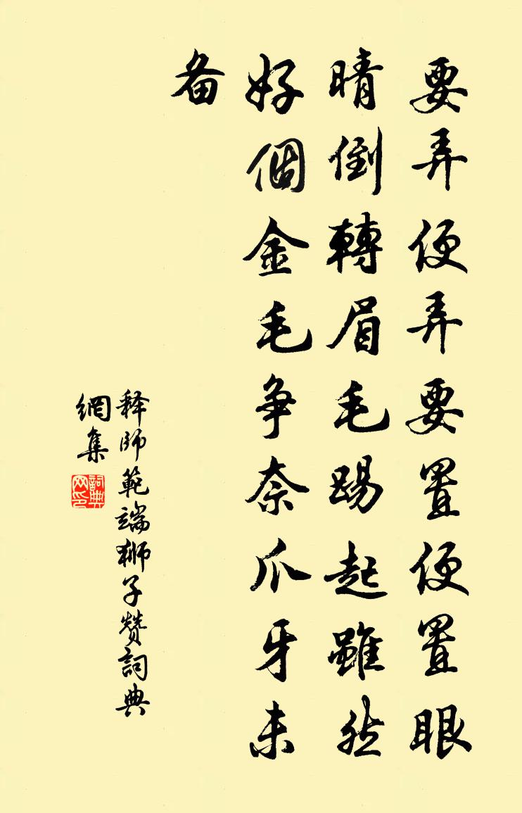 詩詞名句歷史字典書法欣賞書法字典國語詞典說文解字康熙字典古漢語字典標 題 作 者 詩 句 端獅子贊作者:釋師範 朝代:宋代端獅子贊原文要弄便弄,要置便置。眼晴倒轉,眉毛踢起。雖然好個金毛,爭奈爪牙未備。詩詞問答問:端獅子贊的作者是誰?答:釋師範問:端獅子贊寫於哪個朝代?答:宋代釋師範端獅子贊書法欣賞端獅子贊書法作品詩詞推薦王季文書堂陳岩〔宋代〕要學騎蟾主簿仙,休官直上九華巔。我來細讀碑間字,風葉時時一颯然。曲江白居易〔唐代〕細草岸西東,酒旗搖水風。樓台在花杪,鷗鷺下煙中。翠幄晴相接,芳洲夜暫空。何人賞秋景,興與此時同。句楊億〔宋代〕禰狂無自屈岑牟。次韻宋永兄感舊五首黃公度〔宋代〕猶憶當年歌畫空,乘歡直欲舉千鍾。韶光半老不相識,樂事一生能幾逢。戲蝶狂蜂隨意好,閒花蔓草向人濃。當壚夜宴安樂公主新宅劉憲〔唐代〕層軒洞戶旦新披,度曲飛觴夜不疲。綺綴玲瓏河色曉,珠簾隱映月華窺。仲夏賞月次雪齋韻司馬儼〔宋代〕世事故前定,冥符今夜圓。詩同人遇合,酒與月俱全。萬物自有數,一毫皆系天。人生莫惆悵,對景數招延。送張公儀宰安豐王安石〔宋代〕楚客來時雁為伴,歸期只待春冰泮。雁飛南北三兩回,回首湖山空夢亂。秘書一官聊 * ,安豐百里誰復嘆。揚鞭千秋歲(壽圓北山六十)彭子翔〔宋代〕重陽來未。誰領黃花意。斟玉醑,歌金縷。雲山籠瑞彩,風月溶清氣。北山頂,壽星一點光無際。六十今朝是。甲論詩三十首元好問〔金代〕望帝春心托杜鵑,佳人錦色怨華年。詩家總愛西崑好,獨恨無人作鄭箋。偈頌二百零五首釋正覺〔宋代〕檐頭雨滴聲,問你要惺惺。直下成己事,途中作主盟。剎剎見佛,塵塵出經。擘開華岳連天色,放出黃河到海聲。小閣閒坐白居易〔唐代〕閣前竹蕭蕭,閣下水潺潺。拂簟捲簾坐,清風生其間。靜聞新蟬鳴,遠見飛鳥還。但有巾掛壁,而無客叩關。二疏答秦十四校書(秦系)韋應物〔唐代〕知掩山扉三十秋,魚須翠碧棄床頭。莫道謝公方在郡,五言今日為君休。龍華山寺寓居十首王之望〔宋代〕作客他鄉久,宜人此界稀。身閒長挾策,地僻慣披衣。妻有虀鹽樂,兒因筍蕨肥。出門何所適,終日掩荊扉。獻所知張蠙〔唐代〕跡熟荀家見弟兄,九霄同與指前程。吹噓漸覺馨香出,夢寐長疑羽翼生。住僻驊騮皆識路,來頻鸚鵡亦知名。登龍出山相贊釋普寧〔宋代〕入山出山,何異何別。六年所成,一時漏泄。那堪滿口嚼冰雪。昭慶寺朱繼芳〔宋代〕幽尋得勝趣,城市幾人能。古柳深呂磬,長廊盡處燈。畫龍聽說法,塑佛看齋僧。別寺經行遍,茲游昔未曾。酬雍秀才二首殷堯藩〔唐代〕晚市人煙合,歸帆帶夕陽。棲遲未歸客,猶著錦衣裳。臥病茅窗下,驚聞兩月過。興來聊賦詠,清婉逼陰何。兔宋祁〔宋代〕脫兔馳岡地,飢鷹厲吻天。為煩麋狗顧,遂給獸人鮮。狂目兼槐落,驚毫共月捐。可嗟多狡穴,歸肉助庖羶。夏五月方閔雨忽大風雨三日未止陸游〔宋代〕五月晝晦天欲雨,街中人面不相睹。風聲撼山翻怒濤,雨點飛空射強弩。一雨三日姑可休,龍其玩珠歸故湫。千里次韻前人雪中陳著〔宋代〕晚風吹下六花祥,喜到眉閒色淺黃。旋積層寒消夙瘴,平施一白洗時妝。要尋閉戶家形跡,肯為乘騅客斷腸。歲事名句推薦人生何事須聚畜,一身之 外亦復何須。李大師、李延壽《南史·列傳·卷三十三》 千尋鐵鎖沉江底,一片降幡出石頭。劉禹錫《西塞山懷古》 敵未滅,何以家為?脫脫《宋史·列傳·卷一百二十四》 可憐報國無路,空白一分頭。楊炎正《水調歌頭·登多景樓》 侯門一入深如海,從此蕭郎是路人。崔郊《贈去婢》 錦里開芳宴,蘭缸艷早年。盧照鄰《十五夜觀燈》 浴不必江海,要之去垢;馬不必騏驥,要之善走。司馬遷《史記·外戚世家》 若對黃花孤負酒,怕黃花、也笑人岑寂。劉克莊《賀新郎·九日》 繡嶺宮前鶴髮翁,猶唱開元太平曲李洞《繡嶺宮詞》 來歲花前。又是今年憶去年。呂本中《減字木蘭花·去年今夜》