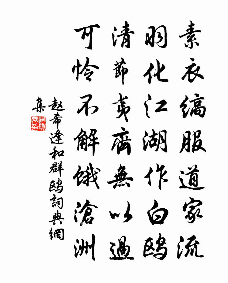 詩詞名句歷史字典書法欣賞書法字典國語詞典說文解字康熙字典古漢語字典標 題 作 者 詩 句 和群鷗作者:趙希逢 朝代:宋代和群鷗原文素衣縞服道家流,羽化江湖作白鷗。清節夷齊無以過,可憐不解餓滄洲。詩詞問答問:和群鷗的作者是誰?答:趙希逢問:和群鷗寫於哪個朝代?答:宋代趙希逢和群鷗書法欣賞和群鷗書法作品詩詞推薦菩薩蠻朱敦儒〔宋代〕鄉關散盡當年客。春風寂寞花無色。長日掩重門。江山眼外昏。畫圖高掛壁。嵩少參差碧。想見臥雲人。松黃落洞重陽後三日猶熱多病者死者方回〔宋代〕重陽已過兩三日,真好菊花全未開。合已樓前橫雁字,卻於地上洶蚊雷。爬搔最苦瘡瘍癢,擗踴時聞哭泣哀。南客雜詩王季友〔唐代〕采山仍采隱,在山不在深。持斧事遠遊,固非匠者心。翳翳青桐枝,樵爨日所侵。斧聲出岩壑,四聽無知音。豈為上下驛磯陳造〔宋代〕湖陰數裡間,山麓矻兩磯。磯麓突江出,禹功不及施。千古妨行舟,死生系毫釐。我昔步磯上,雨歇暑氣微。驚湍題桃花夫人廟杜牧〔唐代〕細腰宮裡露桃新,脈脈無言幾度春。至竟息亡緣底事?可憐金谷墮樓人。暮歸蘇軾〔宋代〕牛羊久已下,寂寞掩柴扉。水鵲鳴城堞,飛螢上戟衣。夜涼江海近,天闊鬥牛微。何日招舟子,寒江北渡歸。奏宣列之樂歌舞江淹〔南北朝〕殷崇配天。周尊明祀。瑞合汾陰。慶同泰畤。青幕雲舒。丹殿霞起。二曜惟新。五精告始。於以享之。景福是履。和人元夕王之望〔宋代〕長安百尺朱樓高,傳籌夜酬聞雞號。金吾馳禁玉漏永,九衢遍走狂歡遨。訪尋三曲選清唱,交結五陵皆大豪。笑將晚立西湖惠照寺石橋上楊萬里〔宋代〕船於鏡面入煙叢,寺在湖心更柳中。暮 * 來吾欲去,其如南北兩高峰。玉樓春錢惟演〔宋代〕錦籜參差朱檻曲。露濯文犀和粉綠。未容濃翠伴桃紅,已許纖枝留鳳宿。嫩似春荑明似玉。一寸芳心誰管束。勸君翠微寺葉秀髮〔宋代〕茫茫宇宙幾分離,晚識真人歷數歸。五閏都無半義土,清風千古一 * 。題蘇端明書乳泉賦後陳仁玉〔宋代〕坡翁謫海上,人傳已仙去。道逢章子厚,遄復返塵路。至言想世驚,獨閟乳泉賦。遙憐嵩山丘,千古不可駐。出海文天祥〔宋代〕一團蕩漾水晶盤,四畔青天作護闌。著我扁舟了無礙,分明便作混淪看。水天一色玉空明,便似乘槎上太清。我愛戊申年七夕五絕楊億〔宋代〕玉女壺傾笑電頻,白榆晴影接星津。神光奕奕雲容薄,誰見淩波襪起塵。別張袁州五首彭龜年〔宋代〕平生學不力,莫移資稟偏。疏愚寡周防,戇直絀巧諞。出身仕官府,何幸依仁賢。樸樕本無庸,刻畫幾成妍。江湖木蘭花慢辛棄疾〔宋代〕路傍人怪問,此隱者、姓陶不。堪 * 如雲,朝吟暮醉,喚不回頭。縱無酒成悵望,只東籬、搔首亦風流。與客朝偈頌一百一十七首釋紹曇〔宋代〕人從雪峰來,接得乳峰信。郎忙攔摟精神,念一道離怖畏真言,南無三滿多,沒馱喃,唵部齡,唵齒齡。吽吽,急句范祖禹〔宋代〕會老名堂清潁上,禮賢開館大河濱。喜侯十七校書見訪耿湋〔唐代〕東城獨屏居,有客到吾廬。發廩因舂黍,開畦復剪蔬。許酣令乞酒,辭窶任無魚。遍出新成句,更通未悟書。藤絲醉蓬萊(丁亥壽蜀帥)李曾伯〔宋代〕有擎天一柱,殿角西頭,手扶宗祐。萬里魚鳧,倚金城山立。亭障驚沙,氈裘捲地,倏度黃龍磧。玉帳從容,招搖名句推薦奢侈者鮮有不敗李大師、李延壽《南史·列傳·卷四十五》 習俗移志,安久移質。荀子《荀子·儒效》 百囀千聲隨意移,山花紅紫樹高低。歐陽修《畫眉鳥》 慎厥身,修思永。佚名《尚書·虞書·皋陶謨》 江闊雲低、斷雁叫西風。蔣捷《虞美人·聽雨》 窗間梅熟落蒂,牆下筍成出林。范成大《喜晴》 錦里開芳宴,蘭缸艷早年。盧照鄰《十五夜觀燈》 普天皆滅焰,匝地盡藏煙。沈佺期《寒食》 惟德動天,無遠弗屆。佚名《尚書·虞書·大禹謨》 遙憐故園菊,應傍戰場開。岑參《行軍九日思長安故園》