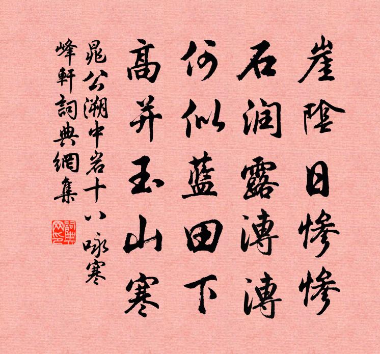 詩詞名句歷史字典書法欣賞書法字典國語詞典說文解字康熙字典古漢語字典標 題 作 者 詩 句 中岩十八詠寒峰軒作者:晁公溯 朝代:宋代中岩十八詠寒峰軒原文崖陰日慘慘,石潤露漙漙。何似藍田下,高並玉山寒。詩詞問答問:中岩十八詠寒峰軒的作者是誰?答:晁公溯問:中岩十八詠寒峰軒寫於哪個朝代?答:宋代晁公溯中岩十八詠寒峰軒書法欣賞中岩十八詠寒峰軒書法作品詩詞推薦題燕邸洋川公養浩堂畫二首黃庭堅〔宋代〕蕭寺吟雙竹,秋醪薦二螯。破塵歸騎速,橫日雁行高。璉監寺1釋紹曇〔宋代〕烹金爐里脫胚{左車右軍},妙斲初無爺鑿痕。汝質自成瑚璉器,我儂甘作破沙盆。萬年歡(榮國生日)張綱〔宋代〕歲晚寒凝,正蓂舒四葉,梅吐孤芳。慶誕佳辰,開筵盛集萱堂。合坐春回錦繡,捲簾處、花簇笙簧。除樂禁、初許鐵壁釋慧開〔宋代〕巍然一座黑金城,縫罅全無及戶扃。堪笑英雄難進步,聖凡到此絕途程。浣溪沙(自適)蘇軾〔宋代〕傾蓋相逢勝白頭。故山空復夢松楸。此心安處是菟裘。賣劍買牛吾欲老,乞漿得酒更何求。願為辭社宴春秋。茶歌白玉蟾〔宋代〕柳眼偷看梅花飛,百花頭上東風吹。壑源春到不知時,霹靂一聲驚曉枝。枝頭未敢展鎗旗,吐玉綴金先獻奇。雀舌送趙正甫孫相湘陰趙汝回〔宋代〕行舟何所有,新酒滿瓷瓶。若使三閭飲,終應一念醒。官卑掌苗籍,吟苦掩松廳。清夢如湘水,遙通春草亭。和段相公登武擔寺西台姚康〔唐代〕松徑引清風,登台古寺中。江平沙岸白,日下錦川紅。疏樹山根淨,深雲鳥跡窮。自慚陪末席,便與九霄通。長沙勸耕真德秀〔宋代〕健訟翻成產禍胎,帶刀卻是殺身媒。爭先好勝災偏速,退步饒人福自來。浯溪林訪〔宋代〕文士相輕自古然,堪嗟嘲詠費雕鐫。元顏文筆非餘子,示可毛疵議昔賢。黃檗送花化主釋崇岳〔宋代〕百草頭邊法戰時,鑰旗未展露全威。直饒陸羽知端的,也落吾家第二機。往復無間釋重顯〔宋代〕日出卯,萬國香花競頭走。邯鄲學步笑傍觀,豈知凶禍逐其後。西江月史達祖〔宋代〕西月澹窺樓角,東風暗落檐牙。一燈初見影窗紗。又是重簾不下。幽思屢隨芳草,閒愁多似楊花。楊花芳草遍天涯暑雨陸游〔宋代〕草茂水長蛙群鳴,窪深路壤人斷行。故侯老退守瓜壟,翠蔓黃花偏眼明。王龍圖知江陵梅堯臣〔宋代〕捧詔出荊州,天心寄遠憂。行車殘殘雪,寒色犯輕裘。祖軷山川閣,歌驪道路愁。吏迎多越乘,兵衛粲吳鉤。地與宿趙山采別業唐彥謙〔唐代〕溪山兵後縣,風雪旅中人。迫夜愁嚴鼓,沖寒托軟巾。摧藏名字在,疏率饌殽真。今代徐元直,高風自可親。題環碧亭李石〔宋代〕十里漣漪陸瑁湖,一亭幽絕重先居。雲根數朵排青闥,泉沫雙流濺綠裾。竹鎖斷橋飛雁鶩,荷侵涼檻蔭龜魚。洛園晨起裴吳二直講過門雲鳳閣韓舍人物故作五梅堯臣〔宋代〕昨時賓晏地,今見繐緯遮。棲室那因鵬,從杯不為蛇。曾無越人術,竟起漢臣嗟。明日東城陌,悲涼後部笳。哭吳耀遠王炎〔宋代〕孤陋無如我,交親賴有君。方圖來往數,豈意死生分。自卜牛眠地,今歸馬鬣墳。不能澆斗酒,忍遽述銘文。歲晚感事宋庠〔宋代〕榮路冥煩客,腳踏車寂寞州。野氛連市漲,寒水夾城流。塞上真亡馬,江邊獨信鷗。不知芳歲晚,霜雪上人頭。名句推薦赤闌橋盡香街直,籠街細柳嬌無力。陳克《菩薩蠻·赤闌橋盡香街直》 欲持一瓢酒,遠慰風雨夕。韋應物《寄全椒山中道士》 泉眼無聲惜細流,樹陰照水愛晴柔楊萬里《小池》 內外相應也,言行相稱韓非及後人《韓非子·解老》 東籬把酒黃昏後,有暗香盈袖。李清照《醉花陰·薄霧濃雲愁永晝》 路逢俠客須呈劍,不是才人莫獻詩。佚名《增廣賢文·上集》 夢回人遠許多愁,只在梨花風雨處。辛棄疾《玉樓春·風前欲勸春光住》 天地有正氣,雜然賦流形。文天祥《正氣歌》 全一人者德之輕,拯天下者功之重房玄齡《晉書·帝紀·第三章》 竹外一枝斜,想佳人,天寒日暮。曹組《驀山溪·梅》