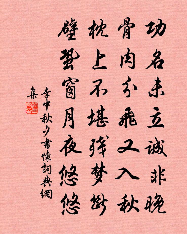 詩詞名句歷史字典書法欣賞書法字典國語詞典說文解字康熙字典古漢語字典標 題 作 者 詩 句 秋夕書懷作者:李中 朝代:唐代秋夕書懷原文功名未立誠非晚,骨肉分飛又入秋。枕上不堪殘夢斷,壁蛩窗月夜悠悠。詩詞問答問:秋夕書懷的作者是誰?答:李中問:秋夕書懷寫於哪個朝代?答:唐代問:秋夕書懷是什麼體裁?答:七絕李中秋夕書懷書法欣賞秋夕書懷書法作品注釋全唐詩:卷747-64詩詞推薦富陽道中遇風感嘆作趙蕃〔宋代〕回首江山舊,他年來往頻。人誰無一飽,汝獨值多辛。泛泛將何在,悠悠愧此身。懷哉松與菊,白露及時新。紹興祀皇地祗十五首佚名〔宋代〕於穆媼神,媲德彼天。我修毖祀,以莫不虔。肆陳時夏,乾羽相宣。靈其來游,降福綿綿。過臞庵趙師魯〔宋代〕竹木清華處,林亭曲折開。泉聲經雨雜,石勢學雲頹。留客煮新茗,敲泥啟舊醅。子猷去已久,信宿為誰來。舅氏自壽陽由京師歸安陸宋祁〔宋代〕道舊欣來駕,銷魂遽遠離。顛毛同白日,俗眼暫青時。客飯稽留數,齋醪酪酊遲。風波須畏險,老大共餘悲。楚莽再次前韻黃庭堅〔宋代〕酒有全功筆有神,可將心付白頭新。春盤一任人爭席,莫道前銜是近臣。偈頌一百三十六首釋惟一〔宋代〕六年雪嶺竟無成,練得身形似鶴形。盡謂見明星悟道,何曾悟道見明星。入山何富,出山何貧,知心能幾人。行園樹徐鉉〔唐代〕松節凌霜久,蓬根逐吹頻。群生各有性,桃李但爭春。三峰王耿殿丞將移陝下通理先已同袁刑部以唱魏野〔宋代〕蜀出多才信不虛,淹翔猶未佩銀符。民間惠愛應長有,馬上歌詩豈暫無。休話卜鄰來草澤,即看得路去蓬壺。申湖游鵲山院陳師道〔宋代〕積石橫成嶺,行楊密映門。人聲隱林杪,僧舍遶雲根。頓攝塵緣盡,方知象教尊。只應羊叔子,名字與山存。安平樂/安平樂慢佚名〔宋代〕開瓊筵,慶佳辰。彩帟當中月華明。笙歌樂、如夢幻,望丹山彩鳳,飛舞邃庭。遐艷異、壽杯同斟。抃舞謳歌浹歡傳使君安道再有治莆之命取道城外還泉南得來林光朝〔宋代〕何事風流舊使君,江邊聽說下朱旛。逢迎要問平津邸,準擬來呼垤澤門。竹馬已喧明月浦,籃輿卻出杏花村。不在寄張欽夫知嚴州釋寶曇〔宋代〕試與專城定著勛,何曾閒冷坐忘君。舊來雲夢元無際,此段風流獨有聞。世故自憐生仲達,人誰不念故將軍。等閒辛巳夏四月行西山欲未能也得曹滬南壬午冬留洪咨夔〔宋代〕朝陽生危岑,委光皂江壖。江妃舞倒景,老木奔驚猿。群仙亦戲劇,挹袂來聯翩。笑倒天地間,誰虧復誰全。手攜臨江仙·高詠楚詞酬午日陳與義〔宋代〕高詠楚詞酬午日,天涯節序匆匆。榴花不似舞裙紅。無人知此意,歌罷滿簾風。萬事一身傷老矣,戌葵凝笑牆東。餞王晙巡邊李隆基〔唐代〕振武威荒服,揚文肅遠墟。金壇申將禮,玉節授軍符。免胄三方外,銜刀萬里余。昔時吳會靜,今日虜庭虛。分閫書會別亭王安石〔宋代〕西城路,居人送客西歸處。年年借問去何時,今日扁舟從此去。春風吹花落高枝,飛來飛去不自知。路上行人亦如再答景叔黃庭堅〔宋代〕女三為粲當獻王,三珍同盤乃得嘗。甘泉下澆藜莧腸,令我詩句挾風霜。小人食珍敢取足,都城一飯炊白玉。賜錢贈李子揚胡寅〔宋代〕洛社看花各妙年,那知關塞起狼煙。舊遊只有山川在,佳政時聞嶺峰傳。對酒鮮歡吾老矣,登高能賦子依然。不忘皇雅十首《西師》六章尹洙〔宋代〕矯矯虎士,載摧其壁。於嗟孟侯,亦果其策。迎師而降,靡抗鋒鏑。豈獨身謀,完是宗國。章梓州橘亭餞成都竇少尹(得涼字)杜甫〔唐代〕秋日野亭千橘香,玉盤錦席高雲涼。主人送客何所作,行酒賦詩殊未央。衰老應為難離別,賢聲此去有輝光。預傳名句推薦昔日芙蓉花,今成斷根草。李白《妾薄命》 多情卻似總無情,唯覺樽前笑不成。杜牧《贈別》 兵家勝敗真常事,卷甲重來未可知。羅貫中《三國演義·第十二回》 父母威嚴而有慈,則子女畏慎而生孝矣。顏之推《顏氏家訓·教子篇》 靜女其孌,貽我彤管。佚名《靜女》 奇卓異非至人,至人只是常。洪應明《菜根譚·概論》 闌風伏雨催寒食,櫻桃一夜花狼藉。納蘭性德《菩薩蠻·闌風伏雨催寒食》 半死梧桐老病身,重泉一念一傷神。白居易《為薛台悼亡》 揮手自茲去,蕭蕭班馬鳴。李白《送友人》 寒蟬鳴處,回首斜陽暮。趙彥端《點絳唇·途中逢管倅》