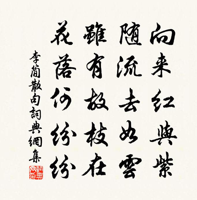 詩詞名句歷史字典書法欣賞書法字典國語詞典說文解字康熙字典古漢語字典標 題 作 者 詩 句 句作者:李簡 朝代:宋代句原文向來紅與紫,隨流去如雲。雖有故枝在,花落何紛紛。詩詞問答問:句的作者是誰?答:李簡問:句寫於哪個朝代?答:宋代李簡句書法欣賞句書法作品詩詞推薦長沙臘月雷是日約宴趙帥俊臣聞雷乃罷越三日陳傅良〔宋代〕民欲遮留上欲來,政聲無間到輿台。道迎和氣收蠻瘴,彈壓余陰蟄楚雷。已是因風成柳絮,會須逐馬見銀杯。一觴真宗告鄉六首真宗〔宋代〕欽崇太霄,肅奉徽冊。大禮克誠,鴻獻有赫。令芳爰牙,明靈斯格。照謝垂祥,永懷何極。雨中同鄒德飯白雲庵韓元吉〔宋代〕懶惰已成癖,幽尋湖上台。應知千里近,動作半年來。一徑草仍碧,兩山梅未開。猶憐沖雨濕,路入亂雲堆。春日即事二首項安世〔宋代〕拂拂水紋亂,陰陰花氣芳。輕霏入平野,小雨渡橫塘。柳色未全綠,草根猶半黃。春容不可狀,欲脫意還忘。偶成曹彥約〔宋代〕桃紅柳綠簇春華,燕語鶯啼盡日嘉。誰信聲聲沂水詠,又知處處杏支家。猿杜牧〔唐代〕月白煙青水暗流,孤猿銜恨叫中秋。三聲欲斷疑腸斷,饒是少年須白頭。閒居雜詠三十二首智陳淳〔宋代〕智者人之燭,於我非外鑠。清明本在躬,無容自昏濁。寄周晉仙蘇泂〔宋代〕四海周風子,推敲孰似渠。官應憎骨相,老不上髭鬚。醉帽欹花落,吟身信杖扶。相思不相見,梅樹雨鳩呼。已亥雜詩 251龔自珍〔清代〕盤堆霜實擘庭榴,紅似相思綠似愁。今夕靈飛何甲子,上清齋設記心頭。繳回友人轉示詩卷張煒〔宋代〕拾得驪珠不秘藏,來尋識眼共平章。臨風一盼留書架,夜夜豪光射竹房。平山堂杜東〔宋代〕平山堂下水雲重,孤笛淒涼淡月中。不見龍蛇飛素壁,只科狐兔戍離宮。仙翁已逐風流盡,世事俱隨夢幻空。廣武次韻和再拜梅堯臣〔宋代〕建溪茗株成大樹,頗殊楚越所種茶。先春喊山掐白萼,亦異鳥觜蜀客夸。烹新斗硬要咬盞,不同飲酒爭畫蛇。從揉惜花張籍〔唐代〕濛濛庭樹花,墜地無顏色。日暮東風起,飄揚玉階側。殘蕊在猶稀,青條聳復直。為君結芳實,令君勿嘆息。同年楊謹仲教授生日周必大〔宋代〕載酒過門欲壽公,酒杯有限壽無窮。玉樽只在天西北,不惜年年為一中。送古山人李覯〔宋代〕喜聞吉事怕聞凶,天下人心處處同。乍出山來言語拙,莫將刺字謁王公。奉和太府韋卿閣老左藏庫中假山之作權德輿〔唐代〕春山仙掌百花開,九棘腰金有上才。忽向庭中摹峻極,如從洞裡見昭回。小松已負乾霄狀,片石皆疑縮地來。都內送方添粹劉克莊〔宋代〕忠惠橫經地,今將五十秋。諸生迎謁廟,吾子往監州。吏散齋堂靜,朋來鄭校修。勿嫌員外置,風月滿鴻溝。送楊錄事充潼關判官(得江字。一作充使)岑參〔唐代〕夫子方寸里,秋天澄霽江。關西望第一,郡內政無雙。狹室下珠箔,連宵傾玉缸。平明猶未醉,斜月隱書窗。水龍吟辛棄疾〔宋代〕詞,為賦水龍吟。薌林侍郎向公告老所居,高宗皇帝御書所賜名也,與盤園相併雲斷崖千丈孤松,掛冠更在松高處鄉飲酒唱和詩張肅〔宋代〕位分南北與東西,曠典才修俗頓移。樂合鸞皇下庭宇,觶揚虎蜼伏樽彝。頭顱如許堪殊席,筋力無多奈縟儀。敢昧名句推薦一切都是命,半點不由人。佚名《增廣賢文·上集》 瘦雪一痕牆角,青子已妝殘萼。王庭筠《謁金門·雙喜鵲》 不盡眼中青,是愁來時節張元乾《石州慢·寒水依痕》 那堪好風景,獨上洛陽橋。李益《上洛橋》 勝概日相與,思君心鬱陶。岑參《鞏北秋興寄崔明允》 更深人去寂靜,但照壁孤燈相映。周邦彥《關河令·秋陰時晴漸向暝》 朔風如解意,容易莫摧殘。崔道融《梅花》 向露冷風清,無人處,耿耿寒漏咽。周邦彥《浪淘沙慢·曉陰重》 是故置本不安者,無務豐末。墨子《墨子·02章 修身》 燕歌未斷塞鴻飛,牧馬群嘶邊草綠。李益《塞下曲·其一》