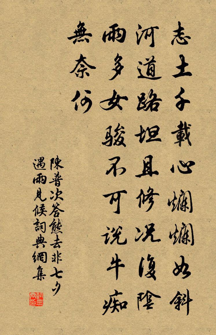 詩詞名句歷史字典書法欣賞書法字典國語詞典說文解字康熙字典古漢語字典標 題 作 者 詩 句 次答熊去非七夕遇雨見候作者:陳普 朝代:宋代次答熊去非七夕遇雨見候原文志土千載心,爛爛如斜河。道路坦且修,況復陰雨多。女駿不可說,牛痴無奈何。詩詞問答問:次答熊去非七夕遇雨見候的作者是誰?答:陳普問:次答熊去非七夕遇雨見候寫於哪個朝代?答:宋代陳普次答熊去非七夕遇雨見候書法欣賞次答熊去非七夕遇雨見候書法作品詩詞推薦木蘭花慢 送陳石泉自北歸 志雅堂雜鈔陳參政〔元代〕北歸人未老,喜依舊,著南冠。正雪暗滹沱,雲迷芒碭,夢落邯鄲。鄉心促、日行萬里,幸此身、生入玉門關。多七月過孤山勤上人院蔡襄〔宋代〕青林藹藹日暉暉,薄晚涼生暑氣微。湖上清風如可載,畫船十隻不空歸。至日方岳〔宋代〕至日觀書不幾行,梅梢橫影月昏黃。漢家紅影無人見,未必曾添一線長。宿普濟寺劉得仁〔唐代〕京寺數何窮,清幽此不同。曲江臨閣北,御苑自牆東。廣陌車音急,危樓夕景通。亂峰沉暝野,毒暑過秋空。幡颺華清宮感舊王建〔唐代〕塵到朝元邊使急,千官夜發六龍回。輦前月照羅衫淚,馬上風吹蠟燭灰。公主妝樓金鎖澀,貴妃湯殿玉蓮開。有時觀梅至花涇高端叔解元見尋陸游〔宋代〕春暖山中雲作堆,放翁艇子出尋梅。不須問訊道傍叟,但覓梅花多處來。鄒衍谷李白〔唐代〕燕谷無暖氣,窮岩閉嚴陰。鄒子一吹律,能回天地心。喜雨方回〔宋代〕驟漲階前可泛舟,天低近屋火雲收。竹戶紙窗清灑灑,葛衫紗帳冷修修。秋館梧桐羈客恨,春郊楊柳少年愁。移得贈周山人陳深〔宋代〕郭范寥寥數百年,地仙還復出人間。豁開天外一雙目,看盡江南千萬山。玉指暗攢鳥兔定,金盤活捉虎龍環。我今由桂林朔灕江至興安袁枚〔清代〕江到興安水最清,青山簇簇水中生。分明看見青山頂,船在青山頂上行。夏秋之交小舟早夜往來湖中絕句陸游〔宋代〕夢筆橋東夜繫船,殘燈耿耿不成眠。千年未息靈胥怒,捲地潮聲到枕邊。寓居定惠院之東雜花滿山有海棠一株土人不知貴也蘇軾〔宋代〕江城地瘴蕃草木,只有名花苦幽獨。嫣然一笑竹籬間,桃李漫山總粗俗。也知造物有深意,故遣佳人在空谷。自然水龍吟(用見山韻餞別)吳文英〔宋代〕夜分溪館漁燈,巷聲乍寂西風定。河橋徑遠,玉簫吹斷,霜絲舞影。薄絮秋雲,澹蛾山色,宦情歸興。怕煙江渡後酹江月/念奴嬌 淮城感興張紹文〔宋代〕舉杯呼月,問神京何在,淮山隱隱。撫劍頻看勳業事,惟有孤忠挺挺。宮闕腥膻,衣冠淪沒,天地憑誰整。一枰棋冉溪柳宗元〔唐代〕少時陳力希公侯,許國不復為身謀。風波一跌逝萬里,壯心瓦解空縲囚。縲囚終老無餘事,願卜湘西冉溪地。卻學和利州鮮于轉運公劇八詠間燕亭司馬光〔宋代〕吏治正倥傯,夫君何燕間。蠶絲既雲寡,符移皆可刪。印封人事散,躡屐升東山。放杖坐危亭,清嘯出去間。無私晚燕白居易〔唐代〕百鳥乳雛畢,秋燕獨蹉跎。去社日已近,銜泥意如何。不悟時節晚,徒施工用多。人間事亦爾,不獨燕營巢。式微佚名〔先秦〕式微,式微,胡不歸?微君之故,胡為乎中露!式微,式微,胡不歸?微君之躬,胡為乎泥中!寄友人黃滔〔唐代〕君愛桃李花,桃李花易飄。妾憐松柏色,松柏色難凋。當年識君初,指期非一朝。今辰見君意,日暮何蕭條。入門和汝霖三首胡寅〔宋代〕聖門功業海同深,大禹猶曾惜寸陰。知有詩書消永日,不將狐貉愧寒衾。定心應已觀川逝,闊步何須嘆陸沉。聞道名句推薦早成者未必有成,晚達者未必下達。不可以年少而自恃,不可以年老而自棄。馮夢龍《警世通言·卷十八》 衰世好信鬼,愚人好求福。王充《論衡·卷二十五·解除篇》 聖人終不為大,故能成其大。老子《老子·德經·第六十三章》 一條藤徑綠,萬點雪峰晴。李白《冬日歸舊山》 易醉扶頭酒,難逢敵手棋。賀鑄《南歌子·疏雨池塘見》 花時同醉破春愁,醉折花枝作酒籌。白居易《同李十一醉憶元九》 豈能無意酬烏鵲,惟與蜘蛛乞巧絲。李商隱《辛未七夕》 簾外雨潺潺,春意闌珊。李煜《浪淘沙令·簾外雨潺潺》 廉者常樂無求,貪者常憂不足。王通《中說·卷一·王道篇》 山無陵,江水為竭。佚名《上邪》