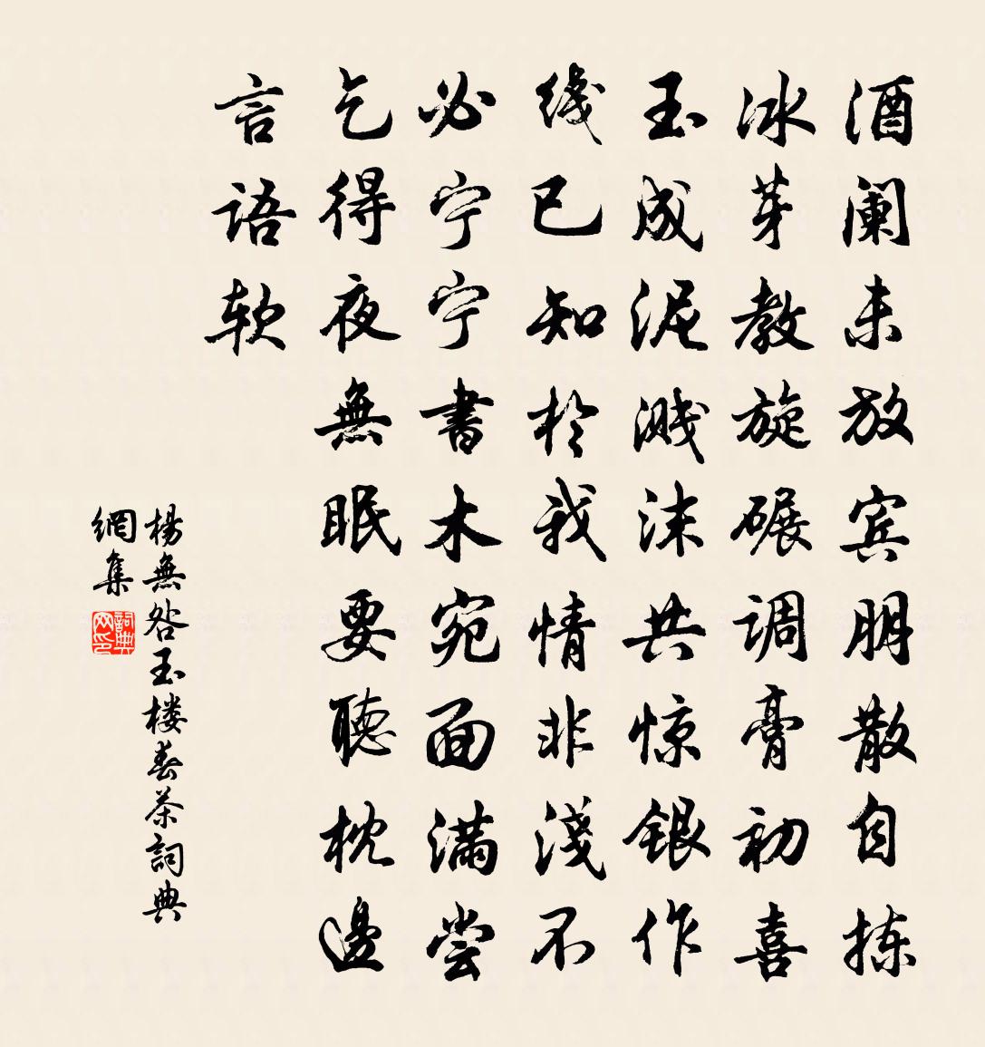 詩詞名句歷史字典書法欣賞書法字典國語詞典說文解字康熙字典古漢語字典標 題 作 者 詩 句 玉樓春(茶)作者:楊無咎 朝代:宋代玉樓春(茶)原文酒闌未放賓朋散。自揀冰芽教旋碾。調膏初喜玉成泥,濺沫共驚銀作線。已知於我情非淺。不必寧寧書木宛面。滿嘗乞得夜無眠,要聽枕邊言語軟。詩詞問答問:玉樓春(茶)的作者是誰?答:楊無咎問:玉樓春(茶)寫於哪個朝代?答:宋代楊無咎玉樓春(茶)書法欣賞玉樓春(茶)書法作品詩詞推薦頌古釋道顏〔宋代〕少室山前風過耳,九年人事隨流水。若還不是弄潮人,切須莫入洪波里。芙蓉池亭徐霖〔宋代〕仲冬多美曝,散步有餘真。老樹槎牙晚,初花的爍春。清歌動落日,遠岫得幽人。空返無佳句,知為暮靄嗔。景德中朝會十四佚名〔宋代〕金奏在庭,群後在位。天威煌煌,鄉明負扆。高拱穆穆,弁冕端委。盛德日新,禮容有燁。暑中久不把酒盆池千葉白蓮忽開一枝欣然小酌陸游〔宋代〕千葉芙蕖白玉膚,一樽沆瀣碧琳腴。極知俱出氛埃外,我亦秋風山澤臞。余於六月初三日泛舟至奇石洞留題洞中一首張嵲〔宋代〕世人應未到,若士或曾游。岸隔千峰秀,門臨萬瀨愁。蜺旌疑可遲,丹洞擬深投。歸去夸塵侶,城闉鶴暫留。寄呈漳守李侍郎元善四首王邁〔宋代〕陛前苦語犯龍鱗,朝退還遭丞相嗔。連削六階為下吏,只饒一死與間身。命天所付須安分,貧士之常莫語人。惟有補樂府十篇帝宓犧氏之樂歌曹勛〔宋代〕罔兮罟兮惟田漁,時兮食兮民這須,以享以祀兮燔祭有餘。枯梅史文卿〔宋代〕樛枝半著古苔痕,萬斛寒香一點春。總為古今吟不盡,十分清瘦似詩人。朱湖趙文〔宋代〕高低櫸柳綠如苔,三兩柴門傍竹開。此處定無人挾彈,青青乳燕出溪來。偈頌八十五首釋妙倫〔宋代〕轉身動腳,開口露牙。明明是我,的的非它。衲僧不肯向省要處受用,甘自區區於道途之上。真可惜,誠可嗟。瑞閒居雜詠三十二首仁陳淳〔宋代〕仁人之安宅,在心本全德。要常處於中,不可違終食。仲夏書事十首方回〔宋代〕息擔秋雲季,扶犁夏欲中。園林初畏日,里巷只雌風。餅粥慳鱐脯,醯鹽劣韭蔥。藕絲冰水舊,誠識少陵翁。次韻邵子文感春之什郭印〔宋代〕池塘不似昔年春,蝶亂蜂狂更惱人。莫傍花叢看婉娩,且懷詩卷誦清新。山林祗管縈魂夢,寰宇無端變劫塵。遙想偶作賈島〔唐代〕野步隨吾意,那知是與非。稔年時雨足,閏月暮蟬稀。獨樹依岡老,遙峰出草微。園林自有主,宿鳥且同歸。水龍吟黃孝邁〔宋代〕自側金卮,臨風一笑,酒容吹盡。恨東風、忙去熏桃染柳,不念淡妝人冷。驚鴻去後,輕拋素襪,杳無音信。細看絕句萬哲〔宋代〕少日時時負百憂,從人絡馬與牽牛。中年置此身如竹,荏苒風前得自由。掃花游·西湖寒食吳文英〔宋代〕冷空淡碧,帶翳柳輕雲,護花深霧。艷晨易午。正笙簫競渡,綺羅爭路。驟捲風埃,半掩長蛾翠嫵。散紅縷。漸紅春詞毛滂〔宋代〕瑣窗朱戶無寒到,長似春光日日來。自是螽斯載風什,可煩簫磬祀高禖。送商州杜中丞赴任權德輿〔唐代〕安康地里接商於,帝命專城總賦輿。夕拜忽辭青瑣闥,晨裝獨捧紫泥書。深山古驛分騶騎,芳草閒雲逐隼旟。綺皓賦鹿岩賈司理所築懷京台劉黻〔宋代〕銅駝無萬里,長憶再游難。歲月英雄老,山河草木寒。夢隨歸雁遠,愁賴酒杯寬。寂寞先朝事,斜陽莫倚闌。名句推薦夢入藍橋,幾點疏星映朱戶。吳文英《荔枝香近·七夕》 一身轉戰三千里,一劍曾當百萬師。王維《老將行》 春宵苦短日高起,從此君王不早朝。白居易《長恨歌》 倚杖柴門外,臨風聽暮蟬。王維《輞川閒居贈裴秀才迪》 後不乏人,榮之方久,賢者自苦亦惠嗣。來俊臣《羅織經·固榮卷第六》 德者事業之基,未有基不固而棟宇堅久者洪應明《菜根譚·概論》 夢裡相思,故國王孫路。春無主!杜鵑啼處,淚灑胭脂雨。陳子龍《點絳唇·春日風雨有感》 雲橫秦嶺家何在?雪擁藍關馬不前。韓愈《左遷至藍關示侄孫湘》 戒慎乎其所不睹,恐懼乎其所不聞。子思《禮記·中庸》 我今因病魂顛倒,唯夢閒人不夢君。元稹《酬樂天頻夢微之》