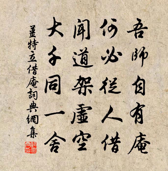詩詞名句歷史字典書法欣賞書法字典國語詞典說文解字康熙字典古漢語字典標 題 作 者 詩 句 借庵作者:姜特立 朝代:宋代借庵原文吾師自有庵,何必從人借。聞道架虛空,大千同一舍。詩詞問答問:借庵的作者是誰?答:姜特立問:借庵寫於哪個朝代?答:宋代姜特立借庵書法欣賞借庵書法作品詩詞推薦初出大江移泊別浦陳杰〔宋代〕水宿乍移浦,客程初望鄉。江涵鷗夢闊,天入雁愁長。漢月關山白,淮雲草樹蒼。東遊何限意,搔首聽鳴榔。讀韓杜集杜牧〔唐代〕杜詩韓筆愁來讀,似倩 * 癢處搔。天外鳳凰誰得髓?無人解合續弦膠。曉望華清宮王建〔唐代〕曉來樓閣更鮮明,日出闌乾見鹿行。武帝自知身不死,看修玉殿號長生。燈前曲敖陶孫〔宋代〕琉璃燈暖燒春紅,水日簾垂望欲空。美人縹緲隔花霧,春心咫尺無由通。寶釵沽酒市樓中,當筵一曲悲絲桐。少年題葛稚川移家圖周弼〔宋代〕稚川移家入空谷,手招白雲守茅屋。惟恐人窺鍊藥鑪,鎖斷青巒瀉垂瀑。只留一徑通飛鳥,其間想透三仙島。野童送徐璣赴永州掾趙師秀〔宋代〕二水鴻飛外,君今問去程。家貧難擇宦,身遠易成名。入署梅花落,過汀蕙草生。莫因饒楚思,詞體失和平。到雙勝匆匆不及款舟中成小詩寄良器兼簡楊宰吳芾〔宋代〕海濱何處足春風,盡在王孫小圃中。雨洗山光供幾席,日移花影上簾櫳。扁舟回首煙波隔,尊酒何時笑語同。若對某又述釋道真〔宋代〕能持淨意作□家,解駕牛羊白鹿車。嫌闌砌前栽樹少,怕空不種後園花。菩提上□因修得,佛果無生證有涯。此處天涯亭陶弼〔宋代〕雨色絲絲風色嬌,天涯亭上覺魂消。一家生意付秋瘴,萬里歸心隨暮潮。兵送遠人還海界,吏申遷客入津橋。山公奉和翁文堯員外經過七林書堂見寄之什黃滔〔唐代〕朱旗引入昔茆堂,半日從容盡日忙。駟馬寶車行錫禮,金章紫綬帶天香。山從南國添煙翠,龍起東溟認夜光。定恐甲子歲銜命到家至榕城冊封次日閩王降旌旗於新豐…餞別翁承贊〔唐代〕登庸樓上方停樂,新市堤邊又舉杯。正是離情傷遠別,忽聞台旨許重來。此時暫與交親好,今日還將簡冊回。爭得偈頌一百零四首釋紹曇〔宋代〕乳竇相從幾弟兄,忘形骸外又忘情。炊香好甑和籮飯,鼠糞無端污卻羹。隣僧扣齒,訴不平聲。折籌何妨挑剔去壁陳元常醉眠庵李復〔宋代〕淵明喜閒放,自號葛天民。我眠君且去,人謂此語真。無機物莫猜,鷗鳥猶狎馴。欲眠何遣客,一念已生塵。豈如頌十玄談回機釋印肅〔宋代〕涅槃城裹尚猶危,親到靈山未足奇。見佛忘知無我所,六根常動轉阿彌。次山房岐絲吟韻何夢桂〔宋代〕南北本同歸何人泣異岐。玄黃本同質,何人悲素絲。悲泣不自己,吾故憫翟朱。聖賢急救世,猶或與心違。二子救送傅道士兼呈吳明可給事釋寶曇〔宋代〕往時大斗供一沃,既醉而顛顛可卜。得錢乞人如棄泥,風雨叢祠夜深宿。省中諸公六七輩,貴人只許丞相獨。入門客中覽鏡於鄴〔唐代〕何當開此鏡,即見發如絲。白日急於水,少年能幾時。每逢芳草處,長返故園遲。所以多為客,蹉跎欲怨誰。絳州鄭尚書黃滔〔唐代〕旌旗日日展東風,雲稼連山雪刃空。剖竹已知垂鳳食,摘珠何必到龍宮。諫垣虛位期飛步,翰苑含毫待紀公。誰謂幽興蘇泂〔宋代〕花氣濕書籤,琴風入畫簾。綠陰連地黑,朱果落枝甜。客去從鸚語,人歸問鵲占。村居近城郭,幽興得相兼。八月十八夜月有懷伯封李洪〔宋代〕秋半青要未降霜,溪邊獨對露華涼。風清月白興不淺,斗轉參橫夜未央。每望庾塵頻障扇,莫逢伊笛據胡床。揚暉名句推薦轉眼葵肌初繡,又紅欹欄角。陳維崧《好事近·分手柳花天》 青山遮不住,畢竟東流去辛棄疾《菩薩蠻·書江西造口壁》 屈指數春來,彈指驚春去。高觀國《卜運算元·泛西湖坐間寅齋同賦》 不用憑欄苦回首,故鄉七十五長亭。杜牧《題齊安城樓》 孤燈不明思欲絕,卷帷望月空長嘆。李白《長相思·其一》 問別來、解相思否。吳文英《惜秋華·七夕前一日送人歸鹽官》 繁采寡情,味之必厭。劉勰《文心雕龍·情采》 秋空明月懸,光彩露沾濕。孟浩然《秋宵月下有懷》 博觀而約取,厚積而薄發蘇軾《稼說送張琥》 義膽包天,忠肝蓋地,四海無人識。施耐庵《念奴嬌·天南地北》