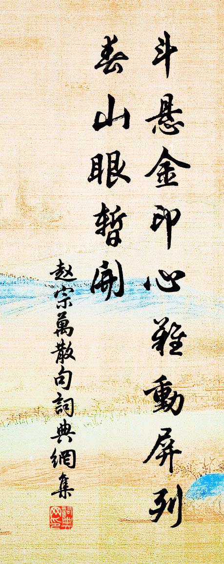 詩詞名句歷史字典書法欣賞書法字典國語詞典說文解字康熙字典古漢語字典標 題 作 者 詩 句 句作者:趙宗萬 朝代:宋代句原文斗懸金印心難動,屏列春山眼暫開。詩詞問答問:句的作者是誰?答:趙宗萬問:句寫於哪個朝代?答:宋代趙宗萬句書法欣賞句書法作品詩詞推薦登蜀阜錢時〔宋代〕滿林春鳥語高低,新綠陰陰分外宜。山隱此時無一事,諸兒齊誦老夫詩。春日偶過亳村故居陳維崧〔清代〕前村里,落梅陣陣風起。舊家池館暫經過,玉欄漫倚。粉英也為主人來,雨中和淚梳洗。畫檐損,月榭圮。蘼蕪蛺後林寺陳天麟〔宋代〕涼颸發遠軔,殘暑促歸輪。山色不厭客,蟬聲強聒人。功名塵外累,身世醉中真。更上高樓望,何峰可卜鄰。春遠 / 春運杜甫〔唐代〕肅肅花絮晚,菲菲紅素輕。日長唯鳥雀,春遠獨柴荊。數有關中亂,何曾劍外清。故鄉歸不得,地入亞夫營。鷓鴣天劉一止〔宋代〕岩下清陰引興長。坐中初識令君香。攬將風月歸詩藪,乞得溪山作醉鄉。憐我老,與傳觴。吳霜點鬢又何妨。只應湖上寓居雜詠 其十姜夔〔宋代〕處士風流不並時,移家相近若依依。夜涼一舸孤山下,林黑草深螢火飛。春日書懷潘大臨〔宋代〕舟楫凌漳水,風濤接蠡湖。龍媒成跬步,驪頷脫微軀。樂土供遊戲,深文苦縶拘。胸中雖磈磊,牆外或歌呼。老去登白馬山護明寺孔德紹〔唐代〕名岳標形勝,危峰遠鬱紆。成象建環極,大壯闡規模。層台聳靈鷲,高殿邇陽烏。暫同游閬苑,還類入仙都。三休乞墦詞楊維楨〔元代〕獬豸不擊邪,化為獸中狐。屈軼不指佞,化作蒿中芻。黃金軀,高蓋車,千夫百喏在一呼。歸來牛馬驚里閭,低眉府試萊城晴日望三山許彬〔唐代〕不易識蓬瀛,憑高望有程。盤根出巨浸,遠色到孤城。隱隱排雲峻,層層就日明。淨收殘靄盡,浮動嫩嵐輕。縱目詠史詩垓下胡曾〔唐代〕拔山力盡霸圖隳,倚劍空歌不逝騅。明月滿營天似水,那堪回首別虞姬。寄金陵幕中李郎中齊己〔唐代〕龍門支派富才能,年少飛翔便大鵬。久待尊罍臨鐵瓮,又從幢節鎮金陵。精神一隻秋空鶴,騷雅千尋夏井冰。長憶送張少卿赴召十首李新〔宋代〕四海傾瞻調鼎手,朝廷側席待伊周。江城父老休遮道,可是星車肯少留。梓潼帝君祠馬廷鸞〔宋代〕梁山劍閣橫岷嶓,梓潼七曲高嵯峨。真人初基斧畫河,靈君受職山之阿。丹碧岌頁龍虎呵,拄天功業石可磨。江流詠史詩王粲〔魏晉〕自古無殉死。達人所共知。秦穆殺三良。惜哉空爾為。結髮事明君。受恩良不訾。臨沒要之死。焉得不相隨。妻子湖上成絕句呈劉伯聲四首張耒〔宋代〕誰道原頭春未回,柳梢黃軟凍齊開。爭驚臘日崢嶸盡,忽問田翁乞野梅。嘉祐袷享二首真宗〔宋代〕躬茲孝享,禮備樂成。神登於俎,神尋於祊。展牲肥腯,奏格和平。靈其昭格,肅優凝情。觀書宋祁〔宋代〕隱几窮千古,披經究萬殊。扶疏曾答客,涉獵恥成儒。洞仙歌 達虎部落遊仙觀醮畢,眾人索王丹桂〔元代〕遊仙一境,上下川原秀。背負高崗面長溜。看峰排、千刃地占三陽,佳氣聚,相接居民淳厚。黃童白叟。信道崇真代家君答聞老詩三首唐仲友〔宋代〕江山天借使詩昌,太守風流似沈郎。莫作推敲沖導其,好攜佳句過黃堂。名句推薦何處秋風至?蕭蕭送雁群。劉禹錫《秋風引》 憶年十五心尚孩,健如黃犢走復來。杜甫《百憂集行》 靜夜沉沉,浮光靄靄,冷浸溶溶月。丘處機《無俗念·靈虛宮梨花詞》 楊柳回塘,鴛鴦別浦。綠萍漲斷蓮舟路。賀鑄《芳心苦·楊柳回塘》 隋堤上、曾見幾番,拂水飄綿送行色。周邦彥《蘭陵王·柳》 敕勒川,陰山下。天似穹廬,籠蓋四野佚名《敕勒歌》 君看蕭蕭只數葉,滿堂風雨不勝寒。李東陽《柯敬仲墨竹》 寧可人負我,切莫我負人。佚名《增廣賢文·上集》 之子歸窮泉,重壤永幽隔。潘安《悼亡詩三首》 鄰國相望,雞犬之聲相聞,民至老死不相往來。老子《老子·德經·第八十章》