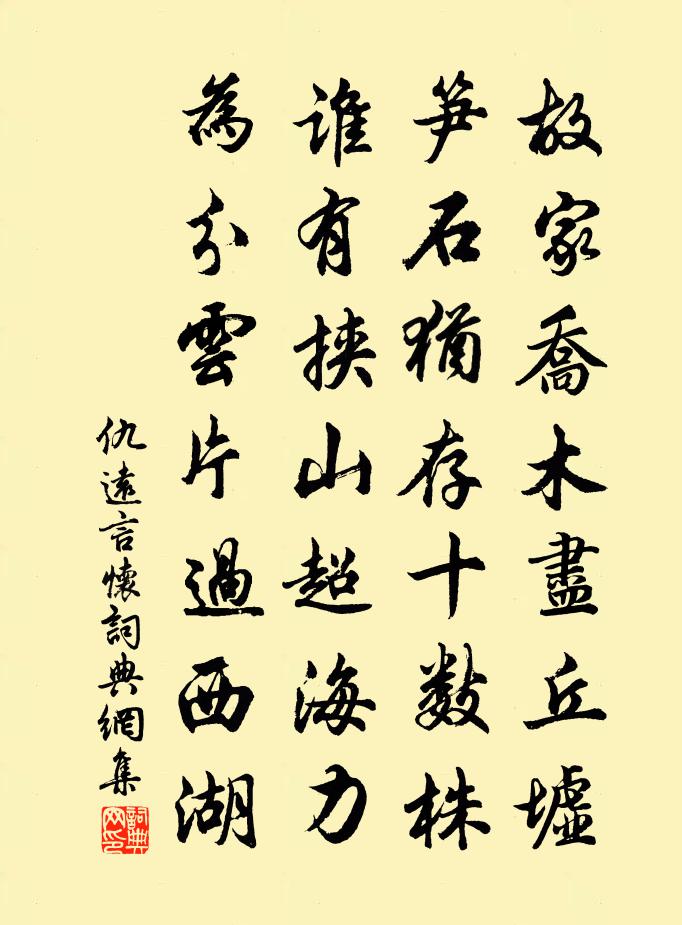 詩詞名句歷史字典書法欣賞書法字典國語詞典說文解字康熙字典古漢語字典標 題 作 者 詩 句 言懷作者:仇遠 朝代:宋代言懷原文故家喬木盡丘墟,筍石猶存十數株。誰有挾山超海力,為分雲片過西湖。詩詞問答問:言懷的作者是誰?答:仇遠問:言懷寫於哪個朝代?答:宋代仇遠言懷書法欣賞言懷書法作品詩詞推薦戲呈唐卿王珪〔唐代〕行到鹿兒山更惡,八千歸路可勝勞。長安日遠思親發,紫漢星回促使軺。曉磴雲濃藏去驛,陰崖冰折斷前橋。羈懷呈萬菴十章溫養白玉蟾〔宋代〕金翁奼女結親姻,洞口桃花日日春。拾得一輪天上月,煉成萬劫屋中珍。黃婆即是母之母,赤子乃其身外身。龍漢懷徐審知王彥博審知之侄彥章趙蕃〔宋代〕為見山花發,忽思湖柳深。當君散帙坐,著我倚樓吟。別句漫多紙,別觴終欠斟。光陰幾尺璧,書疏闕萬金。病駒冷瓶文同〔宋代〕海南有陶器,質狀矮而堶。雲初日炙就,鍛鑠不以火。水壺醜突兀,酒甒肥磥砢。山罍頸微腫,石鼎足已跛。圓如送張子真還鄉待邵州闕項安世〔宋代〕今年新拜李邕州,又見君為邵郡侯。可是朝廷憐遠俗,獨於湖廣用名流。南軒學待真傅繹,槃澗家須舊業修。瓜戌謫居糧絕請學於農將田南山詠言寄懷王守仁〔明代〕謫居履在陳,從者有溫見。山荒聊可田,錢鎛還易辦。夷俗多火耕,仿習亦頗便。及茲春未深,數畝猶足佃。豈徒直夜劉筠〔宋代〕雞人肅唱發章溝,漢殿重重虎戟稠。綷羽欲棲溫室樹,金波先上結麟樓。風來太液聞鳴鶴,霧卷銀河見飲牛。萬國竹窗聞風寄苗發司空曙李益〔唐代〕微風驚暮坐,臨牖思悠哉。開門復動竹,疑是故人來。時滴枝上露,稍沾階下苔。何當一入幌,為拂綠琴埃。論詩三十首·其八元好問〔金代〕沈宋橫馳翰墨場,風流初不廢齊梁。論功若準平吳例,合著黃金鑄子昂。新植海石榴柳宗元〔唐代〕弱植不盈尺,遠意駐蓬瀛。月寒空階曙,幽夢彩雲生。糞壤擢珠樹,莓苔插瓊英。芳根閟顏色,徂歲為誰榮。送任秘丞知長興縣余靖〔宋代〕懿文通籍氣飄飄,二十年來困下僚。吾道本將忠許國,世途休嘆老登朝。囊裝冷落堆青簡,衙署幽深枕畫橋。預想旅次朔方 / 渡桑乾劉皂〔唐代〕客舍并州已十霜,歸心日夜憶鹹陽。無端更渡桑乾水,卻望并州是故鄉。六月三日大風雨蔡忠惠家玉堂紅一洗而盡因憶陳宓〔宋代〕三年渴想玉堂紅,六月都隨一夜風。卻憶去年當此際,一時台府饋筠籠。東郊納涼,憶左威衛李錄事收昆季、太原崔參軍三首樓穎〔唐代〕水竹誰家宅,幽庭向苑門。今知季倫沼,舊是辟疆園。飢鷺窺魚靜,鳴鴉帶子喧。興成只自適,欲白返忘言。納涼和喻景山陳宓〔宋代〕一榻無塵便覺涼,半生場屋鬢將黃。而今已辦還山計,對卷燒香愛日長。病起王安石〔宋代〕稚金敷新涼,老火灺殘濁。桃枝暖淟涊,散發曦曉捉。煩痾脫然愈,靜若遺身覺。移榻欹獨眠,欣佳恐難數。山中姜特立〔宋代〕山中有至樂,靜者得其意。所以入山人,同來不同味。忽夢遊仙王勃〔唐代〕仆本江上客,牽跡在方內。寤寐霄漢間,居然有靈對。翕爾登霞首,依然躡雲背。電策驅龍光,煙途儼鸞態。乘月具茨頌黃庭堅〔宋代〕帝省具茨,在國南屏。篤生韓公,補天子聖。文武韓公,其德庭方。靡職不宜,乃宣力四方。四方維則,歸補我袞贊洞賓像葉紹翁〔宋代〕捻吟髭,劍在前。心中月,天上圓。名句推薦雲銷雨霽,彩徹區明。王勃《滕王閣序》 醉後不知天在水,滿船清夢壓星河。唐珙《題龍陽縣青草湖》 欲人不知,莫若不為;欲人不聞,莫若勿言。吳兢《貞觀政要·卷五· * 平》 長恨春歸無覓處,不知轉入此中來。白居易《大林寺桃花》 人之生不能無群荀子《荀子·富國》 最喜小兒亡賴,溪頭臥剝蓮蓬。辛棄疾《清平樂·村居》 夜雪初霽,薺麥彌望。姜夔《揚州慢·淮左名都》 與君別。相思一夜梅花發。房舜卿《憶秦娥·與君別》 痴兒不知父子禮,叫怒索飯啼門東。杜甫《百憂集行》 寂寞離亭掩,江山此夜寒。王勃《江亭夜月送別二首》