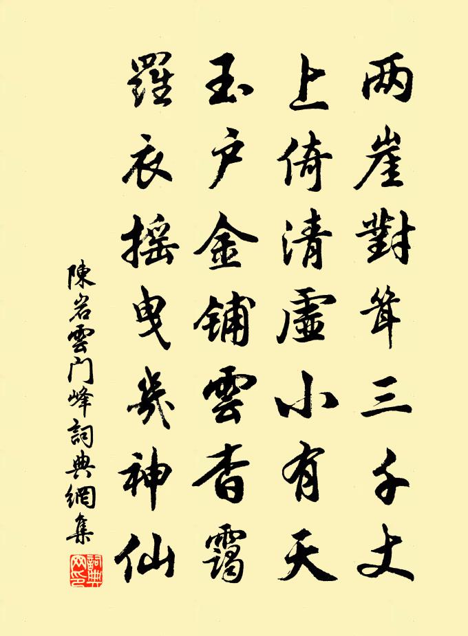 詩詞名句歷史字典書法欣賞書法字典國語詞典說文解字康熙字典古漢語字典標 題 作 者 詩 句 雲門峰作者:陳岩 朝代:宋代雲門峰原文兩崖對聳三千丈,上倚清虛小有天。玉戶金鋪雲杳靄,羅衣搖曳幾神仙。詩詞問答問:雲門峰的作者是誰?答:陳岩問:雲門峰寫於哪個朝代?答:宋代陳岩雲門峰書法欣賞雲門峰書法作品詩詞推薦次韻蔚上人見寄戴表元〔宋代〕流落誰相憶,山林蔚講師。玄機魂夢接,詩力鬢毛知。舟去須尋處,書來不記時。君看東海月,今夜亦追隨。僦廬僻遠因畜鳴雞為入謁之候歲久馴狎其信如宋庠〔宋代〕唳鶴啼烏隔斗城,喈喈辛苦報朝纓。僦廬不識端門漏,長愧東窗第一聲。壽昌寺毛國華〔宋代〕寶構非無地,洪濤信有因。一朝開古井,三佛現金身。敕賜皇恩重,成佛教日新。喜看龍象集,全仗法中人。木蘭花/玉樓春佚名〔宋代〕花間棠棣。匹似人間兄與弟。一種花枝。底事當年卻盛衰。中臧蜾蠃。忽遇暝蛉真類我。換葉移根。要與相輝映一偈頌一百三十六首釋惟一〔宋代〕昔日不生,今日不滅。出入飛鳶嶺,未曾有出入。洞山不曾到,投子不相識。若道嗣德山,未免自屈抑。象骨巍巍午熱登多稼亭五首楊萬里〔宋代〕柳外花邊忽颯然,好風一點破愁顏。岸巾獨倚千尋樹,閒看南雲度北山。雜曲歌辭。昔昔鹽。水溢芙蓉沼趙嘏〔唐代〕淥沼春光後,青青草色濃。綺羅驚翡翠,暗粉妒芙蓉。雲過窗前見,荷翻鏡里逢。將心托流水,終日渺無從。合歡帶(效柳體)仇遠〔宋代〕令巍巍、一段風流。看情性、忒溫柔。記得河橋曾識面,雨凝晴、欲問還羞。沈吟半晌,蟬敧舞鬢、鶯澀歌喉。到與客步月坐澗中石上錢時〔宋代〕林遍山深一罅天,臨流跌坐月娟娟。此時妙音誰能領,繞石琅琅走澗泉。上浙西張帥十首廖行之〔宋代〕曾上雲端款祝融,更臨濤海揖清風。於今又見張夫子,眼底紛紛一洗空。贈寓客還瓜州張昱〔元代〕把酒臨風聽棹聲,河邊官柳綠相迎。幾潮路到瓜州渡,隔岸山連鐵瓮城。月色夜留江叟笛,花枝春覆寺樓箏。贈行王寶謨輓詩魏了翁〔宋代〕寧懷會稽綬,不遺帝城書。仕止四千石,年頭開八秩初。傾囷除旱魃,防岸免民魚。欲識恩田廣,銜哀到小胥。游報本寺牟融〔唐代〕山房寂寂蓽門開,此日相期社友來。雅興共尋方外樂,新詩爭羨郢中才。茶煙裊裊籠禪榻,竹影蕭蕭掃徑苔。醉後題楚州聖井並贈主僧張耒〔宋代〕古佛勝妙力,一泓常湛然。禱祈供眾欲,守護賴師賢。清碧晨齋罷,秋登寶供前。自憐多病質,時許挹清泉。和潘經略廣州峽山五首釋寶曇〔宋代〕是身猶孤雲,夢入岩下寺。天如護蒼江,山故插厚地。一舟巫峽來,八月新雨霽。煙鬟十二外,野花或垂髻。張麗華墓劉克莊〔宋代〕台上柏蕭蕭,空堂閉寂寥。芳魂三尺土,往事幾回潮。墮翠尋難見,埋紅恨未銷。猶勝江令在,白首入隋朝。詠秋蘭靜諾〔清代〕長林眾草入秋荒,獨有幽姿逗晚香。每向風前堪寄傲,幾因霜後欲留芳。名流賞鑒還堪佩,空谷知音品自揚。一種山中橫雲(一作題畫帳)皇甫冉〔唐代〕湘水風日滿,楚山朝夕空。連峰雖已見,猶念長雲中。臨江仙辛棄疾〔宋代〕冷雁寒雲渠有恨,春風自滿余懷。更教無日不花開。未須愁菊盡,相次有梅來。多病近來渾止酒,小槽空壓新醅。窗日黃庭堅〔宋代〕嘆息西窗過隙駒,微陽初至日光舒。□□□長宮中線,添得思堂一卷書。名句推薦落花有淚因風雨,啼鳥無情自古今。屈大均《壬戌清明作》 老農家貧在山住,耕種山田三四畝。張籍《野老歌 / 山農詞》 明妃留在兩眉愁,萬古春山顰不盡元好問《玉樓春·驚沙獵獵風成陣》 牛群食草莫相觸,官家截爾頭上角。李涉《牧童詞》 塞下秋來風景異,衡陽雁去無留意。范仲淹《漁家傲·秋思》 青,取之於藍而青於藍;冰,水為之而寒於水。荀子《荀子·勸學》 水村山館,夜闌無寐,聽盡空階雨。黃大臨《青玉案·和賀方回韻送伯固還吳中》 日落波平。愁損辭鄉去國人。朱敦儒《採桑子·彭浪磯》 用舍由時,行藏在我,袖手何妨閒處看。蘇軾《沁園春·孤館燈青》 言而當、知也;默而當,亦知也荀子《荀子·非十二子》