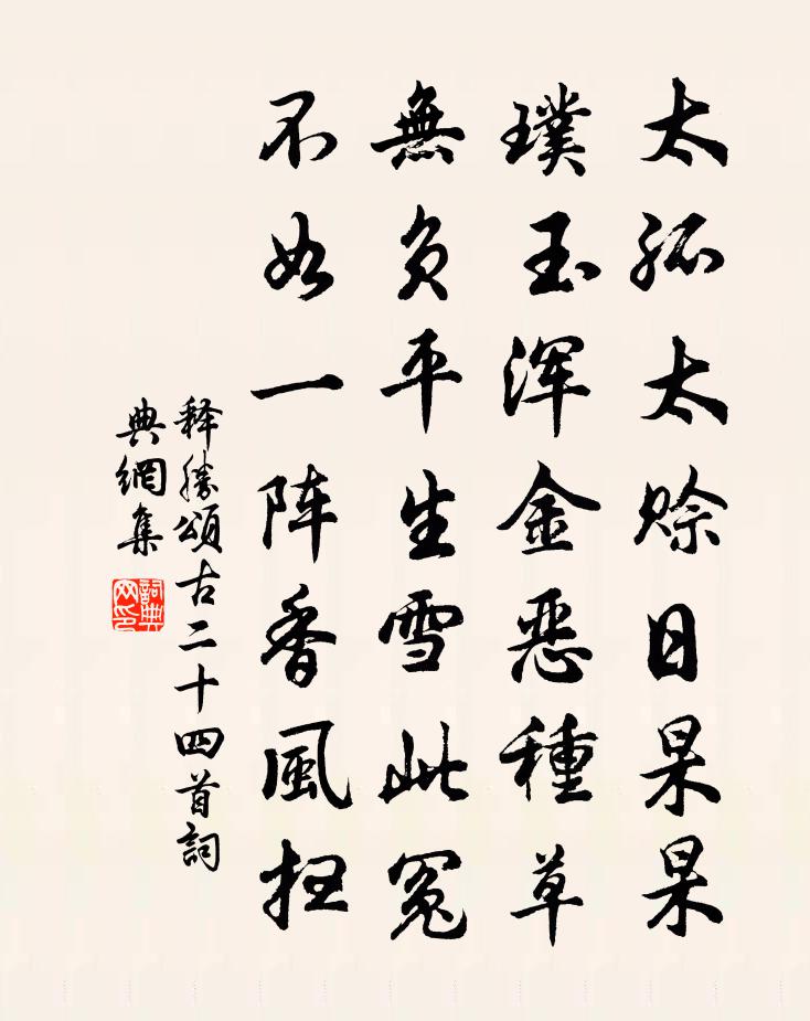詩詞名句歷史字典書法欣賞書法字典國語詞典說文解字康熙字典古漢語字典標 題 作 者 詩 句 頌古二十四首作者:釋勝 朝代:宋代頌古二十四首原文太孤太賒日杲杲,璞玉渾金惡種草。無負平生雪此冤,不如一陣香風掃。詩詞問答問:頌古二十四首的作者是誰?答:釋勝問:頌古二十四首寫於哪個朝代?答:宋代釋勝頌古二十四首書法欣賞頌古二十四首書法作品詩詞推薦借朱約山韻就賀掛冠文天祥〔宋代〕身健尚堪松下飯,眼明正好橘中棋。青山有約當朱戶,白首何心上彩闈。栗里田園供雅興,午橋鐘鼓賞清時。晚來奉送王信州崟北歸杜甫〔唐代〕朝廷防盜賊,供給愍誅求。下詔選郎署,傳聲能典州。蒼生今日困,天子向時憂。井屋有煙起,瘡痍無血流。壤歌唐彭改創南樓為賦長歌程公許〔宋代〕小洛陽城春日釅,翠幙家家夸國艷。圍花命酒十日狂,何如水月山雲日日長相見。西州藩牧最佳處,古木陰森湖瀲蓬島山劉倓〔宋代〕軋軋筍輿過翠微,路經蓬島鎖雲霏。雨從半嶺岩窩出,雲在行人腳下飛。凌朝浮江旅思(一作馬周詩)韋承慶〔唐代〕天晴上初日,春水送孤舟。山遠疑無樹,潮平似不流。岸花開且落,江鳥沒還浮。羈望傷千里,長歌遣四愁。和楊鐵庵送子監鎮之任韻五首姚勉〔宋代〕關西夫子家,清白乃世傳。傳授已到君,此脈要渾全。青雲開亨衢,況及此妙年。願言植名節,照映東西川。小桃園李商隱〔唐代〕竟日小桃園,休寒亦未暄。坐鶯當酒重,送客出牆繁。啼久艷粉薄,舞多香雪翻。猶憐未圓月,先出照黃昏。郊廟歌辭。太清宮樂章。第二奏佚名〔唐代〕虛極仙宗本,希夷象帝先。百靈朝太上,萬法祖重圓。善貸惟沖德,功成謂自然。雲門達和氣,思用合鈞天。題海陵寓舍二首之一賀鑄〔宋代〕池上千條柳,依依解占春。自憐衰颯鬢,不與物爭新。池上清晨候皇甫郎中白居易〔唐代〕曉景麗未熱,晨飈鮮且涼。池幽綠蘋合,霜潔白蓮香。深掃竹間徑,靜拂松下床。玉柄鶴翎扇,銀罌雲母漿。屏除嘆逝賦陸機〔魏晉〕昔每聞長老追計平生同時親故,或凋落已盡,或僅有存者。餘年方四十,而懿親戚屬,亡多存寡;昵交密友,亦不偶興四首韓元吉〔宋代〕愛水仙成百計栽,三年一笑漸能開。金銀豈是吾家物,借我虛名付酒台。九月下旬有作二首張耒〔宋代〕慘慘歲雲暮,寒日無停光。況復陰晦多,景短重雲長。梳頭坐清曉,朝飯熟黃粱。官閒無事業,終日偃空堂。經時偈頌四十一首釋普寧〔宋代〕坐斷手差,當陽烜赫。任是須彌燈王,也須望空斫額。為師席李上捨去智壽四首衛涇〔宋代〕道義須知耐歲寒,論心還喜臭如蘭。龍鱗幸許同攀附,乞與春風借羽翰。初夏閒吟,兼呈韋賓客白居易〔唐代〕孟夏清和月,東都閒散官。體中無病痛,眼下未饑寒。世事聞常悶,交遊見即歡。杯觴留客切,妓樂取人寬。雪鬢汝癭和王仲儀王安石〔宋代〕汝水出山險,汝民多病癭。或如鳥粻滿,或若猿嗛並。女慚高掩襟,男大闊裁領。飲水疑注壺,吐詞侔有梗。樗里冶師行楊維楨〔元代〕湖中冶師緱長弓,有如漢代陶安公。七月七日與天通,朱雀飛來化青童。且莫隨仙踏飛鴻。道人鐵笛已在手,鐵冠郊廟歌辭。祭汾陰樂章。南呂羽韓休〔唐代〕於穆濬哲,維清緝熙。肅事昭配,永言孝思。滌濯靜嘉,馨香在茲。神之聽之,用受福釐。次韻趙端明萬花園方岳〔宋代〕玉簫吹斷知何許,柳徑日長嬌燕舞。鶴城半掩人未歸,數點春愁杏花雨。名句推薦寄語天涯客,輕寒底用愁。于謙《除夜太原寒甚》 雲想衣裳花想容,春風拂檻露華濃李白《清平調·其一》 聲一無聽,物一無文左丘明《國語·鄭語·史伯為桓公論興衰》 疑人勿使,使人勿疑脫脫《金史·本紀·卷四》 湘江兩岸花木深,美人不見愁人心。盧仝《有所思》 湖清霜鏡曉,濤白雪山來。李白《送友人尋越中山水》 當關不報侵晨客,新得佳人字莫愁。李商隱《富平少侯》 善謀生者,但令長幼內外,勤修恆業,而不必富其家王永彬《圍爐夜話·第九則》 君子贈人以言,庶人贈人以財。荀子《荀子·大略》 相見情已深,未語可知心。李白《相逢行二首》