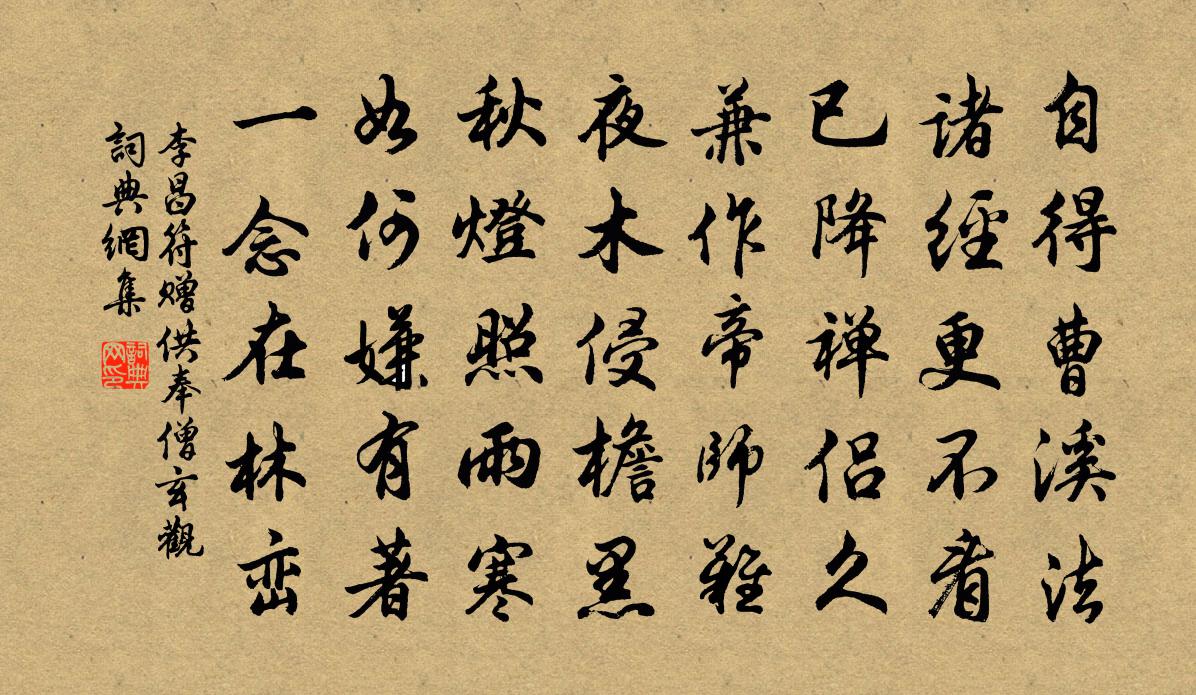 詩詞名句歷史字典書法欣賞書法字典國語詞典說文解字康熙字典古漢語字典標 題 作 者 詩 句 贈供奉僧玄觀作者:李昌符 朝代:唐代贈供奉僧玄觀原文自得曹溪法,諸經更不看。已降禪侶久,兼作帝師難。夜木侵檐黑,秋燈照雨寒。如何嫌有著,一念在林巒。詩詞問答問:贈供奉僧玄觀的作者是誰?答:李昌符問:贈供奉僧玄觀寫於哪個朝代?答:唐代問:贈供奉僧玄觀是什麼體裁?答:五律李昌符贈供奉僧玄觀書法欣賞贈供奉僧玄觀書法作品注釋全唐詩:卷601-14詩詞推薦賢八詠和靖探梅姚勉〔宋代〕孤山養孤鶴,宜與梅為鄰。處士若輕出,梅花應笑人。江城子(代作)高觀國〔宋代〕綠叢籬菊點嬌黃。過重陽。轉愁傷。風急天高,歸雁不成行。此去郎邊知近遠,秋水闊,碧天長。郎心如妾妾如郎立春後五日次本上人韻釋正覺〔宋代〕雪繞樓欄同楚些,梅將青子柳柔柯。山林臭味入新語。風月膺胸遵古科。夢付曲肱春困甚,乞如駢拇老閒何。雨師仙居禪院毛滂〔宋代〕瀟灑仙居院,樓台煙靄中。夜泉清浸月,午鐸冷搖風。轉目已成昨,累名俱是空。一尊林下醉,此興誰與同。長安道中悵然作三首宋祁〔宋代〕興亡作今古,事往始堪悲。宮破黃山在,城空北斗移。走岡寒兔急,啼戍暮鴉飢。灞岸重回首,惟餘王粲詩。狗子無佛性釋心道〔宋代〕狗子佛性無,老蚌吐明珠。西川鳴杜宇,江南啼鷓鴣。同韻和元明兄知命弟九日相憶二首黃庭堅〔宋代〕萬水千山厭問津,芭蕉林里自觀身。鄰田雞黍留熊也,風雨關河走阿秦。鴻雁池邊照雙影,脊令原上憶三人。年年頌古十七首釋大觀〔宋代〕才是貪他便著他,其間半露又全遮。只今誰是傍觀者,一笑何勞掛齒牙。東禪陳師道〔宋代〕東阡急雨未成泥,度密穿青取徑微。邂逅無人成獨往,殷懃有月與同歸。浣溪沙(和曾吉甫韻呈宋景晉待制。宋有二袓)向子諲〔宋代〕綠繞紅圍宋玉牆。幽蘭林下正芬芳。桃花氣暖玉生香。誰道廣平心似鐵,艷妝高韻兩難忘。蘇州老矣不能狂。採桑子孫枝蔚〔清代〕老僧頭白焦山頂,不管興亡。安穩禪床。臥對江南古戰場。客來久坐渾無語,飯熟茶香。歸路茫茫。水打空船月照無夢令 京兆譚急腳索馬鈺〔元代〕且做塵中急足。有日清閒願足。隨分更隨緣,自是常常知足。知足。知足。捉住金烏三足。官舍歲暮感懷書事五首張耒〔宋代〕筆床茶灶素圍屏,瀟灑幽齋燈火明。木落風霜初十月,坐寒星斗欲三更。消磨永夜晝盈案,分付閒愁酒滿觥。乾世好事近(十二之四)陸游〔宋代〕歲晚喜東歸,掃盡市朝陳跡。揀得亂山環處,釣一潭澄碧。賣魚沽酒醉還醒,心事付橫笛。家在萬重雲外,有沙鷗題湖南嶽麓寺曹松〔唐代〕海雲山上寺,每到每開襟。萬木長不住,細泉聽更深。蜩沾高雨斷,鳥遇夕嵐沈。此地良宵月,秋懷隔楚砧。酬魯望見迎綠罽次韻皮日休〔唐代〕輕裁鴨綠任金刀,不怕西風斷野蒿。酬贈既無青玉案,纖華猶欠赤霜袍。煙披怪石難同逸,竹映仙禽未勝高。成後為雲侶天游賦衛宗武〔宋代〕汗漫可以期,列缺可以至。豈不高且遠,未足語超詣。至人司重玄,妙境此融會。無聲亦無臭,萬象於我備。不必贈韋侍御黃裳其二李白〔唐代〕見君乘驄馬。知上太山道。 此地果摧輪。全身以為寶。我如豐年玉。棄置秋田草。但勖冰壺心。無為嘆衰老。玉堂儤直陳與義〔宋代〕庭葉瓏瓏曉更青,斷雲吐日照寒廳。只應未上歸田奏,貪誦楞伽四卷經。送友人建康入道連文鳳〔宋代〕鬱郁文章不稱時,豈堪寂寞寄人籬。早知亂後為儒誤,始恨年來入道遲。春晚茅山猶有術,秋深商嶺已無芝。何當名句推薦喪不過三年,示民有終也。孔子及其弟子《孝經·喪親》 偶然值林叟,談笑無還期。王維《終南別業 / 初至山中 / 入山寄城中故人》 不論平地與山尖,無限風光盡被占羅隱《蜂》 居身務期質樸,教子要有義方。朱柏廬《朱子家訓·全文》 賞賜不能喜,誅罰不能威。墨子《墨子·05章 七患》 村北村南,穀雨才耕遍。范成大《蝶戀花·春漲一篙添水面》 一溪煙柳萬絲垂,無因系得蘭舟住。周紫芝《踏莎行·情似遊絲》 扶桑已在渺茫中,家在扶桑東更東。韋莊《送日本國僧敬龍歸》 倚竹不勝愁,暗想江頭歸路王之道《如夢令·一晌凝情無語》 天際兩蛾凝黛,愁與恨、幾時極。韓元吉《霜天曉角·題採石蛾眉亭》