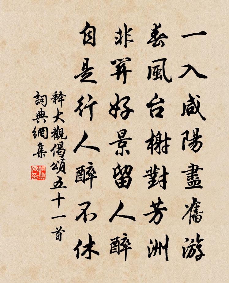 詩詞名句歷史字典書法欣賞書法字典國語詞典說文解字康熙字典古漢語字典標 題 作 者 詩 句 偈頌五十一首作者:釋大觀 朝代:宋代偈頌五十一首原文一入鹹陽盡舊遊,春風台榭對芳洲。非關好景留人醉,自是行人醉不休。詩詞問答問:偈頌五十一首的作者是誰?答:釋大觀問:偈頌五十一首寫於哪個朝代?答:宋代釋大觀偈頌五十一首書法欣賞偈頌五十一首書法作品詩詞推薦題棲鳳亭四首白玉蟾〔宋代〕亭前綠密玉成叢,鳳宿枝頭煙雨空。簫管一聲人未寢,滿林明月浸清風。挽程伯禹王洋〔宋代〕待問盈朝日,群生解褐初。太常方秦第,儒館下除書。出入勞忠藎,襟懷自卷舒。如何奪公早,不得待懸車。偈頌七十六首釋子益〔宋代〕心如虛空不可量,聖君壽量亦如是。將如是法報皇恩,天上人間更無比。海鷗詠顧況〔唐代〕萬里飛來為客鳥,曾蒙丹鳳借枝柯。一朝鳳去梧桐死,滿目鴟鳶奈爾何。玉堂感舊宋祁〔宋代〕七年辭玉署,再入佐黃扉。樹與青春換,人將素領歸。磚花仍可記,廈雀稍驚飛。爐蕙非無意,逢人尚襲衣。洞簫賦王褒〔兩漢〕原夫簫乾之所生兮,於江南之丘墟。洞條暢而罕節兮,標敷紛以扶疏。徒觀其旁山側兮,則嶇嶔巋崎,倚巇迤,誠晚步吳儆〔宋代〕水靜偏明眼,山高不受塵。晴沙棲白鳥,野流集歸人。問字誰持酒,行歌有負薪。娟娟孤月影,獨覺向人新。題縣令范傳真化洽亭沈顏〔唐代〕前有淺山,屹然如屏。後有卑嶺,繚然如城。跨池左右,足以建亭。斯亭何名,化洽而成。挽劉實齋尚書陳杰〔宋代〕玉節江湖晚,油幢嶺海春。一朝晉遺老,千古漢名臣。清 * 壺操,尊光紫府身。全歸公不憾,愁絕奠芻人。送解敞李復〔宋代〕昔惜結懽淺,今嗟傷別促。離懷動秋雲,清霜落群木。窮山行路難,歲晚自驅轂。飛魂不可關,昨夜先到蜀。謝潘謙之二首黃榦〔宋代〕綈袍戀戀故人情,寒谷瀟瀟春意生。寂寞窮儒應易足,床頭鼻息便雷鳴。偈頌一百零二首釋紹曇〔宋代〕德山軟頑,雲門放憨。救下不得也,瞿曇瞿野。我也無端入鬧籃。山陂王安石〔宋代〕山陂院落今挼種,城郭樓台已敦燈。白髮逢春唯有睡,睡間啼鳥亦生憎。和傅監倉禱雨陳宓〔宋代〕五月秧針尚未勻,忍看溝底欲生塵。禱祈已久勞州邑,禳禬終當徇士民。天道豈雲難感格,人心遠過定恭寅。新詩和王定國二首二晁補之〔宋代〕還朝便與山水疏,只有此月隨吾居。莫論人隔十日面,猶勝犬傳千里書。清虛有物濯煩暑,藤床對月如對雨。賦成臨江仙(景修席上再賦)李之儀〔宋代〕難得今朝風日好,春光佳思平分。雖然公子暗招魂。其如抬眼看,都是舊時痕。酒到強尋歡日路,坐來誰為溫存。燕子樓黃庚〔宋代〕繁華隨逝水,日暮高樓空。哀哀徐陵妾,事主不及終。空房輟膏沐,明妝為準容。春風燕子來,秋風燕子去。去來漉酒巾陸龜蒙〔唐代〕靖節高風不可攀,此巾猶墜凍醪間。偏宜雪夜山中戴,認取時情與醉顏。鳳池吟吳文英〔宋代〕萬丈巍台,碧罘罳外,袞袞野馬游塵。舊文書幾閣,昏朝醉暮,覆雨翻雲。忽變清明,紫垣敕使下星辰。經年事靜甲戌正月十四日書所見來日驚蟄節張元乾〔宋代〕老去何堪節物催,放燈中夜忽奔雷。一聲大震龍蛇起,蚯蚓蝦蟆也出來。名句推薦是法平等無有高下。鳩摩羅什譯《金剛經·淨心行善》 柳鎖鶯魂,花翻蝶夢,自知愁染潘郎史達祖《夜合花·柳鎖鶯魂》 打起黃鶯兒,莫教枝上啼。金昌緒《春怨 / 伊州歌》 寒蟬淒切,對長亭晚,驟雨初歇。柳永《雨霖鈴·寒蟬淒切》 馬上牆頭,縱教瞥見,也難相認晁端禮《水龍吟·詠月》 九日悲秋不到心。鳳城歌管有新音。晏幾道《鷓鴣天·九日悲秋不到心》 田園寥落干戈後,骨肉流離道路中。白居易《望月有感》 紅臉青腰,舊識凌波女。晏幾道《蝶戀花·笑艷秋蓮生綠浦》 事無終始,無務多業。墨子《墨子·02章 修身》 儉節則昌,淫佚則亡。墨子《墨子·06章 辭過》
