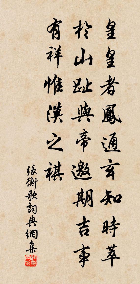 詩詞名句歷史字典書法欣賞書法字典國語詞典說文解字康熙字典古漢語字典標 題 作 者 詩 句 歌作者:張衡 朝代:兩漢歌原文皇皇者鳳。通玄知時。萃于山趾。與帝邀期。吉事有祥。惟漢之祺。詩詞問答問:歌的作者是誰?答:張衡問:歌寫於哪個朝代?答:兩漢張衡歌書法欣賞歌書法作品詩詞推薦日出引曹勛〔宋代〕雲冥冥,風淒淒。綺疏未白雞已啼,角聲才斷辟朱扉。辟朱扉,款朝日。君王劍佩朝諸侯,赫赫明明光萬國。西江月馬鈺〔元代〕大道都來六字。自然清靜無為。有人依得合希夷。視聽何須眼耳。清靜內容歡喜。無為功就神飛。自然雲步赴瑤池答林石田見訪有詩相勞汪元量〔宋代〕偶攜降幟立詩壇,剪燭西窗共笑歡。落魄蘇秦今席暖,猖狂阮籍尚氈寒。山中客老乾莖白,海上人歸一寸丹。世事太尉王公以九錫命大將軍讓公將還京邑祖餞贈陸雲〔魏晉〕悠悠征人。四牡騑騑。發軫北京。振策紫微。昔乃雲來。春林方輝。歲亦暮止。之子言歸。道塗興戀。伏載稱徽。贈醫士嚴嘉謀〔宋代〕脈差死活懸三指,炙誤風攣廢四肢。寧餌生金餐野葛,有身不可試庸醫。次季弼索楊繼甫詩唐仲友〔宋代〕詩來得得巧搜尋,清似壺冰洗我心。白雪陽春皆絕唱,高山流水欠知音。秦淮淼淼涵秋影,楚岸迢迢起夕陽。此際虞美人(夜泊廬山)徐似道〔宋代〕風緊浪淘生。蛟吼龜鳴。家人睡著怕人驚。只有一翁捫虱坐,依約三更。雪又打殘燈。欲暗還明。有誰知我此時情代常州請平江鄭侍郎曾協〔宋代〕接壤西東似犬牙,一時迎送使君車。應憐壯歲棠陰在,未覺神京驛路賒。飛觀慣看涼月掛,層樓將見瑞雲遮。當筵送潘致虛之湖南章甫〔宋代〕久客兒童狎,窮居草木長。蛙聲猶鼓吹,燕子亦炎涼。度日工詩律,傷時灑淚行。輸君戴明月,先我過瀟湘。壽元伯母太夫人八秩吳芾〔宋代〕七十康強自古稀,年登八秩有誰宜。壽鍾賢母人難及,慶襲佳兒世共知。榮養已為人子范,清規還作女流師。彩衣桃源憶故人 五台月長老來點茶馬鈺〔元代〕五台月老通三要。便把三彭除剿。運用三車皎皎。般載三乘妙。龍華三會心明曉。頓覺三光並照。個內三壇設醮。浪淘沙歐陽修〔宋代〕今日北池游。漾漾輕舟。波光瀲灩柳條柔。如此春來春又去,白了人頭。好妓好歌喉。不醉難休。勸君滿滿酌金甌九歌·國殤屈原〔先秦〕操吳戈兮被犀甲,車錯轂兮短兵接。旌蔽日兮敵若雲,矢交墜兮士爭先。凌余陣兮躐余行,左驂殪兮右刃傷。霾兩溪館二首蔣堂〔宋代〕年來納組去,林下得身還。泚泚清流處,重重碧樹間。淵魚樂且靜,庭鶴壽而間。粗有淮安趣,誰同賦小山。布袋贊釋紹曇〔宋代〕馱布袋,笑誾誾,智無一兩,肉重千斤,轉腦回頭等個人。率陀歸路過錯,滿面是埃塵。題岳陽樓馮時行〔宋代〕洞庭涵浸八百里,岳陽樓高跨湖尾。天空地迥豁疏襟,有客臨風來徙倚。是時窮冬天氣昏,慘澹愁殺湘君魂。層欄送嚴二擢第東歸李嘉祐〔唐代〕隳官就賓薦,時輩詎爭先。盛業推儒行,高科獨少年。迎秋見衰葉,餘照逐鳴蟬。舊里三峰下,開門古縣前。挽心泉蒲處士丘葵〔宋代〕把釣秋風辱贈詩,傷心無路送靈輀。欲書誄語應難盡,獨倚寒梅照石漪。夏夜聞雨曾幾〔宋代〕涼風急雨夜蕭蕭,便恐江南草木雕。自為豐年喜無寐,不關窗外有芭蕉。頌古九首斬貓釋梵言〔宋代〕當日臨崖看滸眼,至今觀水憶南泉。趙州頭戴草鞋去,漁翁腰帶好牽船。名句推薦君疑臣則臣必死。羅貫中《三國演義·第一百一十九回》 兵出無名,事故不成班固《漢書·紀·高帝紀上》 涼風起天末,君子意如何。杜甫《天末懷李白》 東岩富松竹,歲暮幸同歸。王勃《送盧主簿》 故鄉遙,何日去。家住吳門,久作長安旅。周邦彥《蘇幕遮·燎沉香》 戰必覆人之軍,攻必凌人之城。商鞅《商君書·賞刑》 欲多傷神,財多累心!佚名《增廣賢文·下集》 酒困路長惟欲睡,日高人渴漫思茶。蘇軾《浣溪沙·簌簌衣巾落棗花》 相呴以濕,相濡以沫,不如相忘於江湖。莊子《莊子·內篇·大宗師》 長恨去年今夜雨,灑離亭。晏幾道《愁倚闌令·花陰月》