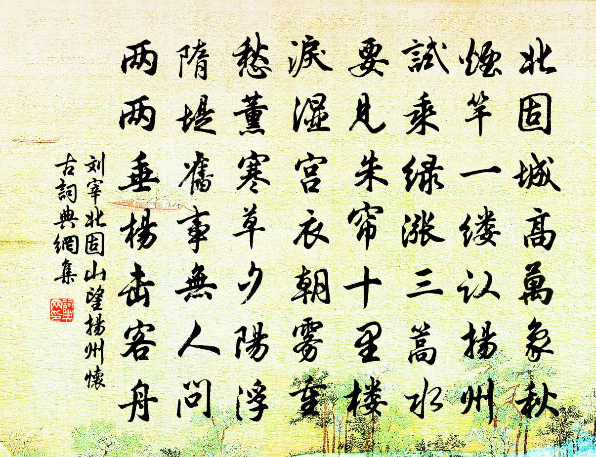 詩詞名句歷史字典書法欣賞書法字典國語詞典說文解字康熙字典古漢語字典標 題 作 者 詩 句 北固山望揚州懷古作者:劉宰 朝代:宋代北固山望揚州懷古原文北固城高萬象秋,煙竿一縷認揚州。試乘綠漲三篙水,要見朱簾十里樓。淚濕宮衣朝霧重,愁薰寒草夕陽浮。隋堤舊事無人問,兩兩垂楊擊客舟。詩詞問答問:北固山望揚州懷古的作者是誰?答:劉宰問:北固山望揚州懷古寫於哪個朝代?答:宋代劉宰北固山望揚州懷古書法欣賞北固山望揚州懷古書法作品詩詞推薦寄湖南從事韓偓〔唐代〕索寞襟懷酒半醒,無人一為解餘酲。岸頭柳色春將盡,船背雨聲天欲明。去國正悲同旅雁,隔江何忍更啼鶯。蓮花送蘇伯達之官西安七首李廌〔宋代〕橫江一葦聽潮來,江月飛霜落酒杯。寄語錢唐江上月,可憐寂寞照潮回。悶書李昌符〔唐代〕病來難處早秋天,一徑無人樹有蟬。歸計未成書半卷,中宵多夢晝多眠。清明陳與義〔宋代〕雨晴閒步澗邊沙,行入荒林聞亂鴉。寒食清明驚客意,暖風遲日醉梨花。書生投老王官谷,壯士偷生漂母家。不用新涼夜坐范成大〔宋代〕吏退焚香百慮空,靜聞蟲響度簾櫳。江頭一尺稻花雨,窗外三更蕉葉風。日日老添明鏡里,家家涼入短檠中。簡編班婕妤怨歌納蘭性德〔清代〕團團望舒月,皓皓冰蠶絹。欲卻炎天暑,比月裁成扇。望舒圓易缺,金風換炎節。風涼秋氣寒,匣扇復誰看。扇棄暮熱游荷池上五首楊萬里〔宋代〕寒甃千尋汲井花,病身一浴不勝佳。追涼不得渾閒事,燒眼生憎半幅霞。甘寧廟馮時行〔宋代〕豪傑自不群,俗眼蓋盲瞽。劉表既不識,那復論黃祖。翻然脫羈銜,渡江得英主。垂手立功勳,雄名詫千古。行至椹澗作歐陽修〔宋代〕霜後葉初鳴,羸驂遶澗行。川原人遠近,禾黍日晴明。病質驚殘歲,歸塗厭暮程。空林聚寒雀,疑已作春聲。踏莎行 黛眉顰色 復古詩集五王國器〔元代〕淡掃春痕,輕籠芳靨。捧心不效吳宮怨。楚梅酸蹙翠尖纖,湘煙碧聚愁萋*。紺羽寒凝,月鉤金灩。鶯吭咽處微偷蝶戀花(和人探梅)盧炳〔宋代〕羅幕護寒遮曉霧。愛日烘晴,又是年華暮。瀟灑江梅爭欲吐。暗香漏泄春來處。何日尋芳溪畔路。挈榼攜筇,寫景澠池道中寄福昌令張景良通直晁補之〔宋代〕十年一夢間湖湘,欲往從之道阻長。可但知君愛彭澤,不應言我薄淮陽。馬穿崤底流泉白,鳥下關頭落照黃。愁作告春亭詩為江寧令荀晉仲作王之道〔宋代〕淵明晉高士,從官非所好。當時令彭澤,為米聊寄傲。公田三百畝,一稔足炊{瀑氵換酉}。明年春二月,農以仲唐彥猷輓詞二首蔡襄〔宋代〕舊德推當代,新悲入故鄉。直當冠獬豸,清可濯滄浪。美研精煤色,文甌晝茗香。生平無復見,流涕送幽堂。代人上平江徐郎五首曾協〔宋代〕喔詩獻壽信知難,門館材多不可攀。敢曳長裾居客右,祗容濫吹列行間。為陵便恐輕溶谷,若礪還應誓泰山。千載和劉實之喜雨黃榦〔宋代〕忽忽久不樂,中腸若焦焚。非無一樽酒,高堂細論文。塵俗了不知,學殖聊自耘。念此農事畢,膏雨猶未均。東郊賣松者齊己〔唐代〕未得凌雲價,何慚所買真。自知桃李世,有愛歲寒人。瑟瑟初離澗,青青未識塵。寧同買花者,貴逐片時春。歸自壽昌徐僑〔宋代〕舟子長歌下急灘,江風吹我怯衣單。一輪明月為誰好,無限清光照夜寒。約吳季謙山行書來問期戲答岳珂〔宋代〕連朝積雨快新晴,雨後青山眼倍明。大路岳蓮聊戲馬,西園池柳正啼鶯。已拚一醉從金諾,共聽層淵噴玉聲。月里喜小兒輩到行在陸游〔宋代〕阿綱學書蚓滿幅,阿繪學語鶯囀木,截竹作馬走不休,小車駕羊聲陸續。書窗涴壁誰忍嗔,啼呼也復可憐人。卻思名句推薦善欲人見,不是真善;惡恐人知,便是大惡。朱柏廬《朱子家訓·全文》 好水好山看不足,馬蹄催趁月明歸。岳飛《池州翠微亭》 寧可信其有,不可信其無。佚名《增廣賢文·上集》 歌泣不成天已暮,悲風日夜起江生。魏禧《登雨花台》 無限傷心夕照中,故國淒涼,剩粉余紅。夏完淳《一剪梅·詠柳》 滄海月明珠有淚,藍田日暖玉生煙。李商隱《錦瑟》 秋菊有佳色,裛露掇其英。陶淵明《飲酒·其四》 積薄而為厚,聚少而為多劉向《戰國策·秦四·或為六國說秦王》 梨花淡白柳深青,柳絮飛時花滿城。蘇軾《東欄梨花》 淚眼問花花不語,亂紅飛過鞦韆去。歐陽修《蝶戀花·庭院深深深幾許》