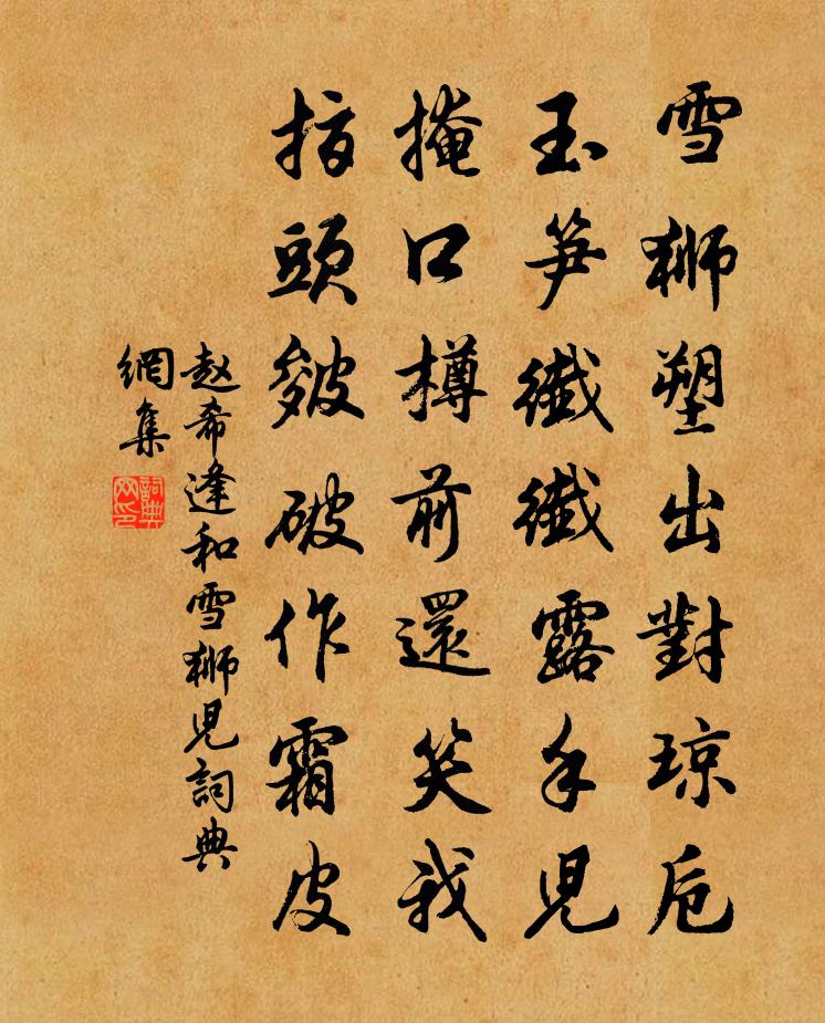 詩詞名句歷史字典書法欣賞書法字典國語詞典說文解字康熙字典古漢語字典標 題 作 者 詩 句 和雪獅兒作者:趙希逢 朝代:宋代和雪獅兒原文雪獅塑出對瓊卮,玉筍纖纖露手兒。掩口樽前還笑我,指頭皴破作霜皮。詩詞問答問:和雪獅兒的作者是誰?答:趙希逢問:和雪獅兒寫於哪個朝代?答:宋代趙希逢和雪獅兒書法欣賞和雪獅兒書法作品詩詞推薦舟中雜紀 其一王冕〔元代〕水竹連平野,人家帶夕陽。道途忘險阻,風景異尋常。借艇移行李,持杯看步光。英雄無所似,堪笑老夫狂。逍遙詠宋太宗〔宋代〕飛騰自在莫教賒,坎女離男共一家。無礙逍遙通智慧,將求利樂勿須夸。靈根就看和春雪,神室之中有絳砂。彼是宣州開元寺南樓杜牧〔唐代〕小樓才受一床橫,終日看山酒滿傾。可惜和風夜來雨,醉中虛度打窗聲。夢雪蘇軾〔宋代〕殘杯失春溫,破被生夜悄。開門千山白,俯仰同一照。雖時出圭角,固自絕瑕竅。兒童勿驚怪,調汝得一笑。四愁詩張衡〔兩漢〕我所思兮在太山。欲往從之梁父艱,側身東望涕沾翰。美人贈我金錯刀,何以報之英瓊瑤。路遠莫致倚逍遙,何為西江月張孝祥〔宋代〕風定灘聲未已,雨來篷底先知。岸邊楊柳最憐伊。憶得船兒曾系。湖霧平吞白塔,茅檐自有青旗。三杯村酒醉如泥喜朝天/踏莎行曹冠〔宋代〕翠老紅稀,歌慵笑懶。溟濛煙雨鞦韆院。芹泥帶濕燕雙飛,杜鵑啼訴芳心怨。座客分題,傳觴迭勸。送春惜別情何贈族子治鬼疾艾性夫〔宋代〕瞠獰電目頭蒙倛,兩手握斷青桃枝。丹符落火六丁走,白晝破柱神雷飛。何物屍蟲作妖魅,敢上天庭聒天耳。坐俘賢者之孝二百四十首李景讓林同〔宋代〕既爾家能孝,還於國盡忠。誰宜舉斯爵,知是莫如公。款塞來享蘇軾〔宋代〕蠢爾氐羌國,天誅亦久稽。既能知面內,不複議征西。斥堠銷烽火,邊城息鼓鼙。輸忠修貢職,棄過為黔黎。雪滿和駱華分水嶺詩林致誠〔宋代〕莫言種木事平平,多少行人上玉京。豈憚炎途依密蔭,雲天大芘盡蒙成。西湖春雪高翥〔宋代〕小艇沿湖看雪飛,正當騎馬蹋春時。是誰乞與楊花舞,先占東風一月期。送友人歸鄭思肖〔宋代〕年高雪滿簪,喚渡浙江潯。花落一杯酒,月明千里心。鳳凰身宇宙,麋鹿性山林。別後空回首,冥冥煙樹深。句舒坦〔宋代〕沙岸金籠樹,燈汀玉涌濤。凌歊台六首吳芾〔宋代〕萬里清水絕點塵,別來經歲鎮如新。恨居平地去天遠,喜上高台與月親。正好賞心拼酩酊,不堪懷古倍酸辛。向來謝前人留宿飲食陳著〔宋代〕芒屩東歸日已斜,故人留滯豈來嗟。數杯爛醉飢時藥,一枕熟眠安處家。湖海友朋多宿草,乾坤今古一風花。但將卜運算元 前後各帶喝馬一聲 此下原有缺字王哲〔元代〕算詞中話。上甘津灑。養靈煙火養蓮,意馬。院俱齊舍。內丹無價。在山邊掛。有屯蒙玉線縫,野馬。月同安下。再到京口陳鑒之〔宋代〕問訊金焦亡恙否,雙鰲依舊據寒流。塔邊浪戰嵌岩石,木末雲扶縹緲樓。楓葉蓼花新醉雨,山容鬢兩添秋。海天一為彭積甫題熙春堂王之道〔宋代〕似聞伐石旋誅茅,已見高堂蔭樂郊。百里湖山供眼界,滿城桃李動春梢。寒梅過盡看成實,乳燕飛來欲定巢。何日中秋近願晴陳普〔宋代〕春風秋月久交遊,少壯論心今白頭。二子倘無相棄絕,從今但乞十中秋。名句推薦訪戴歸來,尋梅懶去,獨釣無聊。薛昂夫《蟾宮曲·雪》 一人飛升,仙及雞犬。蒲松齡《聊齋志異·卷四·促織》 雪紛紛,掩重門,不由人不斷魂,瘦損江梅韻。關漢卿《大德歌·冬》 又有牆頭千葉桃,風動落花紅蔌蔌。元稹《連昌宮詞》 蕭條清萬里,瀚海寂無波。李白《塞上曲》 往事思量一晌空,飛絮無情,依舊煙籠。夏完淳《一剪梅·詠柳》 安得五彩虹,駕天作長橋。李白《焦山望寥山》 三顧頻煩天下計,兩朝開濟老臣心。杜甫《蜀相》 語之所貴者意也,意有所隨。意之所隨者,不可言傳也。莊子《莊子·外篇·天道》 閣雪雲低,卷沙風急,驚雁失序。吳文英《永遇樂·探梅次時齋韻》