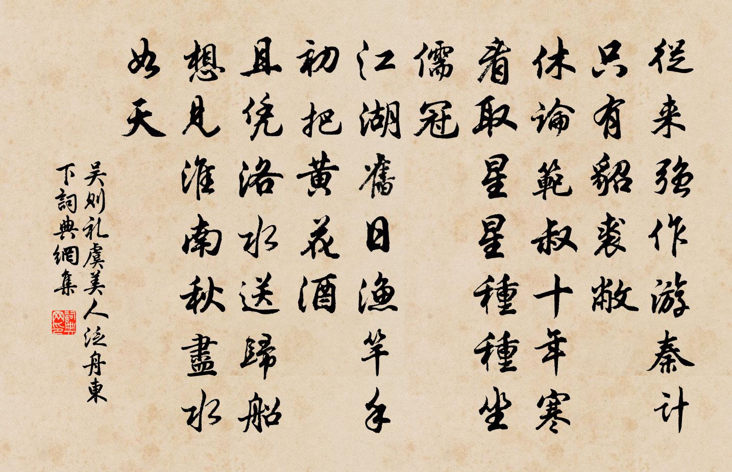 詩詞名句歷史字典書法欣賞書法字典國語詞典說文解字康熙字典古漢語字典標 題 作 者 詩 句 虞美人(泛舟東下)作者:吳則禮 朝代:宋代虞美人(泛舟東下)原文從來強作游秦計。只有貂裘敝。休論范叔十年寒。看取星星種種、坐儒冠。江湖舊日漁竿手。初把黃花酒。且憑洛水送歸船。想見淮南秋盡、水如天。詩詞問答問:虞美人(泛舟東下)的作者是誰?答:吳則禮問:虞美人(泛舟東下)寫於哪個朝代?答:宋代問:虞美人(泛舟東下)是什麼體裁?答:詞吳則禮虞美人(泛舟東下)書法欣賞虞美人(泛舟東下)書法作品詩詞推薦所懷文天祥〔宋代〕予自皋亭山為北所留,深悔一出之誤。聞故人劉小村、陳蒲塘引兵而南,流涕不自堪。只把初心看,休將近事論。生意堂三首董嗣杲〔宋代〕畫堂清傍水南橋,煙氣如炊掩紫霄。十二闌乾成獨倚,櫓聲風隔大江遙。贈中岩王處士方乾〔唐代〕垂楊裊裊草芊芊,氣象清深似洞天。援筆便成鸚鵡賦,洗花須用桔槔泉。商於避世堪同日,渭曲逢時必有年。直恐春中泛舟楊憑〔唐代〕仙郎歸奏過湘東,正值三湘二月中。惆悵滿川桃杏醉,醉看還與曲江同。秋涼懷歸三首董嗣杲〔宋代〕元龍減盡舊時豪,尚落湓江枕怒濤。月下聽歌情浩蕩,燈前支病發蕭騷。少年偶負投機愧,今日徒工煮字勞。歸興送邕州高教授二首項安世〔宋代〕聽說邕州暫駐航,有金如粟馬如羊。五千里地通中國,四十三州控大荒。武事建時文未喪,化風宣處教無方。朝家鵲橋仙 喜雨劉因〔元代〕紇乾生處。幾時飛去。欲去被天留住。野人得飽更無求,看滿意、一犁春雨。田家作苦。濁醪釀黍。準備歲時歌舞九日高登〔宋代〕寒雁南飛度戍樓,一聲天地有餘秋。家連滄海難窮目,人在蠻荒欲盡頭。莫效涓埃裨國計,況 * 發為身謀。所須閒居孟夏即事(一作孟夏有懷)許渾〔唐代〕綠樹蔭青苔,柴門臨水開。簟涼初熟麥,枕膩乍經梅。魚躍海風起,鼉鳴江雨來。佳人竟何處,日夕上樓台。酬隨子直十五兄鄭獬〔宋代〕通州窮並大海涯,厥壤不毛坤德虧,床下矍索穴蟛蜞。我初來居常吟悲,見君顏采方伸眉。眸子清徹鬢垂頤,中懷和陶始作鎮軍參軍經曲阿韻哭陳能之吳芾〔宋代〕陳公行古道,出處盡堪書。俯仰端無負,初終總一如。粵從為劇邑,平步上亨衢。正色主風憲,彈劾靡親疏。故雖酒邊見燒各賦一體董嗣杲〔宋代〕淮山燒色起,陰剝應期約。開闢界限定,蠹根不藉钁。焦枯燼無蹤,艷陽春有腳。爆烈狐兔竄,驚迫魍魎爍。尖危和梅摯北池十詠蔣堂〔宋代〕池上有馴鹿,亭台深處行。長隨熊軾慣,且免兔置驚。遙草眠多穩,流泉飲亦清。寸岑有靈囿,可使遂微生。桃源李白〔唐代〕昔日狂秦事可嗟,直驅雞犬入桃花。至今不出煙溪口,萬古潺湲二水斜。 九效強弱葛立方〔宋代〕堅木兮不可為圈,練鐵兮不可為鉤。圈不成兮箕之得,鉤不成兮何魚之求。委吳以莞{上生下龠}兮復越,事狄以慈湖夾阻風五首蘇軾〔宋代〕捍索桅竿立嘯空,篙師酣寢浪花中。故應菅蒯知心腹,弱纜能爭萬里風。此生歸路愈茫然,無數青山水拍天。猶有木蘭花慢·席上送張仲辛棄疾〔宋代〕漢中開漢業,問此地、是耶非。想劍指三秦,君王得意,一戰東歸。追亡事、今不見,但山川滿目淚沾衣。落日胡次遲韻二首蘇轍〔宋代〕老謫江南岸,萬里修烝嘗。三子留二子,嵩少道路長。累以二孀女,辛勤具餱糧。誰令南飛鴻,送汝至我旁。饑寒堪笑方岳〔宋代〕堪笑張華死不休,謾精象數古無儔。中台星拆何曾識,祗識龍泉動鬥牛。題扇面万俟紹之〔宋代〕起晚慵妝立小樓,杜鵑聲里萬紅休。儂愁未逐春酲解,飛盡楊花不舉頭。名句推薦天上若無修月戶,桂枝撐損向西輪。米芾《中秋登樓望月》 驪山語罷清宵半,淚雨霖鈴終不怨。納蘭性德《木蘭詞·擬古決絕詞柬友》 一蓑煙雨任平生。蘇軾《定風波·莫聽穿林打葉聲》 閣道步行月,美人愁煙空。李白《上之回》 我愛山中春,蒼崖鳥一聲。元鵬《山中四詠》 家童掃蘿徑,昨與故人期。錢起《谷口書齋寄楊補闕》 死者不可再生,用法務在寬簡。吳兢《貞觀政要·卷八·論刑法》 火形嚴,故人獻灼;水形懦,人多溺。韓非及後人《韓非子·內儲說上七術》 莫見乎隱,莫顯乎微,故君子慎其獨也。子思《禮記·中庸》 得即高歌失即休,多愁多恨亦悠悠。羅隱《自遣》