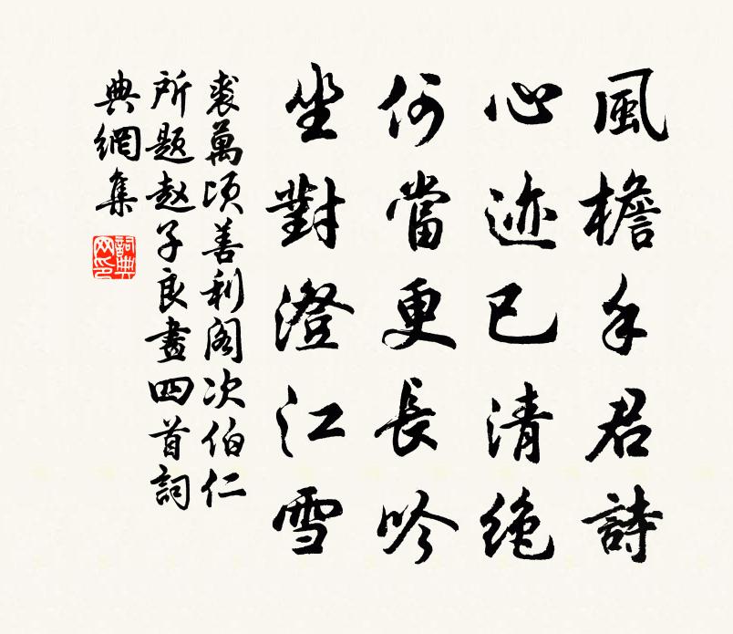 詩詞名句歷史字典書法欣賞書法字典國語詞典說文解字康熙字典古漢語字典標 題 作 者 詩 句 善利閣次伯仁所題趙子良畫四首作者:裘萬頃 朝代:宋代原文風檐手君詩,心跡已清絕。何當更長吟,坐對澄江雪。詩詞問答問:《善利閣次伯仁所題趙子良畫四首》的作者是誰?答:裘萬頃問:該詩寫於哪個朝代?答:宋代書法欣賞善利閣次伯仁所題趙子良畫四首書法作品詩詞推薦雨中花慢(登新樓有懷昌甫、徐斯遠、韓仲止、吳子似、楊民瞻)辛棄疾〔宋代〕舊雨常來,今□不來,佳人偃蹇誰留。幸山中芋栗,今歲全收。貧賤交情落落,古今吾道悠悠。怪新來卻見,文反永夕高蟾〔唐代〕雲鴻宿處江村冷,獨狖啼時海國陰。不會殘燈無一事,覺來猶有向隅心。贈從弟南平太守之遙其二李白〔唐代〕東平與南平。今古兩步兵。素心愛美酒。不是顧專城。謫官桃源去。尋花幾處行。秦人如舊識。出戶笑相迎。挽胡信芳上舍二首王珪〔唐代〕濠上初相行,竹林曾共游。清文三峽水,爽氣九華秋。世已從新學,人誰與此流。遺芳端不朽,未信台棺休。見物便見心張伯端〔宋代〕見物便見心,無物心不現。十方通塞中,真心無不遍。若生知識解,卻成顛倒見。睹境能無心,始見菩提面。春泊弋陽許渾〔唐代〕江行春欲半,孤枕弋陽堤。雲暗猶飄雪,潮寒未應溪。飲猿聞棹散,飛鳥背船低。此路成幽絕,家山鞏洛西。偈頌七十六首釋子益〔宋代〕有拄杖與拄杖,擊木無聲。無拄杖奪拄杖,敲空作響。還見芭蕉和尚麽,莫妄想。憶江南寄純如五首蘇軾〔宋代〕人在畫屏中住,客依明月邊游。未卜柴桑舊宅,須乘五湖扁舟。觀野塘荷花袁說友〔宋代〕淤泥生荷化,物外各有性。環城散紅錦,颭灩滿支徑。人臥蓮葉舟,酒吸碧筒柄。箇中有真樂,樂盡意不盡。送丘宗卿帥蜀三首楊萬里〔宋代〕人似隆中漢臥龍,韻如江左晉諸公。四川全國牙旗底,萬里長江羽扇中。玉壘頓清開宿霧,雪山增重起秋風。近來沖虛觀敖陶孫〔宋代〕青筇相伴到仙壇,身寄虛無縹緲間。景物迥殊人世界,煙霞深鎖道家山。紛紛盡向紅塵老,寂寂誰知白日間。遣履守歲李治〔唐代〕今宵冬律盡,來朝麗景新。花余凝地雪,條含暖吹分。綬吐芽猶嫩,冰□已鏤津。薄紅梅色冷,淺綠柳輕春。送迎王主簿以湘潭檢旱詩卷為示用其廣惠寺蠲放韻趙蕃〔宋代〕旱年蠲賦本深仁,州縣寧聞以實論。細讀賦詩知用意,是為憂國愛元元。送何子溫移亳州三首陳師道〔宋代〕青衿曾誦賦,皓首始登門。意得寧論晚,心交不待言。向來期北上,可復改南轅。畫地數佳政,叢談何處村。自詠三首盧仝〔唐代〕為報玉川子,知君未是賢。低頭雖有地,仰面輒無天。骨肉清成瘦,萵蔓老覺膻。家書與心事,相伴過流年。盧子田蛙歌羅椅〔宋代〕暇蟆,暇蟆,汝本吾田蛙。渴飲吾稻根水,飢食吾禾穟花。池塘雨初霽,籬落月半斜。啁啁又向他人叫,使我惆悵酬李侍御登岳陽見寄劉長卿〔唐代〕想見孤舟去,無由此路尋。暮帆遙在眼,春色獨何心。綠水瀟湘闊,青山鄠杜深。誰當北風至,為爾一開襟。謝人致蟹方岳〔宋代〕除卻金虀霜後棖,更無一物可詩情。誠齋配以彭生臠,豈不冤哉五鼎烹。偶成周邦彥〔宋代〕窗風獵獵舉綃衣,睡美叭應枕簟知。忽有黃鸝深樹語,宛如春盡綠陰時。聞亡友王七嘉禾寺得素琴李益〔唐代〕故人惜此去,留琴明月前。今來我訪舊,淚灑白雲天。詎欲匣孤響,送君歸夜泉。撫琴猶可絕,況此故無弦。何必名句推薦彩線輕纏紅玉臂,小符斜掛綠雲鬟。蘇軾《浣溪沙·端午》 眾人皆有以,而我獨頑似鄙。老子《老子·道經·第二十章》 道不拾遺,民不妄取劉向《戰國策·秦一·衛鞅亡魏入秦》 志於道,據於德,依於仁,游於藝。孔子弟子《論語·述而篇》 天欲禍人,必先以微福驕之,要看他會受陳繼儒《小窗幽記·集醒篇》 借問江潮與海水,何似君情與妾心?白居易《浪淘沙·借問江潮與海水》 道不同,不相為謀。孔子弟子《論語·衛靈公篇》 只言啼鳥堪求侶,無那春風欲送行。高適《夜別韋司士》 料得年年腸斷處,明月夜,短松岡。蘇軾《江城子·乙卯正月二十日夜記夢》 誠者自成也,而道自道也。子思《中庸·第二十五章》