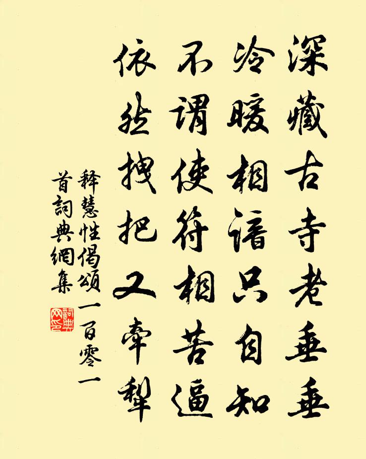 詩詞名句歷史字典書法欣賞書法字典國語詞典說文解字康熙字典古漢語字典標 題 作 者 詩 句 偈頌一百零一首作者:釋慧性 朝代:宋代偈頌一百零一首原文深藏古寺老垂垂,冷暖相諳只自知。不謂使符相苦逼,依然拽把又牽犁。詩詞問答問:偈頌一百零一首的作者是誰?答:釋慧性問:偈頌一百零一首寫於哪個朝代?答:宋代釋慧性偈頌一百零一首書法欣賞偈頌一百零一首書法作品詩詞推薦水調歌頭葛郯〔宋代〕青銅昏水面,烏帽裹山頭。風濤如此,天公作意巧相留。常記垂虹晚渡,臥看菰蒲煙雨,屈指十三秋。恍若華胥夢秋日曾鞏〔宋代〕陰氣先贏縱秋熱,時節有幾相與奪。情知赫日不可久,須聽西風生木末。浮雲滿天明復暗,天意自然如慘怛。園林梅花陸游〔宋代〕山村梅開處處香,醉插烏巾舞道傍。飲酒得仙陶令達,愛花欲死杜陵狂。臨江仙 賀廉侯舉次兒子劉因〔元代〕四海荊州吾所愛,虎賁誰似中郎。小孫今擬喚甘棠。添官前有例,簪笏看堆床。明日乃公歸舊隱,後園喬木蒼蒼。和梁潤之晚登繡嶺強至〔宋代〕翠華絳節去忘還,輦路宮牆壞舊山。青史空文興廢后,玉真餘恨有無間。杖藜一笑緣危徑,弄筆高吟望故關。足力次林卿檳榔韻二首劉克莊〔宋代〕錦衣旋剖苞中實,梔面俄回鏡里春。始信中華禁酒國,不如南粵主林神。金盤惟送渠矜貴,糟罋酣釀子任真。赤腳寄黃龍清老三首黃庭堅〔宋代〕騎驢覓驢但可笑,非馬喻馬亦成痴。一天月色為誰好,二老風流只自知。文公書廚於穆元聖陳普〔宋代〕驪龍抱明珠,高臥萬丈下。豈無善水人,誰是得珠者。至人有神手,上智無淺心。直須入無倫,始克開重陰。月趙蕃〔宋代〕水鳥飛鳴自往還,蒼然暝色暗林巒。離家又見磨鐮月,九月誰憐絺綌寒。漫興十一首趙蕃〔宋代〕寒山蕭蕭上矮窗,竹陰窗景兩舂撞。是中寓意真無盡,筆底尋詩卒未降。秋晚客興(或為沈括作)蘇軾〔宋代〕草滿池塘霜送梅,疏林野色近樓台。天圍故越侵雲盡,潮上孤城帶月回。客夢冷隨楓葉斷,愁心低逐雁行來。流年習家池舊臨官路今路改而東池半入驛吏引自桑項安世〔宋代〕步入荒林問習家,江吞古岸入平沙。枯池舊歲猶生藕,病柳新年尚著芽。草上醉人眠未醒,桑間游女笑相遮。東風回波詞楊廷玉〔唐代〕回波爾時廷玉,打獠取錢未足。阿姑婆見作天子,傍人不得棖觸。贈長洲何主簿韓翃〔唐代〕掛席逐歸流,依依望虎丘。殘春過楚縣,夜雨宿吳洲。野寺吟詩入,溪橋折筍游。到官無一事,清靜有諸侯。寄西弟六首劉黻〔宋代〕儒生事業戒悠悠,鑿井求泉須到頭。要識汝兄勤苦事,頂門白髮一莖秋。贈朱推胡寅〔宋代〕淨綠環城亦何有,跳錦潛銀不容取。尚余翠蓋擁紅妝,兩兩三三早秋後。秋官公廨臨池傍,結筠為筏開軒窗。落日古詩十九首佚名〔兩漢〕今夜良宴會,歡樂難具陳。彈箏奮逸響,新聲妙入神。令德唱高言,識曲聽其真。齊心同所願,含意俱未伸。人生題安溪流惠亭陳宓〔宋代〕平蕪幾載翳雲煙,一日重開便豁然。須信耕桑皆帝力,謾將翔泳祝堯年。金堤新插千株柳,玉井仍看十丈蓮。縣令和荊公二首姜特立〔宋代〕子房不顧蕭曹位,底事穰侯畏客來。得一老兵皆可飲,何須車馬便驚猜。偶思蜀道有賦陸游〔宋代〕天回驛畔江如染,鳳集城邊柳似搓。萬事已隨流水去,一尊將奈夕陽何!是非無定言何益,窮達徐觀得孰多?幸有名句推薦世事漫隨流水,算來一夢浮生。李煜《烏夜啼·昨夜風兼雨》 仲夏苦夜短,開軒納微涼。杜甫《夏夜嘆》 禮者,所以正身也;師者所以正禮也。荀子《荀子·修身》 天入平湖晴不風,夕帆和雁正浮空。陳與義《登岳陽樓》 正入萬山圈子裡,一山放過一山攔楊萬里《過松源晨炊漆公店》 十四萬人齊解甲,更無一個是男兒!花蕊夫人《述國亡詩》 挽弓當挽強,用箭當用長。杜甫《前出塞九首》 歸來報名主,恢復舊神州。岳飛《送紫岩張先生北伐》 不是冤家不聚頭,冤家相聚幾時休?馮夢龍《警世通言·卷二》 頭醋不釅徹底薄。施耐庵《水滸傳·第五十一回》