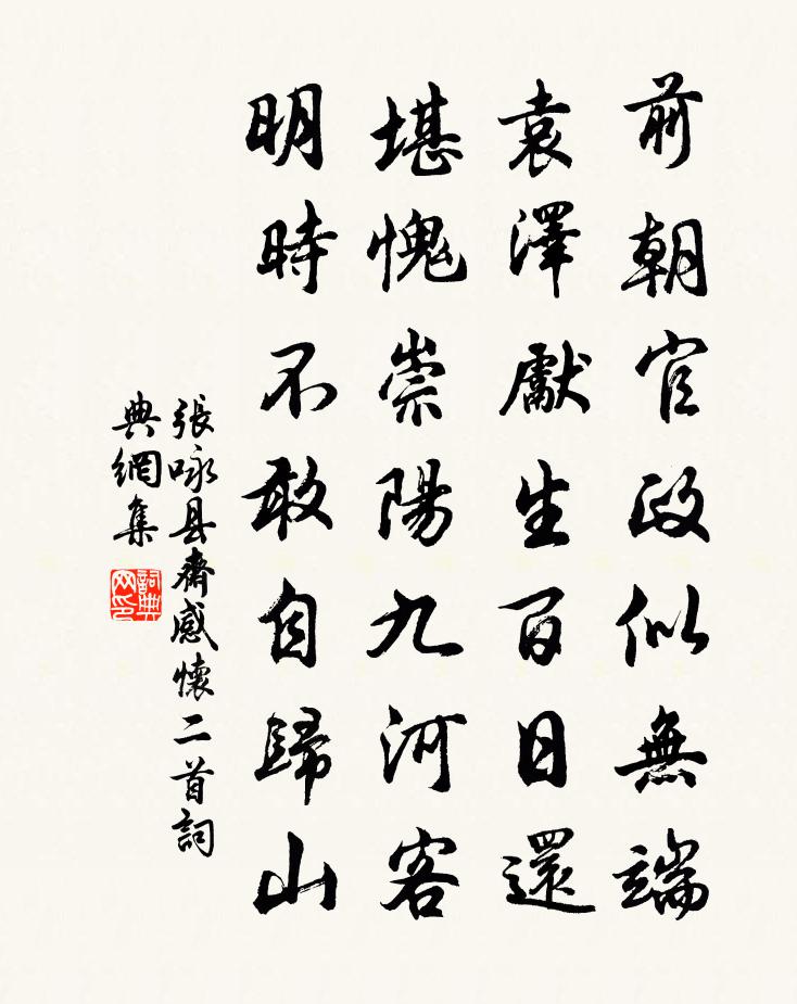 詩詞名句歷史字典書法欣賞書法字典國語詞典說文解字康熙字典古漢語字典標 題 作 者 詩 句 縣齋感懷二首作者:張詠 朝代:宋代縣齋感懷二首原文前朝官政似無端,袁澤先生百日還。堪愧崇陽九河客,明時不敢自歸山。詩詞問答問:縣齋感懷二首的作者是誰?答:張詠問:縣齋感懷二首寫於哪個朝代?答:宋代張詠縣齋感懷二首書法欣賞縣齋感懷二首書法作品詩詞推薦題景德寺試院壁王安石〔宋代〕屋東瓜蔓已扶疏,小石藍花破萼初。從此到寒能幾日,風沙還見一年除。裴侍中晉公以集賢林亭即事詩三十六韻見贈,白居易〔唐代〕三江路千里,五湖天一涯。何如集賢第,中有平津池。池勝主見覺,景新人未知。竹森翠琅玕,水深洞琉璃。水竹哭孫行之二首劉克莊〔宋代〕世上高科眾,君尤自貴珍。如何一夕里,忽盡百年身。雙旐齊眉友,孤燈擁{上髟下告}人。傷心惟孟母,頭白送溪庵種蓻六言八首劉克莊〔宋代〕功名胡蝶夢裡,心功橐駝傳中。環合千林蒼翠,參差數株白紅。禱雨鳳凰山二首陳造〔宋代〕跨鳳西來得好山,千年人與鳳俱還。本規法席專嶄絕,先遣山靈鑿捍頑。聞道碧泓嚴水印,試攜清醥闖雲關。此心問漢守劉寶賢覓酒四首郭印〔宋代〕酒幾於道少人知,乘墜俱忘即我師。身後虛名如勝此,陶潛李白更無詩。沈仲一三益堂陳傅良〔宋代〕有此名三益,之人可晤言。游藏無俗物,典則似諸昆。剩著書充棟,仍添竹過垣。翻愁長者轍,稀得到柴門。除夜嘆賀鑄〔宋代〕壯發忽種種,華年今復窮。客懷少安適,況乃京塵中。病肺厭斟酌,疲筋謝過從。閒坊稅老屋,車馬無來蹤。日俸李潮八分小篆歌杜甫〔唐代〕蒼頡鳥跡既茫昧,字型變化如浮雲。陳倉石鼓又已訛,大小二篆生八分。秦有李斯漢蔡邕,中間作者寂不聞。嶧山題寶林寺可賦軒范成大〔宋代〕十里山行雜市聲,道傍無處濯塵纓。寶林寺里逢修竹,方有詩情約略生。殢人嬌李流謙〔宋代〕痴本無縚,悶寧有火。都是你、自纏自鎖。高來也可。低來也可。這宇宙、何曾礙你一個。休說榮枯,強分物我。緣識宋太宗〔宋代〕常思清淨世情閒,遙認天平我扣關。莫道玄談些子是,鳳飛鶴宿九疑山。醉歌殷七七〔唐代〕琴彈碧玉調,藥煉白硃砂。解醞頃刻酒,能開非時花。同秘書弟賦三老各一首老妾劉克莊〔宋代〕傷春感舊似中酲,樂器全拋曲譜生。自小抱衾無怨色,有時擁髻尚風情。曾陪太尉斟還唱,猶記司空眼與聲。著主古劍謝李惟肖示所業陳襄〔宋代〕天工鑄劍挺鋒鋩,洪爐百錬金為剛。閃鑠神鎚飛電光,磨礪七彩成文章。豐城地僻淪精久,紫氣雄雄射星斗。未得送崑山孫少府錢起〔唐代〕徇祿近滄海,乘流看碧霄。誰知仙吏去,宛與世塵遙。遠帆背歸鳥,孤舟抵上潮。懸知訟庭靜,窗竹日蕭蕭。晨興魏野〔宋代〕夜長乞待得晨興,躭睡童猶喚不應。燒葉爐中無宿火,讀書閣下有殘燈。臨階短髮梳和月,傍岸衰容洗帶冰。料得鍾惠叔轉示趙臨安兩山堂諸公詩刻隨喜二首洪咨夔〔宋代〕朵頤常逐逐,觀復自休休。靜晝青竹筍,深春黃栗留。覺圓熏穟直,夢破茗華浮。為問連山易,床頭好在不。東坡贊釋智朋〔宋代〕難將得喪動天常,但耳安然似玉堂。來往惜書仍借笠,不知雨步瘴煙鄉。畫堂春石孝友〔宋代〕寒蛩切切響空帷。斷腸風葉霜枝。鳳樓何處雁書遲。空數歸期。□□沈腰春瘦,卻成宋玉秋悲。又還辜負菊花時。名句推薦刷羽同搖漾,一舉還故鄉。沈約《詠湖中雁》 十日春寒不出門,不知江柳已搖村。蘇軾《正月二十日往岐亭郡人潘古郭三人送余於女王城東禪莊院》 無聊成獨臥,彈指韶光過。納蘭性德《菩薩蠻·新寒中酒敲窗雨》 花不語,水空流。年年拚得為花愁。晏幾道《鷓鴣天·守得蓮開結伴遊》 羊腸白道穿雲出,雁齒紅橋亞水低。許德溥《西橋柳色》 夫惡有同方取不取同而已者乎?墨子《墨子·01章 親士》 兒童急走追黃蝶,飛入菜花無處尋。楊萬里《宿新市徐公店》 如來所得法此法無實無虛。鳩摩羅什譯《金剛經·離相寂滅》 酒已都醒,如何消夜永!周邦彥《關河令·秋陰時晴漸向暝》 鳳凋碧柳愁眉淡,露染黃花笑靨深。晏幾道《鷓鴣天·九日悲秋不到心》