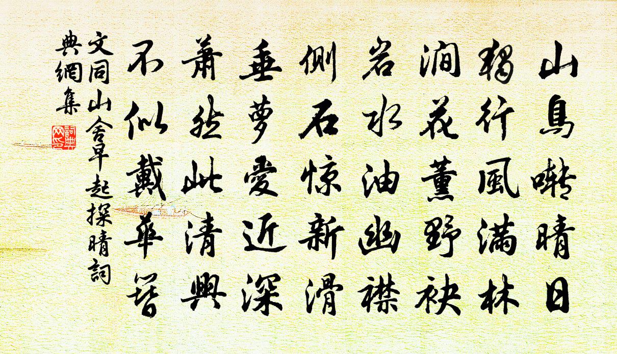 詩詞名句歷史字典書法欣賞書法字典國語詞典說文解字康熙字典古漢語字典標 題 作 者 詩 句 山舍早起探晴作者:文同 朝代:宋代山舍早起探晴原文山鳥囀晴日,獨行風滿林。澗花薰野袂,岩水油幽襟。側石驚新滑,垂蘿愛近深。蕭然此清興,不似戴華簪。詩詞問答問:山舍早起探晴的作者是誰?答:文同問:山舍早起探晴寫於哪個朝代?答:宋代文同山舍早起探晴書法欣賞山舍早起探晴書法作品詩詞推薦損戒二首洪咨夔〔宋代〕野虞雉為媒,穀穀雌召雄。陰機發翳綠,碎迸錦纈紅。耳目誘於物,顛倒不有躬。窒慾當如澤,涵渟清鏡空。悶歌行十二首楊萬里〔宋代〕一夜顛風翻卻天,簸將白浪到天邊。康郎尚自無根腳,斗大洲頭卻繫船。人雁吟張翥〔元代〕雁飛渡江謀稻梁,江人趁熟亦渡江。雁下江中唼苹藻,人飢盡屬江中央。天長水闊羅網多,無衣無食可奈何?人聲螃蟹詠曹雪芹〔清代〕持螯更喜桂陰涼,潑醋擂姜興欲狂。饕餮王孫應有酒,橫行公子竟無腸。臍間積冷讒忘忌,指上沾腥洗尚香。原為風浪阻行再獲聚首故作是詩釋行海〔宋代〕魚龍吹浪阻行舟,又得相尋暫聚頭。不是於君多惜別,自緣今日少交遊。斜風細雨吳天遠,芳草垂楊越路愁。昨夜頌古一百則釋正覺〔宋代〕規圓矩方,用行舍藏。鈍置棲蘆之鳥,進退觸藩之羊。喫人家飯,臥自家床。雲騰致雨,露結為霜。玉線相投透針哭中齊兄三首汪炎昶〔宋代〕我方纏世故,而已返於真。亦豈異流俗,自難逢若人。病多獨嗜學,客至不知貧。毫髮獨無媿,情鍾骨肉親。紫陽花白居易〔唐代〕何年植向仙壇上,早晚移栽到梵家。雖在人間人不識,與君名作紫陽花。送胡倅辟書不遂復到選部曹彥約〔宋代〕便飽薄帆縱木蘭,王陽時節好彈冠。官身檯曆星遲速,世路天香篆屈盤。人去邊頭三策在,春回天上五溪寒。歸飛謝見招者鄧肅〔宋代〕機鋒不契更何圖,便合浮杯出上都。此去定須安短褐,平生那肯曳長裾。回天儻是奇男子,綰印原非大丈夫。揮手初到建寧賦詩一首謝枋得〔宋代〕雪中松柏愈青青,扶植綱常在此行。天下久無龔勝潔,人間何獨伯夷清。義高便覺生堪舍,禮重方知死甚輕。南八答李丞用其韻李新〔宋代〕年少文聲許過秦,仁塗便失自由身。初思鱸鱠翻歸興,不見仙槎卻問津。道德千言遙胄事,文章萬丈當家春。魚從頌古釋普濟〔宋代〕茫茫夢裡去游南,五十三參發指端。大士臂長衫袖短,善財腳瘦草鞋寬。西江月姬翼〔元代〕浩浩彌天匝地,冥冥貫石穿金。千形萬狀內浮沉。往古來今只恁。搏塊當空未見,遺珠罔象能尋。無生一曲少知音失調名佚名〔宋代〕料如今,甘心海角天涯。湖口邂逅張伯豐同行劉過〔宋代〕萬里無人獨自行,得君逆旅尉東征。聊同騎馬相先後,共作詩詞迭唱賡。仆向洞庭和雪渡,船從湖口帶冰撐。明年送上官侍御赴黔中李嘉祐〔唐代〕莫向黔中路,令人到欲迷。水聲巫峽里,山色夜郎西。樹隔朝雲合,猿窺曉月啼。南方饒翠羽,知爾飲清溪。詠南陽汪遵〔唐代〕陸困泥蟠未適從,豈妨耕稼隱高蹤。若非先主垂三顧,誰識茅廬一臥龍。寄榮子雍三首張耒〔宋代〕東風三月洛陽城,傾蓋相逢氣倍增。看盡園花方信馬,飲斜樓月更挑燈。年光飄忽雙馳轂,心事蕭條一老僧。酒病春夜寓直鳳閣懷群公(一本題上有和中書侍郎楊再思)魏知古〔唐代〕拜門傳漏晚,寓直索居時。昔重安仁賦,今稱伯玉詩。鴛池滿不溢,雞樹久逾滋。夙夜懷山甫,清風詠所思。名句推薦愛子心無盡,歸家喜及辰。蔣士銓《歲暮到家》 竹憐新雨後,山愛夕陽時。錢起《谷口書齋寄楊補闕》 今日江頭兩三樹,可憐和葉度殘春。元稹《離思五首》 如花美眷,似水流年曹雪芹《紅樓夢·第二十三回》 窮猿投林,豈暇擇木!房玄齡《晉書·列傳·第六十二章》 嘆隙中駒,石中火,夢中身。蘇軾《行香子·述懷》 苦雨思白日,浮云何由卷。李白《玉真公主別館苦雨贈衛尉張卿二首》 一寸丹心圖報國,兩行清淚為思親。于謙《立春日感懷》 螢飛秋窗滿,月度霜閨遲。李白《塞下曲六首》 閒夢江南梅熟日,夜船吹笛雨蕭蕭。皇甫松《夢江南·蘭燼落》