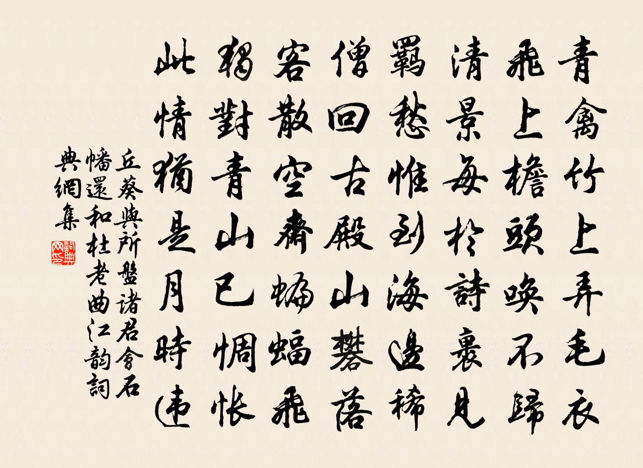 詩詞名句歷史字典書法欣賞書法字典國語詞典說文解字康熙字典古漢語字典標 題 作 者 詩 句 與所盤諸君會石幡還和杜老曲江韻作者:丘葵 朝代:宋代原文青禽竹上弄毛衣,飛上檐頭喚不歸。清景每於詩裹見,羈愁惟到海邊稀。僧回古殿山礬落,客散空齋蝙蝠飛。獨對青山已惆悵,此情猶是月時違。詩詞問答問:《與所盤諸君會石幡還和杜老曲江韻》的作者是誰?答:丘葵問:該詩寫於哪個朝代?答:宋代書法欣賞與所盤諸君會石幡還和杜老曲江韻書法作品詩詞推薦寄山中人溫庭筠〔唐代〕月中一雙鶴,石上千尺松。素琴入爽籟,山酒和春容。幽瀑有時斷,片雲無所從。何事蘇門生,攜手東南峰。賀新郎(和詠荼蘼)劉克莊〔宋代〕曾與瑤姬約。恍相逢、翠裳搖曳,珠韝聯絡。風露青冥非人世,攬結玉龍驂鶴。愛萬朵、千條纖弱。禱祝花神憐惜東門行張憲〔元代〕東都門外古今稀,東宮二傅同日歸。百官祖道設供帳,敕賜黃金作酒資。歸來日日會親友,盡賣賜金買醇酒。白頭奉寄子耕簿公尊兄兼呈德化令君丞公二首趙蕃〔宋代〕寄聲江夏無雙士,並謝藍田不負丞。符檄經行有題贈,江湖別後欠緘縢。一時交舊半為土,老我鬢須逾可憎。獨自桃陶弼〔宋代〕樹正含芳酒正醅,熙熙為爾醉春台。一花五出尚可飲,何況重重疊疊開。自嘲陸游〔宋代〕少讀詩書陋漢唐,暮年身世寄農桑。騎驢兩腳欲到地,愛酒一樽常在傍。老去形容雖變改,醉來意氣尚軒昂。太行冬晴行園中陸游〔宋代〕桔槔灌蔬固已非,竹筧澆花宜見譏。杏繁梅瘦種性別,一氣生殺均天機。細推物理孰不爾,摶風未可嘲卑飛。君其菊花董嗣杲〔宋代〕籬東佳友手曾刪,莫把南山醒眼看。荒徑可供元亮采,落英惟許屈平餐。艷鍾金氣中分晚,香裊清霜獨傲寒。誰插適安夜訪讀靜佳詩卷陳起〔宋代〕情同義合亦前緣,得此蘭交慰晚年。旋爇古香延夜月,試他新茗瀹秋泉。君停逸駕談何爽,客寄吟編句極圓。可惜又三絕句孔武仲〔宋代〕咫尺齊山不易登,力驅煩冗得身輕。瑤巔珉洞須尋遍,從此乘風上玉京。問漢守劉寶賢覓酒四首郭印〔宋代〕雖無斗量敵山濤,時復中之興自高。醉里醒醒方解飲,勿將佳趣語兒曹。送人赴舉黃庭堅〔宋代〕青衫烏帽蘆花鞭,送君歸去明主前。若問舊時黃庭堅,謫在人間今八年。不寢二首劉克莊〔宋代〕蘧蘧據槁遠無寐,栩栩穿花不識愁。老子定中曾看破,寧為蝴蝶勿為周。小重山王哲〔元代〕堪嘆犢兒堪嘆牛。若還省我語,是同流。性如燈燭命如油。相滋引,明焰出山頭。照破一齊休。前程除險路,沒深雜興陸游〔宋代〕粟無人饋方差快,門有僧敲未絕幽。豈是耄荒深絕物,從來不慣惹閒愁。舟次金陵懷寄歷陽王掾相賀鑄〔宋代〕昨時江北望江南,把酒離愁已不堪。今夜江南望江北,抵掌清談安可得。歷湖白下非吾鄉,官身俗眼禁人狂。後日雜詠十首酬汪鎮卿林景熙〔宋代〕鳳德嗟已衰,宣尼欲浮海。賴有載道經,神功補元宰。刪詩挽風變,系易憂世駭。春秋筆削嚴,西秦書乃采。微義宿北樂館陳潤〔唐代〕欲眠不眠夜深淺,越鳥一聲空山遠。庭木蕭蕭落葉時,溪聲雨聲聽不辨。溪流潺潺雨習習,燈影山光滿窗入。棟里題竹房釋文珦〔宋代〕野水連苔徑,山雲掩竹房。人閒清晝永,鳥語綠陰涼。斷刻排簽古,新茶入焙香。眼前清事足,不道在殊方。次韻高仲貽贈別衛涇〔宋代〕金椀輕拋入釣船,夜寒侵被不成眠。近傳奏疏三千牘,今見新詩十二篇。故國音書憑過雁,江城烽火照晴天。移舟名句推薦天降下民,作之君,作之師。惟曰其助上帝,寵之。孟子《孟子·梁惠王章句下·第三節》 湘女歸魂,佩環玉冷無聲,凝情誰訴。吳文英《過秦樓·黃鐘商芙蓉》 歲暮陰陽催短景,天涯霜雪霽寒宵。杜甫《閣夜》 良馬難乘,然可以任重致遠;良才難令,然可以致君見尊。墨子《墨子·01章 親士》 思爾為雛日,高飛背母時。白居易《燕詩示劉叟》 石澗凍波聲,雞叫清寒晨。李賀《自昌谷到洛後門》 我來一長嘆,知是東溪蓮。白居易《京兆府栽蓮》 盡叫得鵑聲碎,卻教人空斷腸。阿魯威《湘妃怨·夜來雨橫與風狂》 雲來山更佳,雲去山如畫。張養浩《雁兒落兼得勝令》 胡雁哀鳴夜夜飛,胡兒眼淚雙雙落。李頎《古從軍行》