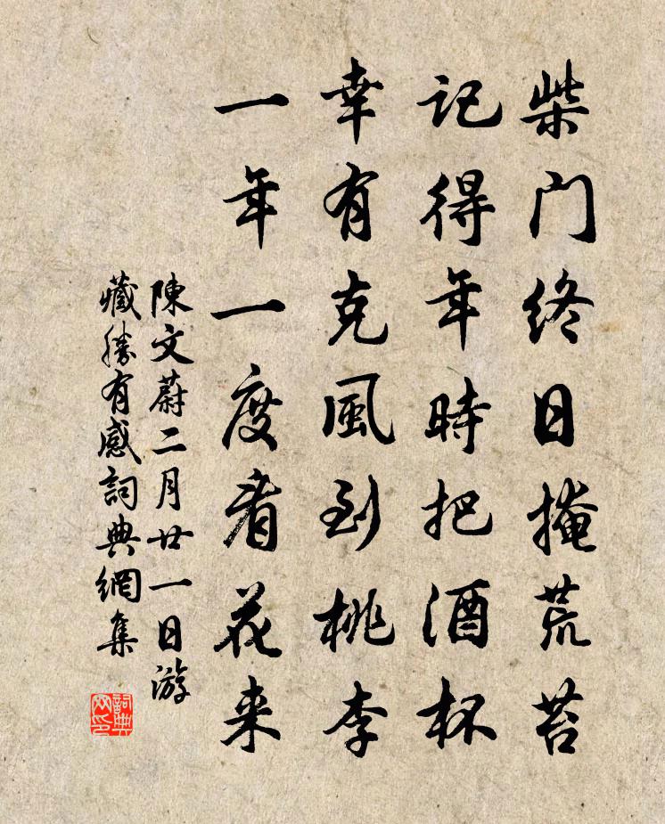 詩詞名句歷史字典書法欣賞書法字典國語詞典說文解字康熙字典古漢語字典標 題 作 者 詩 句 二月廿一日游藏勝有感作者:陳文蔚 朝代:宋代二月廿一日游藏勝有感原文柴門終日掩荒苔,記得年時把酒杯。幸有克風到桃李,一年一度看花來。詩詞問答問:二月廿一日游藏勝有感的作者是誰?答:陳文蔚問:二月廿一日游藏勝有感寫於哪個朝代?答:宋代陳文蔚二月廿一日游藏勝有感書法欣賞二月廿一日游藏勝有感書法作品詩詞推薦楊秀才書屋有墨竹一枝為其添補數葉五絕胡寅〔宋代〕葉染青雲節抱霜,一枝聊寄墨君堂。故園根撥依然在,會見龍孫脫籜香。葡萄歌(一作蒲桃)劉禹錫〔唐代〕野田生葡萄,纏繞一枝高。移來碧墀下,張王日日高。分岐浩繁縟,修蔓蟠詰曲。揚翹向庭柯,意思如有屬。為之贈司徒兼侍中宋宣獻輓詞四首宋庠〔宋代〕舛運明生疾,忠懷語絕偷。空榮人曳履,終隔相封侯。太史藏書法,門生助紼謳。惟餘文獻盆,不復嘆平頭。次宋省齋立秋楊公遠〔宋代〕才見春花榮,又見春花謝。花謝綠成陰,瞬目逢炎夏。誰知俯仰間,禍融便回駕。卻喜西風來,美矣難酬價。且效齊山晚歸鄭獬〔宋代〕飲散齊山晚,夕陽秋浦紅。不須鞭五馬,十里聽松風。好事近(家人生日)郭應祥〔宋代〕今歲慶生朝,遲似迎長十日。試向彩衣堂下,聽歡聲洋溢。小孫能笑長能歌,已自堪娛膝。管取婆猶未老,見滿床答曼叔見寄韓維〔宋代〕人生風波間,觸事喜乖隔。前君還里中,王事有程格。歡言不一再,歸馬已在軛。相期高陽秋,叢菊手共摘。惟時王母祝語薔薇花詩王義山〔宋代〕碎剪紅綃間綠叢,風流疑在列仙宮。朝真更欲薰香去,爭擲霓衣上寶籠。忽驚錦浪洗春色,又似宮娃逞妝飾。會當泛江至土坊楊時〔宋代〕萬頃江湖遠,孤乘一葉船。雁飛雲外字,篷掩水中天。波靜櫓聲息,風微帆影偏。迴環聊注目,浩蕩接清煙。偈頌一百二十三首釋普度〔宋代〕巍巍獨坐大雄峰,萬水千山列下風。相見不說奇特事,一聲猿叫翠微中。下瞿塘寄時同年王周〔唐代〕春寒天氣下瞿塘,大壤溪前柳線長。須信孤雲似孤宦,莫將鄉思附歸艎。春晴楊萬里〔宋代〕日透微風暖,風揉嫩日佳。秪知趲桃李,不道落梅花。上魏丞相樓鑰〔宋代〕夢庵深坐宴朝曛,只有梅花對此君。今日衣冠有巢許,向來元凱佐華勛。入山誰解訪弘景,載酒時應問子云。童諷聯句(光、威、裒,姊妹三人,失其姓)佚名〔唐代〕朱樓影直日當午,玉樹陰低月已三。 ——光膩粉暗銷銀鏤合秋至懷歸詩江淹〔南北朝〕帳然集漢北,還望岨山田。沄沄百重壑,參差萬里山。楚關帶秦隴,荊雲冠吳煙。草色斂窮水,木葉變長川。秋至庭際晚菊上主人齊己〔唐代〕九月將欲盡,幽叢始綻芳。都緣含正氣,不是背重陽。採去蜂聲遠,尋來蝶路長。王孫歸未晚,猶得泛金觴。寓興十首張至龍〔宋代〕東日照瓦霜,西向界余白。莫言日不到,日光來未及。晚春釋守璋〔宋代〕草深煙景重,林茂夕陽微。不雨花猶落,無風絮自飛。關陰陽家彭元清曾豐〔宋代〕嶺北山開脈,江西水發源。陰陽余闔辟,小大幾乾坤。銀海有精力,金函無法門。頻年過我客,始可與君論。郡中玩月,寄江南李少尹虞部孟員外三首羊士諤〔唐代〕月滿自高丘,江通無狹流。軒窗開到曉,風物坐含秋。鵲警銀河斷,蛩悲翠幕幽。清光望不極,耿耿下西樓。桂華名句推薦垂柳不縈裙帶住。漫長是、系行舟。吳文英《唐多令·惜別》 啼鶯舞燕,小橋流水飛紅。白樸《天淨沙·春》 北風利如劍,布絮不蔽身。白居易《村居苦寒》 愁絕行人天易暮,行向鷓鴣聲里住納蘭性德《菊花新·用韻送張見陽令江華》 長安大雪天,鳥雀難相覓。張孜《雪詩》 人皆欲會說話,蘇秦乃因會說而殺身王永彬《圍爐夜話·第七則》 一觴雖獨盡,杯盡壺自傾。陶淵明《飲酒·其四》 甚獨抱清高,頓成淒楚。王沂孫《齊天樂·蟬》 去年戰桑乾源,今年戰蔥河道。李白《戰城南》 馬蹄濃露,雞聲淡月,寂歷荒村路。張榘《青玉案·被檄出郊題陳氏山居》