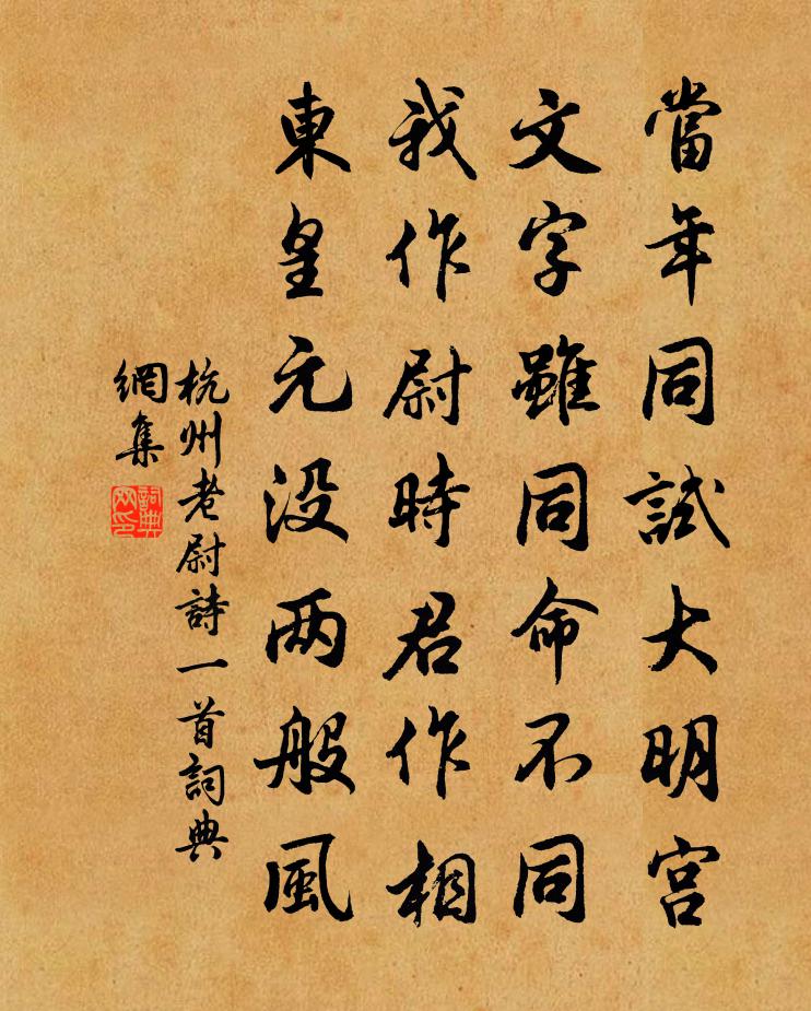 詩詞名句歷史字典書法欣賞書法字典國語詞典說文解字康熙字典古漢語字典標 題 作 者 詩 句 詩一首作者:杭州老尉 朝代:宋代詩一首原文當年同試大明宮,文字雖同命不同。我作尉時君作相,東皇元沒兩般風。詩詞問答問:詩一首的作者是誰?答:杭州老尉問:詩一首寫於哪個朝代?答:宋代杭州老尉詩一首書法欣賞詩一首書法作品詩詞推薦早春詠雪王初〔唐代〕句芒宮樹已先開,珠蕊瓊花斗剪裁。散作上林今夜雪,送教春色一時來。程言聚散有感次前韻陳造〔宋代〕群芳圍坐引杯長,滿目深紅間淺黃。寄語東君好憐客,水西花外慢頹陽。菩薩蠻 以上李真人述還丹訣十首案宋元間道李真人〔元代〕夸丹功用將何作。仙人盡號長生藥。服人得延年。方知此理玄。至藥終須覓。只在坎離側。向此得真微。天長地久師曠撞晉平公韓非〔先秦〕晉平公與群臣飲,飲酣,乃喟然嘆曰:“莫樂為人君!惟其言而莫之違。”師曠侍坐於前,援琴撞之。公被衽而避正仲思歸作篆畦今夜月十詩非篆畦月乃雁蒼月舒岳祥〔宋代〕篆畦今夜月,故意照人衰。一夢十年過,千愁萬里來。只今安粵徼,何日悔輪台。吟罷四百字,更傾三五杯。贈上饒道雲仲戴表元〔宋代〕江上青雲客,天邊白馬生。百年文物似,一席笑談傾。問舊能枚舉,論財比芥輕。徘徊亦自好,可便濯塵纓。偈傾一百三十三首釋法薰〔宋代〕見聞覺知,行住坐臥。眨上眉毛,早已蹉過。赤腳唱山歌,路上無人知。淮南送節度盧端公將命之汴州端公常為汴州相公從事羅隱〔唐代〕吹台高倚圃田東,此去軺車事不同。珠履舊參蕭相國,彩衣今佐晉司空。醉離淮甸寒星下,吟指梁園密雪中。到彼七月十八日與諸人集真於燕譽堂胡寅〔宋代〕盍簪相與記春芳,落去爭如桂影香。故覓層台延曠望,可無尊酒泛寒光。交揮玉塵傾懷盡,半仄冰輪耿夜長。坐到次韻仇仁近梅雨方回〔宋代〕客心何日渡桑乾,瑣瑣良難雨更難。途潦家家逾戶限,檐聲夜夜過更闌。歸舟屢阻千灘漲,暑簟頻驚五月寒。會許詠鶴張嵲〔宋代〕{上羽下高}然毛羽淨,綽與秋風宜。闊步循廣庭,伸吭矜羽儀。稻粱謀幾何,終然遭縶羈。豈炫雲外標,送為時休沐端居有懷希聖李維〔宋代〕銀闕琳房視草餘,龍門岑寂斷軒車。彩毫閒試金壺墨,青案時看玉字書。王令風流希謝傅,子云詞賦敵相如。瓊枝和馮當可郭印〔宋代〕相逢不作少年看,老著衣冠各強顏。明日龜陵分手後,音書又隔幾重山。偈頌一百四十一首釋師範〔宋代〕迦葉擎拳,阿雞合掌。黃面瞿曇,全無伎倆。新乳峰一時見了,卻燒沉香供養。從教人道是罰是賞。方交正月一,菱花怨賀鑄〔宋代〕疊鼓嘲喧,彩旗揮霍,苹汀薄晚,蘭舟催解。別浦潮平,小山雲斷,十幅飽帆風快。回想牽衣,愁掩啼妝,一襟香致仕虞部曲江譚君輓辭王安石〔宋代〕同時獻賦久無人,握手悲歡跡已陳。它日白衣霄漢志,暮年朱紱水雲身。虛容劍幾今長夜,小隱山林只舊春。豈惜雪杜荀鶴〔唐代〕風攪長空寒骨生,光於曉色報窗明。江湖不見飛禽影,岩谷時聞折竹聲。巢穴幾多相似處,路岐兼得一般平。擁袍淳熙五年四月二日,直宿玉堂,懷舊二絕句范成大〔宋代〕桂海冰天老歲華,直廬重上玉皇家。當年曾識青青鬢,惟有東牆一架花。頌古五十三首釋文禮〔宋代〕烏藤倒掛向平田,便把羸牛痛下鞭。更說養來經五歲,始終只是老婆禪。春日何耕〔宋代〕聞道西樓下,香風颺綺羅。無錢沽酒得,不醉奈愁何。老去春緣薄,慵來睡興多。閉門終一枕,亦不夢南柯。名句推薦相思一夜梅花發,忽到窗前疑是君。盧仝《有所思》 落葉滿空山,何處尋行跡。韋應物《寄全椒山中道士》 牽牛織女遙相望,爾獨何辜限河梁。曹丕《燕歌行二首·其一》 月華如練,長是人千里。范仲淹《御街行·秋日懷舊》 誠者,天之道也;思誠者,人之道也。孟子《孟子·離婁章句上·第十二節》 有錢道真語,無錢語不真。佚名《增廣賢文·上集》 空山不見人,但聞人語響。王維《鹿柴》 誰道投鞭飛渡,憶昔鳴髇血污,風雨佛狸愁辛棄疾《水調歌頭·舟次揚州和人韻》 萬里雲間戍,立馬劍門關。崔與之《水調歌頭·題劍閣》 閨中風暖,陌上草薰江淹《別賦》