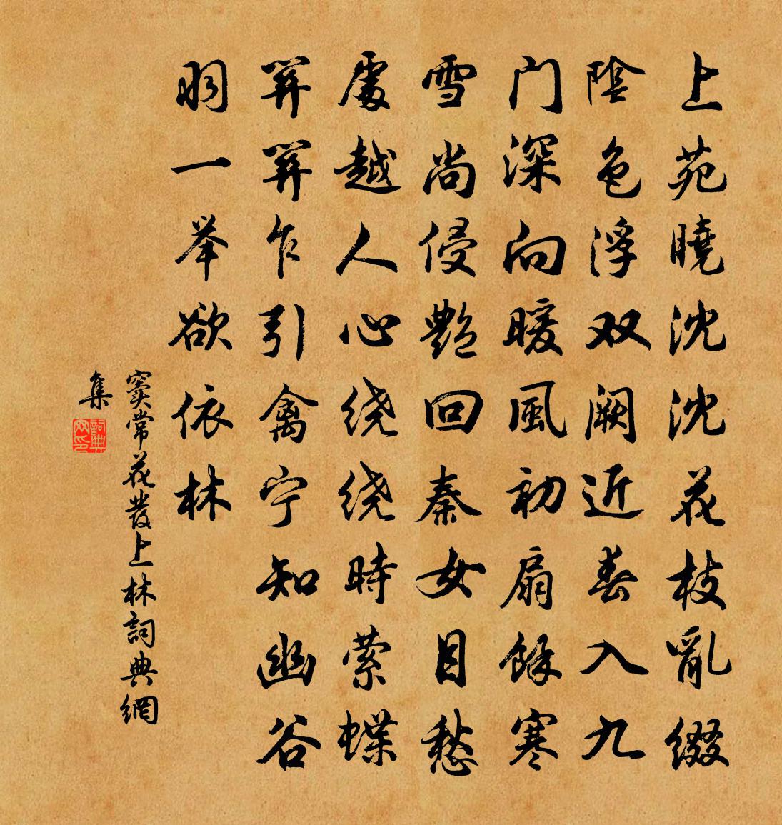 詩詞名句歷史字典書法欣賞書法字典國語詞典說文解字康熙字典古漢語字典標 題 作 者 詩 句 花發上林作者:竇常 朝代:唐代花發上林原文上苑曉沈沈,花枝亂綴陰。色浮雙闕近,春入九門深。向暖風初扇,餘寒雪尚侵。艷回秦女目,愁處越人心。繞繞時縈蝶,關關乍引禽。寧知幽谷羽,一舉欲依林。詩詞問答問:花發上林的作者是誰?答:竇常問:花發上林寫於哪個朝代?答:唐代問:花發上林是什麼體裁?答:五排竇常花發上林書法欣賞花發上林書法作品注釋全唐詩:卷271_30詩詞推薦村居初夏陸游〔宋代〕天遣為農老故鄉,山園三畝鏡湖傍。嫩莎經雨如秧綠,小蝶穿花似繭黃。斗酒只雞人笑樂,十風五雨歲豐穰。相逢和杜樞密雪吳泳〔宋代〕一自金鑾陡下坡,更無津可問明河。雲蒸黃野風寒薄,雪皎皓庭幽思多。高艷未能攀屈宋,寒灰聊復撥陰何。聚星觀山四首陳造〔宋代〕每從迫隘面孱顏,劣比緣牆見髻鬟。好在此亭同把酒,與君全體看南山。變覺院登上人房老梅擅名滋久昔四靈與其先師薛嵎〔宋代〕年年心與雪霜期,一點寒生古樹枝。昨夜故休相問信,隔窗無月坐移時。和沈次韓歷陽歸來見寄王之道〔宋代〕臘近梅爭白,冬溫柳漸黃。強吟詩思澀,幽步野情步。別去嗟何闊,歸來肯遽忘。開緘得佳句,和氣溢寒鄉。句朱貞白〔宋代〕一夜小園開似雪。夏侯彥濟武陟主簿梅堯臣〔宋代〕懷縣曾余往,風謠為爾知。寒先太行近,潤接大河卑。賓酒栽公秫,晨羹翦露葵。簿書行正委,何似布衣時。哭王仲密四首強至〔宋代〕多金空舊產,短褐盡平生。蒿里閟春色,桐江流哭聲。人憐天不與,婦少子猶嬰。如有山濤在,應忘顧後情。君子岩林應隆〔宋代〕石樓千丈鎖山南,青壁盤桓下有岩。知是何年隱君子,清名留得在煙嵐。和摺子明丈閒居雜興十首趙蕃〔宋代〕水匯終趨海,葵傾必向陽。欲行疑或使,將下盍先翔。聽爾玄嘲白,從渠本校黃。生平志濠濮,老去客沅湘。漫呈無咎一絕張耒〔宋代〕題扇燈前亦偶然,那知別後遠如天。去年醉舞看花處,獨聽琵琶卻惘然。贈僧賈島〔唐代〕亂山秋木穴,里有靈蛇藏。鐵錫掛臨海,石樓聞異香。出塵頭未白,入定衲凝霜。莫話五湖事,令人心欲狂。臨江仙許庭〔宋代〕不見陶家門外柳,柴扉一徑遙通。閉門終日掩清風。感君高節,綠蔭向人濃。籬落蕭疏雞犬靜,日長飛絮濛濛。先和謝學士泛伊川浩然無歸意因詠劉長卿佳句作歐陽修〔宋代〕久不見南山,依然已秋色。悠哉川上行,復邀城中客。中落山半空,川明潦尤積。飛鳥監中看,行雲舟中白。夷猶十二月七日病題四首趙蕃〔宋代〕一代數百年,作者不數人。桃李非不芳,梅花獨清真。是故吾黨士,愛之逾等倫。詩成欲何屬,目斷楚江濱。失調名佚名〔宋代〕西樓獨上等多時。月團圓、人未歸。和張才甫野望軒曹勛〔宋代〕聞辟新軒檻,高明豈鞠窮。八荒供望眼,萬事付冥鴻。聊味青龍鈔,行趨 * 通。大各兼內外,拈出便無同。臨河道中黃庭堅〔宋代〕村南村北禾黍黃,穿林入塢岐路長。據鞍夢歸在親側,弟妹婦女笑兩廂。甥侄跳梁暮堂下,惟我小女始扶床。屋頭霜天曉角(趙簿席上寫目前之景)郭應祥〔宋代〕琉璃十碗。獸炭紅爐暖。花下兩枝銀燭,和氣洽、歡聲滿。從他吹急管。杯行須款款。盡做更移漏轉,也猶勝、春芍藥施樞〔宋代〕雖殊桃李競年芳,色相惟應付夢鄉。綸閣曾看金縷艷,蕊宮初試玉樓妝。露凝深淺煙中淚,日汎溫柔雨後香。幸蜀名句推薦不期修古,不法常可。韓非及後人《韓非子·五蠹》 望以斜陽欲盡時,不見西飛雁。程垓《卜運算元·獨自上層樓》 寧為蘭摧玉折,不作蕭敷艾榮。劉義慶《世說新語·言語》 去年戰桑乾源,今年戰蔥河道。李白《戰城南》 耕犁千畝實千箱,力盡筋疲誰復傷?李綱《病牛》 山光忽西落,池月漸東上。孟浩然《夏日南亭懷辛大》 有福傷財,無福傷己。佚名《增廣賢文·上集》 天涯海角悲涼地,記得當年全盛時。趙鼎《鷓鴣天·建康上元作》 廄馬散連山,軍容威絕域。李白《君子有所思行》 飛蓬各自遠,且盡手中杯。李白《魯郡東石門送杜二甫》