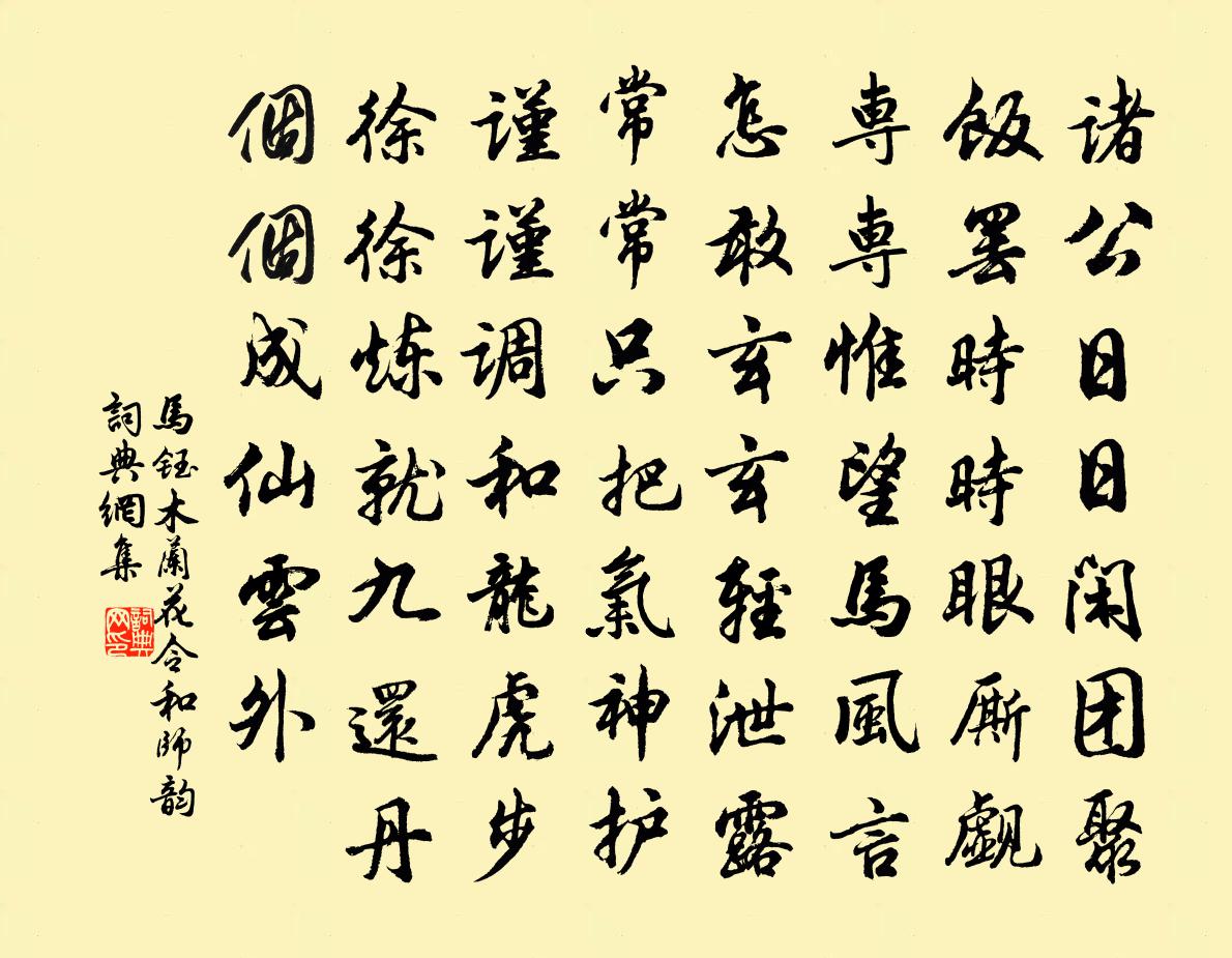 詩詞名句歷史字典書法欣賞書法字典國語詞典說文解字康熙字典古漢語字典標 題 作 者 詩 句 木蘭花令 和師韻作者:馬鈺 朝代:元代木蘭花令 和師韻原文諸公日日閒團聚。飯罷時時眼廝覷。專專惟望馬風言,怎敢玄玄輕泄露。常常只把氣神護。謹謹調和龍虎步。徐徐煉就九還丹,個個成仙雲外詩詞問答問:木蘭花令 和師韻的作者是誰?答:馬鈺問:木蘭花令 和師韻寫於哪個朝代?答:元代問:木蘭花令 和師韻是什麼體裁?答:詞馬鈺木蘭花令 和師韻書法欣賞木蘭花令 和師韻書法作品詩詞推薦題浯溪二首黃社庵〔宋代〕雖扼咽喉□□間,猶□□脈得良醫。□□□平成報按,重讀磨崖□字碑。江上送韋彖先輩杜荀鶴〔唐代〕不易為離抱,江天即見鴻。暮帆何處落,涼月與誰同?木葉新霜後,漁燈夜浪中。時難慎行止,吾道利於窮。晨鏡陸游〔宋代〕晨起覽清鏡,有叟鬢已皤,馘黃色類梔,面皺紋如靴。熟視但驚嘆,初不相誰何;久乃稍醒悟,舉手自摩挲。與汝省試中式記夢於觀文〔宋代〕東堂令史報來時,仙桂雲攀第九枝。乍聽言音猶似夢,卻思公道即無疑。寒門仿佛春將到,幽徑朦朧月漸移。殘漏紀行詩周伯琦〔元代〕東坊尚平地,近嶺晝生寒。拔地數千丈,凌空十八盤。飛泉鳴亂石,危磴護重關。俯視人寰隘,真疑長羽翰。游藍田山卜居白居易〔唐代〕脫置腰下組,擺落心中塵。行歌望山去,意似歸鄉人。朝蹋玉峰下,暮尋藍水濱。擬求幽僻地,安置疏慵身。本性奉寄淮西總領張少卿並呈建康留守章侍郎二首張鎡〔宋代〕湖隱門連草,宗盟肯屢尋。長才明主眷,直道古人心。又引皇華去,誰憐白髮侵。官居兼靜樂,賢帥復朋吟。題李竹隱山齋陳紀〔宋代〕法界人寰共一邱,欲窮遠目更登樓。蒼藤碧蘚樹容晚,涼月好風山意秋。莎徑荒寒聞鶴唳,竹叢搖落見漁舟。一聲劉後溪和雁湖即事詩十絕見示次韻洪咨夔〔宋代〕槿花朝發夕而萎,得失興亡總一機。古往今來磨不盡,人間公是與公非。縣中迎石金山甘靈大士就放生池祈雨早上偕簿虞儔〔宋代〕夜起占星畢,朝趨禮佛龕。擁橋蓮墜粉,縈沼水揉藍。屏翳何須靳,登伽不受參。懸知天欲雨,蟻戰已酣酣。春晚寄楊十二,兼呈趙八(時楊生館於趙氏)元稹〔唐代〕蒙蒙竹樹深,簾牖多清陰。避日坐林影,余花委芳襟。傾尊就殘酌,舒捲續微吟。空際颺高蝶,風中聆素琴。廣庭側犯譚宣子〔宋代〕素秋漸爽,倚香曲枕情依舊。懷袖。浸數尺湘漪、簟紋皺。悲歡盡夢裡,玉骨從消瘦。空又。思太液芙蓉未央柳。秋冬之間鄂渚絕市無蟹今日偶得數枚吐沫相濡黃庭堅〔宋代〕怒目橫行與虎爭,寒沙奔火禍胎成。雖為天上三辰次,未免人間五鼎烹。田家即事八首趙蕃〔宋代〕社鼓村村急,春流岸岸高。雙分待魚鷺,紅認隔溪桃。太師魏國史公輓歌詞陸游〔宋代〕壟乾勞久戍,大將未班師。抗議回天意,忘身為聖時。人心嶮莫測,時事遠難知。汗簡方傳信,孤生欲語誰!羅李嶠〔唐代〕妙舞隨裙動,行歌入扇清。蓮花依帳發,秋月鑒帷明。雲薄衣初卷,蟬飛翼轉輕。若珍三代服,同擅綺紈名。和謝倅見贈生日二首陳傅良〔宋代〕朝天冠佩幾千員,熟數東州未乏賢。若論中原舊文物,蒲輪應合聘高年。句李應春〔宋代〕象繪耆英希五老,鶴歸華表認千年。游大中乾元寺張鎡〔宋代〕突兀前朝寺,維舟又一來。殿空金像暗,徑斷石幢摧。物相依成壞,塵緣漫樂哀。僧殘無悟語,猶幸結宗雷。辛亥孟秋戊子有虹下天繞飛泉山入東谷飲古井文同〔宋代〕長虹落天帔,萬丈截群嶺。蟠身下深谷,俯首飲古井。居人莫之指,況復敢引領。幡然繞空去,雲霧變俄頃。乾坤名句推薦嘆江山如故,千村寥落。岳飛《滿江紅·登黃鶴樓有感》 柳葉開銀鏑,桃花照玉鞍。駱賓王《送鄭少府入遼共賦俠客遠從戎》 宮中彩女顏如花,飄然揮手凌紫霞,從風縱體登鸞車。李白《飛龍引二首·其一》 勢有不可得,事有不可成。韓非及後人《韓非子·觀行》 碧水浩浩雲茫茫,美人不來空斷腸。李白《早春寄王漢陽》 馬不伏歷,不可以趨道;士不素養,不可以重國。班固《漢書·傳·眭兩夏侯京翼李傳》 一去隔絕國,思歸但長嗟。李白《千里思》 一夜雨聲涼到夢,萬荷葉上送秋來。陳文述《夏日雜詩》 燕子巢方就,盆池小,新荷蔽。杜安世《鶴沖天·清明天氣》 少婦今春意,良人昨夜情。沈佺期《雜詩三首·其三》