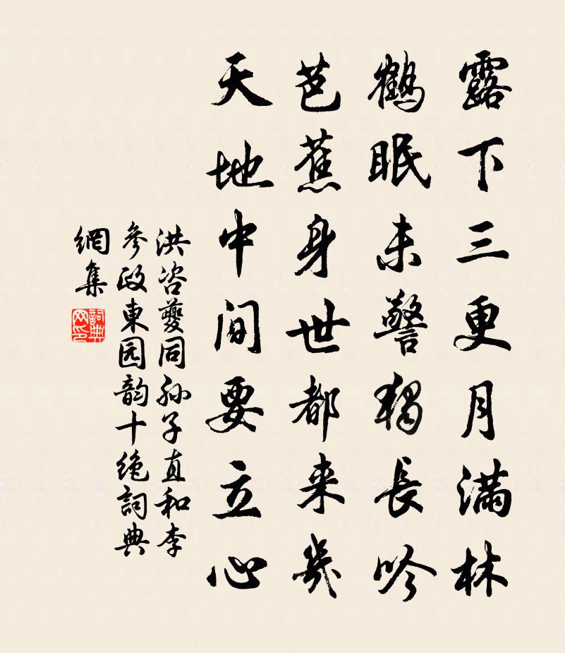 詩詞名句歷史字典書法欣賞書法字典國語詞典說文解字康熙字典古漢語字典標 題 作 者 詩 句 同孫子直和李參政東園韻十絕作者:洪咨夔 朝代:宋代原文露下三更月滿林,鶴眠未警獨長吟。芭蕉身世都來幾,天地中間要立心。詩詞問答問:《同孫子直和李參政東園韻十絕》的作者是誰?答:洪咨夔問:該詩寫於哪個朝代?答:宋代書法欣賞同孫子直和李參政東園韻十絕書法作品詩詞推薦偈頌九十三首釋梵琮〔宋代〕今朝正月半,萬物盡更新。衲僧無一物,何物當殷勤。銀燭高煇天上月,燈花開遍洞中春。用晦翁十梅詩韻酬張伯修孫子直吳泳〔宋代〕為花能工詩,不如賦拙賦。珍重舂陵翁,能尋所樂處。還文雅師書帙梅堯臣〔宋代〕編絕不加新,於今十二春。綠窗重展目,靜幾勿生塵。豈愛吾廬日,終將道者親。莫嫌同刺字,漫滅看難真。郊居言事趙湘〔唐代〕斷徑危橋積蘚痕,閉關終與俗塵分。深秋鶴影臨池見,靜夜棋聲隔水聞。山榻病來誰寄藥,石床僧去獨看雲。閒吟鷓鴣天徐俯〔宋代〕宜笑宜顰掌上身。能歌能舞惡精神。臉邊紅入桃花嫩,眉上青歸柳葉新。嬌不語,易生嗔。尊前還是一番春。深杯賦蔣甥若水番馬圖樓鑰〔宋代〕何處驅來良馬六,騮黃參錯如花簇。胡為不作騰驤去,各有游韁縶前足。胡人下馬俱少休,背倚氈裘眠正熟。酋豪四月五日後圃酴醾芍藥侍郎三花盛開醉呂成三陳著〔宋代〕芍藥圃中央,有花名侍郎。叢叢嬌翠羽,朵朵淡紅妝。鳳閣樣如夢,雞冠班自行。何如付一醉,歲風有春光。和新篁韻衛宗武〔宋代〕竹君清絕潤於玉,譜牒出自淇之澳。移根分種置吾廬,才隔樊牆即家塾。塾之所有無非書,師友摛文剪其蕪。此君孤山梅後顧逢〔宋代〕晴雪白漫漫,山中幾樹殘。但知開處好,誰向落時看。影不隨流水,香猶在曲闌。飛來如靖鶴,相對立前灘。步虛詞十首吳筠〔唐代〕眾仙仰靈范,肅駕朝神宗。金景相照曜,逶迤升太空。七玄已高飛,火煉生珠宮。餘慶逮天壤,平和王道融。八威福帥生朝二首張元乾〔宋代〕玉帳生朝香霧飛,秋風欲到碧梧枝。回思十載折衝地,還鎮八州安靜時。淇澳會須歌綠竹,渭濱猶待獵非羆。止戈最高樓馬子嚴〔宋代〕花解笑,冷淡不求知。長是殿、眾芳時。鮮鮮秀頸磋圓玉,洛陽翠佩剪琉璃。向人前,迎茉莉,送荼。幾欲把、清臨江仙(閨怨)韓淲〔宋代〕脆管繁弦無覓處,小樓空掩遙山。柳絲直下曲闌乾。海棠紅欲褪,玉釧怯春衫。殢酒不成芳信斷,社寒新燕呢喃。和人筍詩李復〔宋代〕葛陂龍去已千年,每見遺孫出是間。未遇嚴霜懷節久,因生平地立身難。長崖氣潤雲藏角,暗谷叢深霧養斑。春晚官柳查慎行〔清代〕種柳河乾比《伐檀》,黃流今已報安瀾。可憐一路青青色,直到淮南總屬官!贈秋浦金明府長杜荀鶴〔唐代〕倚郭難為宰,非君即有私。惟憑野老口,不立政聲碑。苦甚求名日,貧於未選時。溪山竟如此,利得且吟詩。和子進千春院觀桃花二首范祖禹〔宋代〕西度天津水見沙,輕風飛蓋綠楊斜。相逢喜到千春寺,最後方開第一花。富媼英華當閒出,東君照育想非賒。神仙揚州五詠 蜀井〈在大明寺。〉蘇轍〔宋代〕信腳東遊十二年,甘泉香稻憶歸田。行逢蜀井恍如夢,試煮山茶意自便。短綆不收容盥濯,紅泥仍許置清鮮。早知以詩句詠梅幽閒元不為人香方蒙仲〔宋代〕道不為人香,其如人競即。香外更多佳,人亦未易識。柳二首司空圖〔唐代〕誰家按舞傍池塘,已見繁枝嫩眼黃。漫說早梅先得意,不知春力暗分張。似擬凌寒妒早梅,無端弄色傍高台。折來名句推薦大難不死,必有後祿。馮夢龍《喻世明言·卷二十一》 千貫買田,萬貫結鄰。佚名《增廣賢文·下集》 秋草六朝寒,花雨空壇。更無人處一憑闌。朱彝尊《賣花聲·雨花台》 柳柔搖不定,草短綠應難。張惠言《風流子·出關見桃花》 愛棄發之費,而忘長發之利,不知權者也。韓非及後人《韓非子·六反》 不見南師久,謾說北群空。陳亮《水調歌頭·送章德茂大卿使虜》 白毛浮綠水,紅掌撥清波駱賓王《詠鵝》 酷暑天,葵榴發,噴鼻香十里荷花。白樸《得勝樂·夏》 君子必在己者,不必在人者也。呂不韋《呂氏春秋·覽·孝行覽》 野老念牧童,倚杖候荊扉。王維《渭川田家》