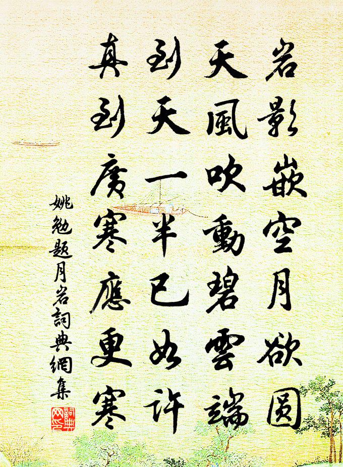 詩詞名句歷史字典書法欣賞書法字典國語詞典說文解字康熙字典古漢語字典標 題 作 者 詩 句 題月岩作者:姚勉 朝代:宋代題月岩原文岩影嵌空月欲圓,天風吹動碧雲端。到天一半已如許,真到廣寒應更寒。詩詞問答問:題月岩的作者是誰?答:姚勉問:題月岩寫於哪個朝代?答:宋代姚勉題月岩書法欣賞題月岩書法作品詩詞推薦寄桃源管明菩陶弼〔宋代〕野鶴孤雲無定蹤,桃花流水合相容。夜來月滿群山閣,知在秦人第幾峰。門下大資顏公輓詩三首李彌遜〔宋代〕洙泗流風遠,儀形世有人。人經窺聖域,三返得賢臣。勳業艱難際,聲名寂寞濱。赤松歸有伴,此道獨知津。敘舊贈江陽宰陸調李白〔唐代〕泰伯讓天下,仲雍揚波濤。清風盪萬古,跡與星辰高。開吳食東溟,陸氏世英髦。多君秉古節,岳立冠人曹。風流再次元韻答幾道王令〔宋代〕塵囂擺落到鴻冥,始見當時遁世英。叢棘敢思丹鳳至,寸筳慚叩巨鐘鳴。須知奔競浮榮路,未若喧傳不朽聲。此道和時升種竹韻郭印〔宋代〕何物比君子,猗猗庭前竹。直節虛心人不顧,高標雅態自殊俗。千畝碧雲雖未有,數竿清風也自足。興來尋訪不知元旦與可大江行丘葵〔宋代〕日出潮回生紫煙,水光春色弄春妍。底須椒柏來為頌,且與鷗鳧敘隔年。風動微波靴面皺,苔粘枯石佛頭圓。老來游羅漢院途中口占李處權〔宋代〕休論至後日相催,乘興籃輿到嶺隈。風竹盡搖花玉玦,雲山渾作爛銀堆。須知此日逢僧話,不減當年訪戴回。更喜失調名佚名〔宋代〕愁厭厭、脈脈上心誰消遣。楚王廟王洋〔宋代〕提封猶是古方隅,廟食何慚百世餘。醴酒不陳賓客去,於今遺俗重詩書。南澗韓元吉〔宋代〕秋風何時來,午暑忽已散。娟娟木犀花,弄蕊亦璀璨。清香不自惜,擁鼻得奇觀。古來達道人,至樂在山澗。藝蘭春霽薛能〔唐代〕久客孤舟上,天涯漱曉津。野芳榿似柳,江霽雪和春。吏叫能驚鷺,官粗實害身。何當窮蜀境,卻憶滯遊人。寄郭伯瞻劉過〔宋代〕聖門力學錢公輔,盛世能書蔡伯喈。出處有時安義命,笑談無我見襟懷。桂花香滿山堂鬧,秋氣清連石洞偕。只好次程岳州廷邁春行昨訪天梯佛龕今約烏奴洪咨夔〔宋代〕汗血嘶風草正青,眼中萬馬斂春坰。檄書縱不煩師魯,薦藁猶當出古靈。杜若扶疏明遠渚,荼蘼猗靡馥中庭。天梯杜叔高秀才雨雪中相過留一宿而別口誦此詩送陸游〔宋代〕久客方知行路難,關山無際水漫漫。風吹欲倒孤城遠,雪落如簁野寺寒。暮挈衣囊投土室,晨沽村酒掛驢鞍。文章次韻真歇和尚圓覺經頌一十四首普眼菩薩章釋正覺〔宋代〕誰從普眼道場來,天帝堂前珠網開。徹底光明成一段,箇中清淨絕纖埃。交羅理事真空觀,照破根塵不夜台。恰恰浣溪沙 重九日王哲〔元代〕金虎咆哮金馬傳。金公重九撒金錢。金風過處舞金鈿。金地遍成金*泛。金音折得步金蓮。金盤裡面獻金仙。寄題滁州醉翁亭梅堯臣〔宋代〕琅琊谷口泉,分流漾山翠。使君愛泉清,每來泉上醉。醉纓濯潺湲,醉吟異憔悴。日暮使君歸,野老紛紛至。但留江月亭會飲次袁主管韻惱吳鈐轄項安世〔宋代〕日西移幕看澄江,夜久回屏護燭光。暗裡微吟認漁火,醉中時醒為荷香。狂翻鸚鵡杯心綠,怒索蒲萄架底涼。苦恨孤松陶夢桂〔宋代〕傲睨風霜老更臞,旁邊著我未為孤。向來無亮盤桓後,試問曾逢我輩無。相公新創雲山觀於州治之東詩以頌之張榘〔宋代〕華榱勝概實相兼,卻笑滕王詫棟簾。海內一雲高出岫,江南列嶂杳平檐。作霖錫命宜爰立,維石興歌正具瞻。寰宇名句推薦綠波春浪滿前陂,極目連雲稏肥。韋莊《稻田》 窮猿投林,豈暇擇木!房玄齡《晉書·列傳·第六十二章》 水來土掩,兵到將迎。施耐庵《水滸傳·第二十回》 善作者,不必善成;善始者,不必善終。劉向《戰國策·燕二·昌國君樂毅為燕昭王合五國之兵而攻齊》 漉我新熟酒,只雞招近局。陶淵明《歸園田居·其五》 從善如登,從惡如崩司馬光《資治通鑑·魏紀·魏紀三》 從臣皆半醉,天子正無愁。李商隱《陳後宮》 歷冰霜、不變好風姿,溫如玉。陸容《滿江紅·詠竹》 綺席象床寒玉枕,美人何處醉黃花。汪元量《望江南·幽州九日》 人情已厭南中苦,鴻雁那從北地來。王勃《蜀中九日 / 九日登高》