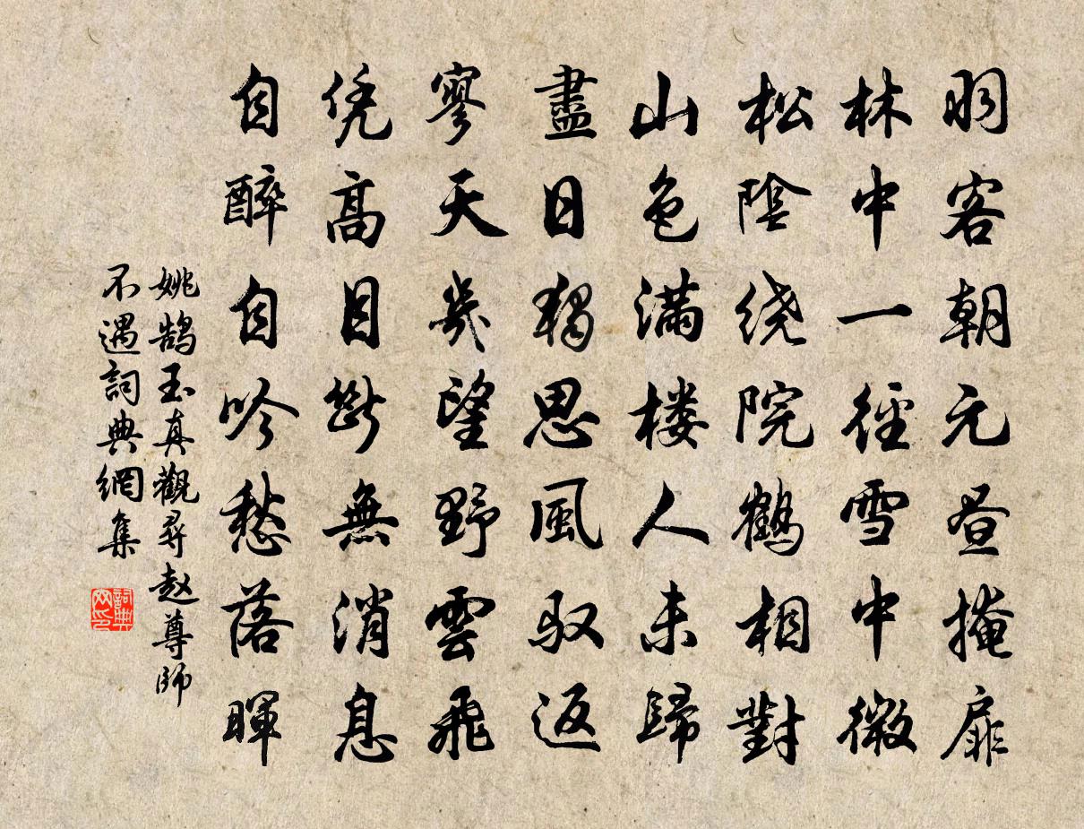 詩詞名句歷史字典書法欣賞書法字典國語詞典說文解字康熙字典古漢語字典標 題 作 者 詩 句 玉真觀尋趙尊師不遇作者:姚鵠 朝代:唐代玉真觀尋趙尊師不遇原文羽客朝元晝掩扉,林中一徑雪中微。松陰繞院鶴相對,山色滿樓人未歸。盡日獨思風馭返,寥天幾望野雲飛。憑高目斷無訊息,自醉自吟愁落暉。詩詞問答問:玉真觀尋趙尊師不遇的作者是誰?答:姚鵠問:玉真觀尋趙尊師不遇寫於哪個朝代?答:唐代問:玉真觀尋趙尊師不遇是什麼體裁?答:七律姚鵠玉真觀尋趙尊師不遇書法欣賞玉真觀尋趙尊師不遇書法作品注釋全唐詩:卷553-25詩詞推薦秋懷十首陳師道〔宋代〕採薪墟墓間,行歌當歸耕。向來輕薄子,懷諼以為榮。喘喘轅下犢,力盡官泥深。壯哉八百里,一割探其心。琴曲歌辭昭君怨二首張祜〔唐代〕萬裡邊城遠,千山行路難。舉頭惟見月,何處是長安。漢庭無大議,戎虜幾先和。莫羨傾城色,昭君恨最多。秋夜吟寄左偃李中〔唐代〕與君詩興素來狂,況入清秋夜景長。溪閣共誰看好月,莎階應獨聽寒螿。卷中新句誠堪喜,身外浮名不足忙。會約文德初聞車駕東遊吳融〔唐代〕龍旆叢叢下劍門,還將瑞氣入中原。鰲頭一盪山雖沒,烏足重安日不昏。晉客已知周禮在,秦人仍喜漢官存。自憐贈率子連三首王祜〔宋代〕心意逍遙物莫知,山中山下識人稀。想君絕慮離塵土,不是王喬即令威。答葉司理趙師秀〔宋代〕寂寞坐高齋,兵來與訊偕。喜看君字畫,癯似我形骸。頗欲徵陳作,遙知動遠懷。夢魂思一遇,風雨暗長淮。中秋無月范成大〔宋代〕兒女無悰坐客稀,今年孤負隔年期。誰從天上牢遮月,不管人間大欠詩。送李杍黟縣方回〔宋代〕黟縣小桃川,年來異昔年。民間何所苦,兵後最堪憐。石墨湮深井,秋坑斸廢田}。喜聞新令尹,清白有家傳。醉蓬萊趙長卿〔宋代〕正金風無露。玉宇生涼,楚郊無暑。催起行人,恰槐黃時序。萬里晴宵,幾人爭睹,快鵬摶一舉。明月圓時,素秋菩薩蠻舒亶〔宋代〕杜鵑啼破江南月。香風撲面吹紅雪。賦就縷金箋。黃昏醉上船。年華爽短鬢。事往情何盡。明日各天涯。來春空好和彥猷在華亭賦十題依韻崑山韓維〔宋代〕晉衰士不競,識者逃其名。陸生起江湖,文藻振英聲。遂令昆丘號,長配山不傾。君看玉就毀,孰與樗全生。湖西雜感詩釋智圓〔宋代〕福善禍淫言可信,吉凶由己語堪陳。乖仁背義都無恥,只記臨行揀日辰。送陳靖中舍歸武陵王安石〔宋代〕知君欲上武陵溪,水自東流人自西。到日桃花應已謝,想君應不為花迷。泊舟永城寄京都朋游賀鑄〔宋代〕正西千里是青門,橋下春流帶雨渾。想見舊遊芳草合,有誰樓上與銷魂。水調歌頭(和吳允成游靈洞韻)陳亮〔宋代〕人愛新來景,龍認舊時湫。不論三伏,小住便覺凜生秋。我自醉眠其上,任是水流其下,湍激若為收。世事如斯去送張明遠歸丹陽金君卿〔宋代〕此行非遠行,何用慘離顏。縱棹豀亭外,清歌樽酒間。相期在西笑,從此望南還。歸去重回首,夕陽江外山。廣州段功曹到得楊五長史譚書功曹卻歸聊寄此詩杜甫〔唐代〕衛青開幕府,楊仆將樓船。漢節梅花外,春城海水邊。銅梁書遠及,珠浦使將旋。貧病他鄉老,煩君萬里傳。僧檐前獨竹詠劉言史〔唐代〕亂石田中寄孤本,亭亭不住凌虛引。欲以袈裟拂著來,一邊碧玉無輕粉。甘窮戴復古〔宋代〕自甘寂寞坐詩窮,何取多牛積穀翁。痛飲不孤連夜月,浮生禁得幾秋風。芙蓉媚日紅相對,螃蟹著霜黃在中。白盡與阮德如詩嵇康〔兩漢〕含哀還舊廬。感切傷心肝。良時遘吾子。談慰臭如蘭。疇昔恨不早。既面侔舊歡。不悟卒永離。念隔增憂嘆。事故名句推薦大道如青天,我獨不得出。李白《行路難三首》 過份求福,適以速禍;安分遠禍,將自得福。陳繼儒《小窗幽記·集靈篇》 夫禮之初,始諸飲食戴聖《禮記·禮運》 帳底吹笙香吐麝,更無一點塵隨馬。蘇軾《蝶戀花·密州上元》 悔既往之失,亦要防將來之非。洪應明《菜根譚·概論》 怯於邑斗,而勇於寇戰。商鞅《商君書·戰法》 寂寂竟何待,朝朝空自歸。孟浩然《留別王侍御維 / 留別王維》 淚彈不盡臨窗滴。就硯旋研墨。晏幾道《思遠人·紅葉黃花秋意晚》 海風吹不斷,江月照還空。李白《望廬山瀑布水二首》 臨水一長嘯,忽思十年初。白居易《垂釣》