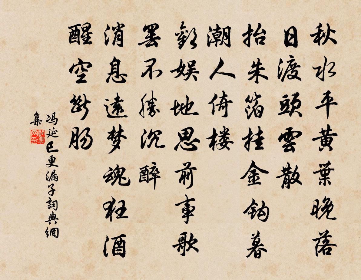 秋水平,黃葉晚,落日渡頭雲散。抬朱箔,掛金鉤,暮潮人倚樓。